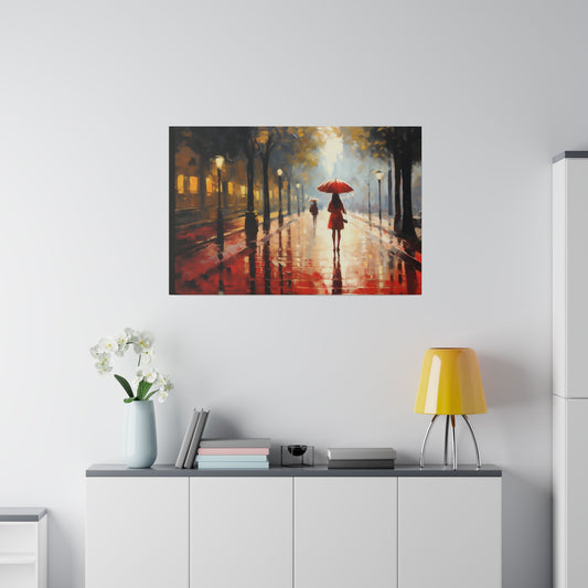 London at night in the rain with a Red Umbrella | Stretched Canvas Print