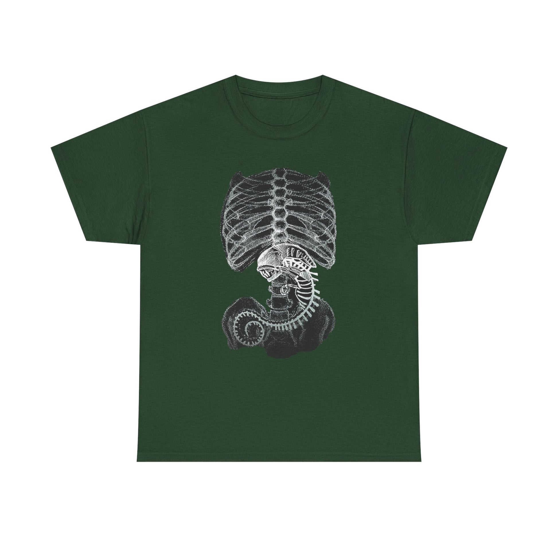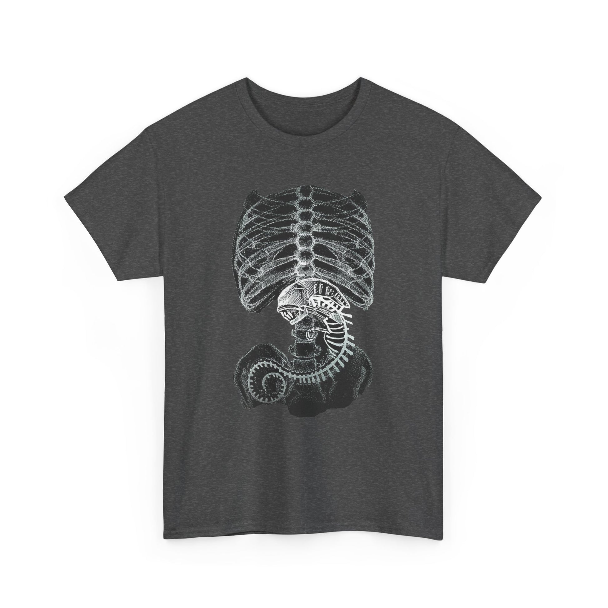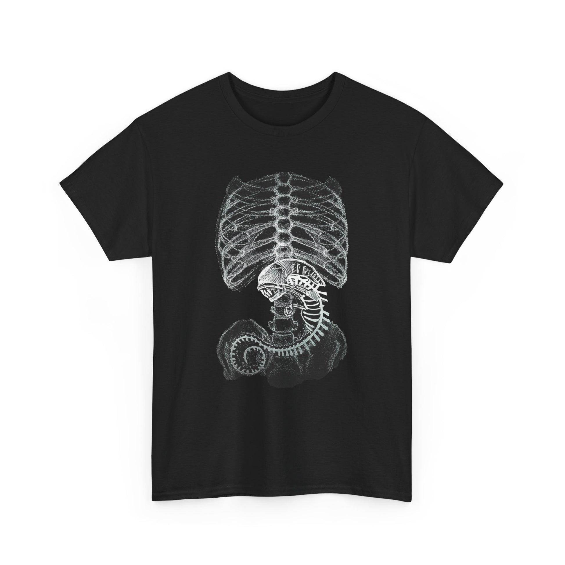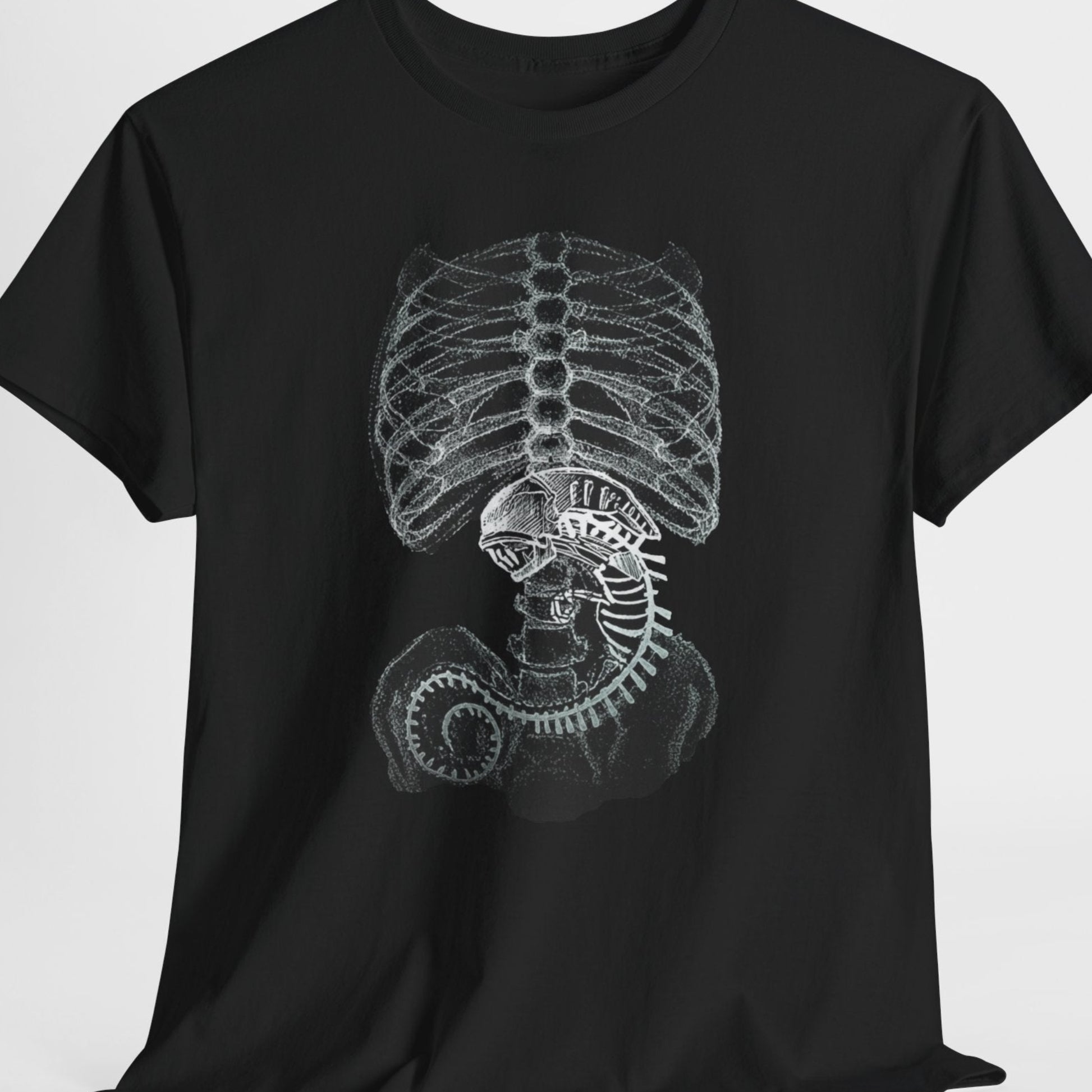 A sci-fi t-shirt featuring an alien creature rendered in x-ray style, inspired by retro space horror and biomechanical design.