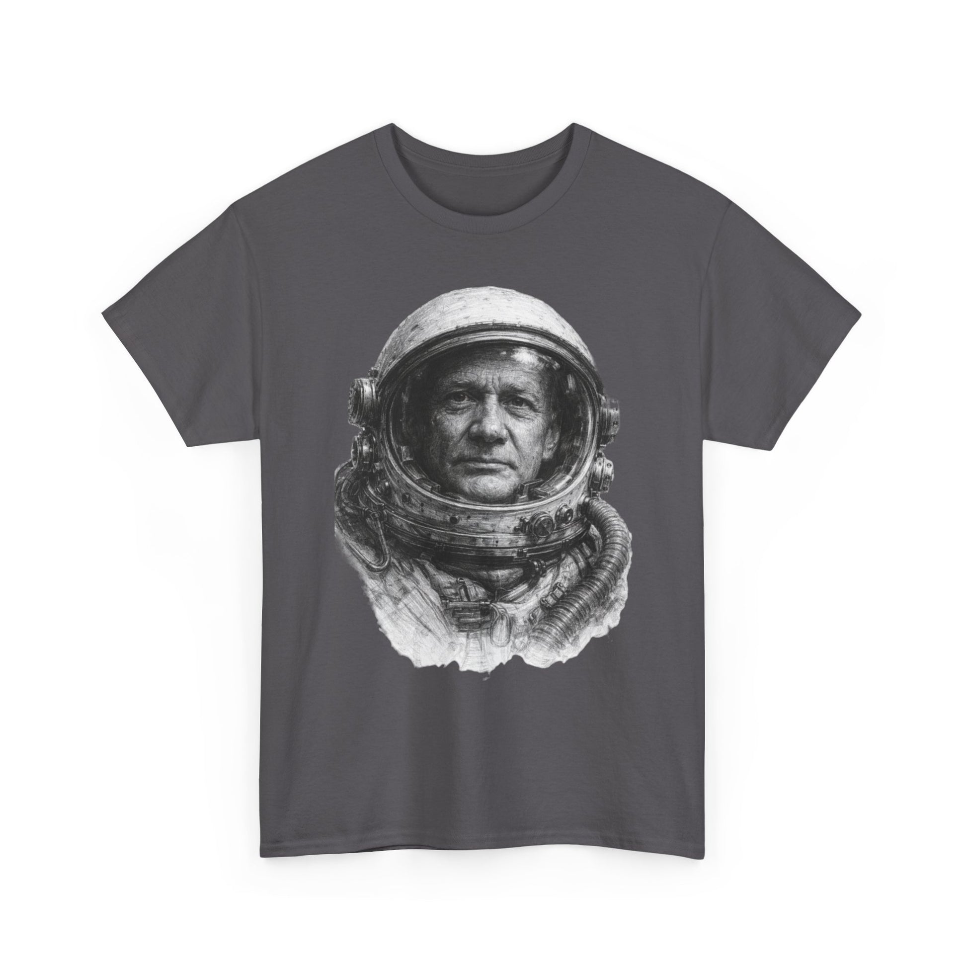 A vintage-style t-shirt featuring an astronaut helmet reflection inspired by classic space exploration photography and retro sci-fi art.