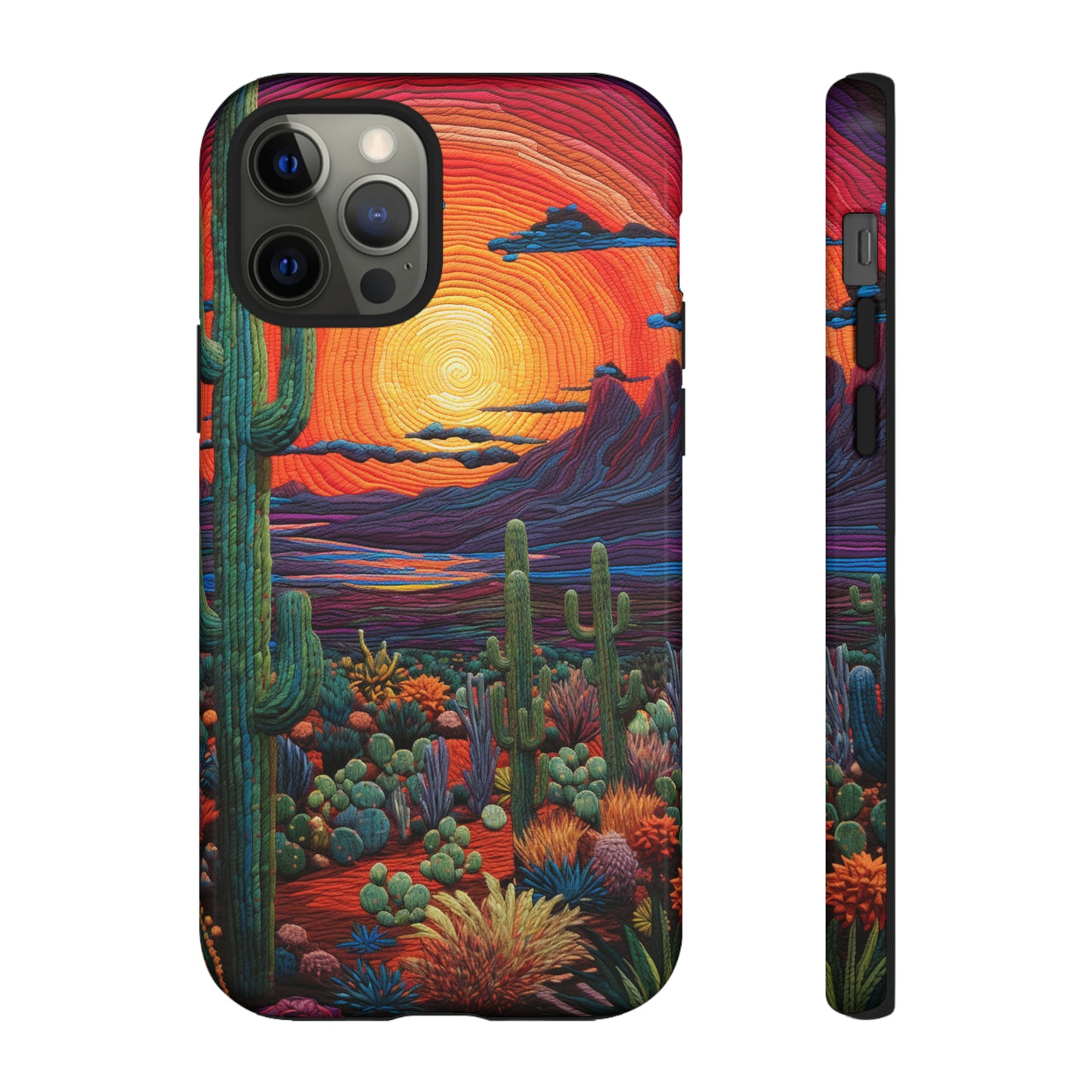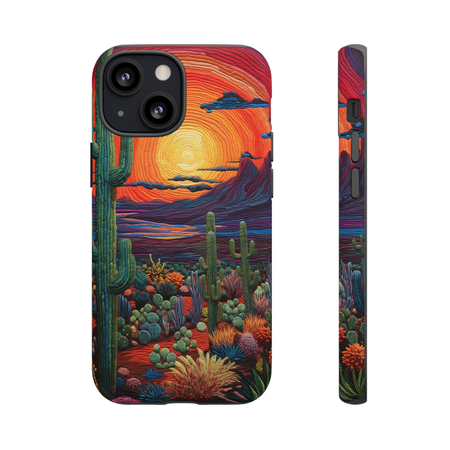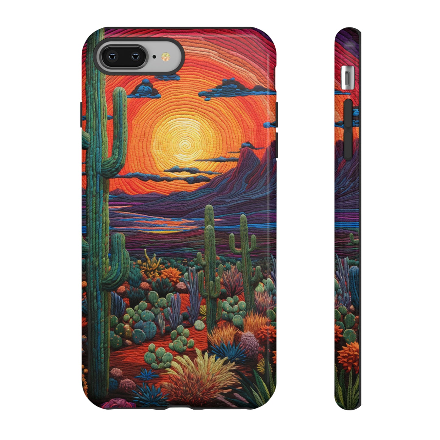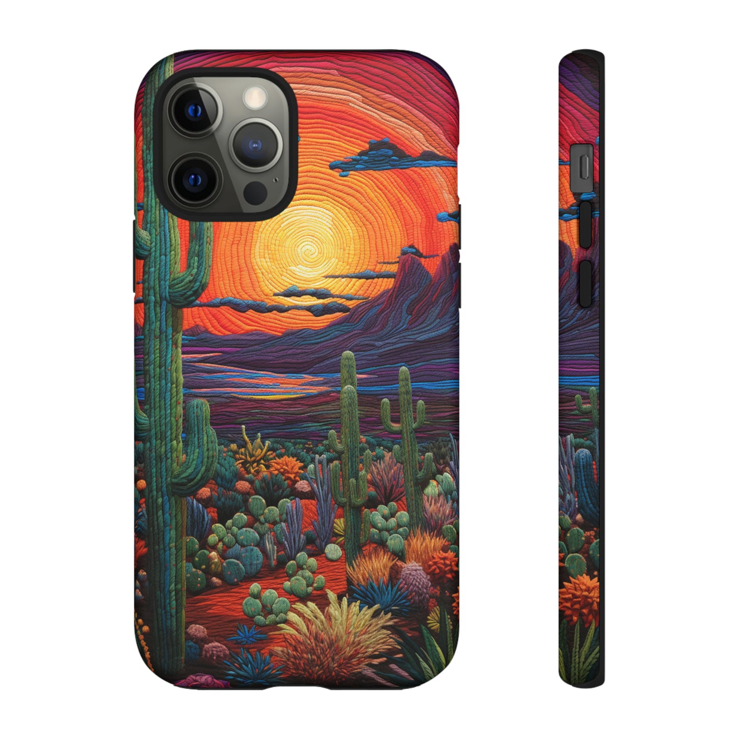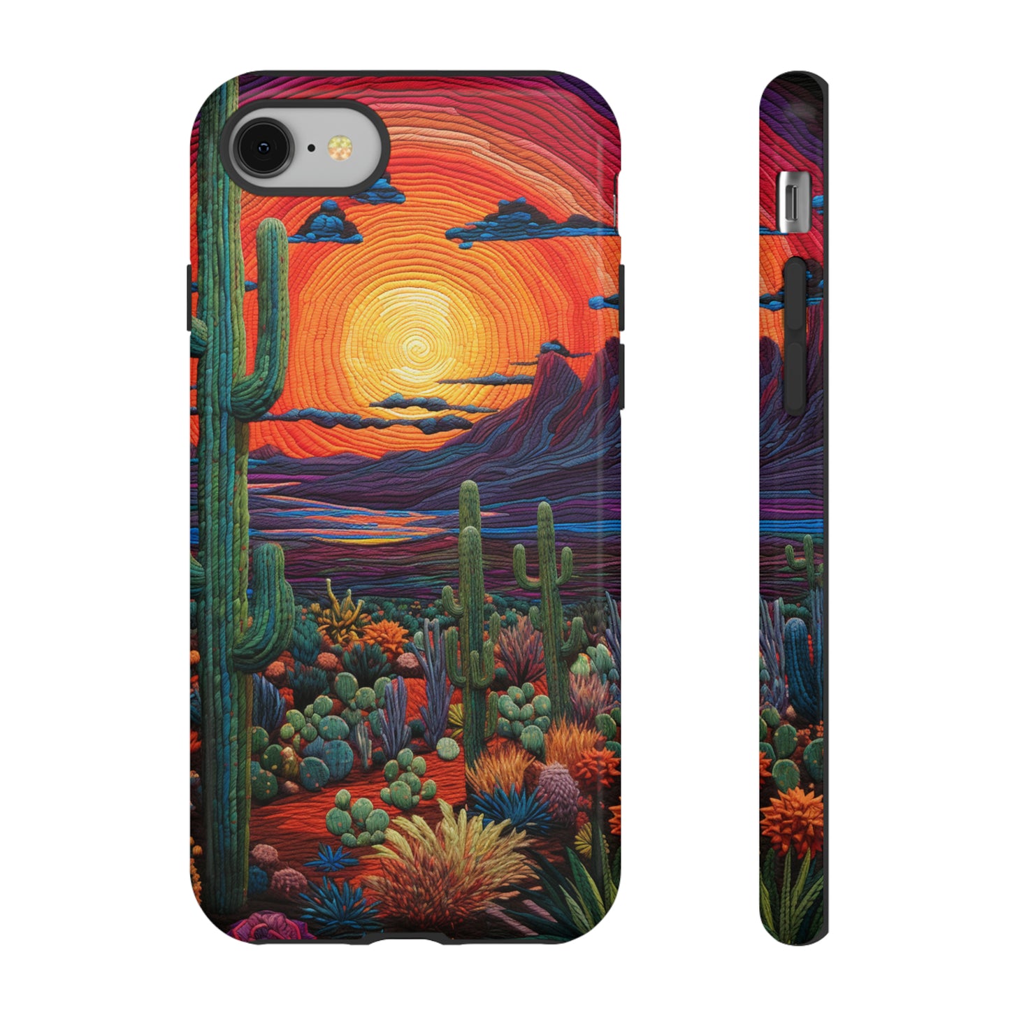 Capture the essence of the Southwest with our Cactus Desert Sunset iPhone Case, available in an exquisite embroidery style design. This unique case is compatible with a range of iPhone models including the iPhone 15, 15 Plus, 12 Mini, XR, XS Max, 8, and 7. Featuring a serene desert scene with cacti silhouetted against a stunning sunset, it embodies the spirit of Arizona's landscapes. Perfect for wanderlust enthusiasts and those who love the rugged beauty of the desert, this case not only adds a touch of Southwest charm to your device but also provides durable protection.