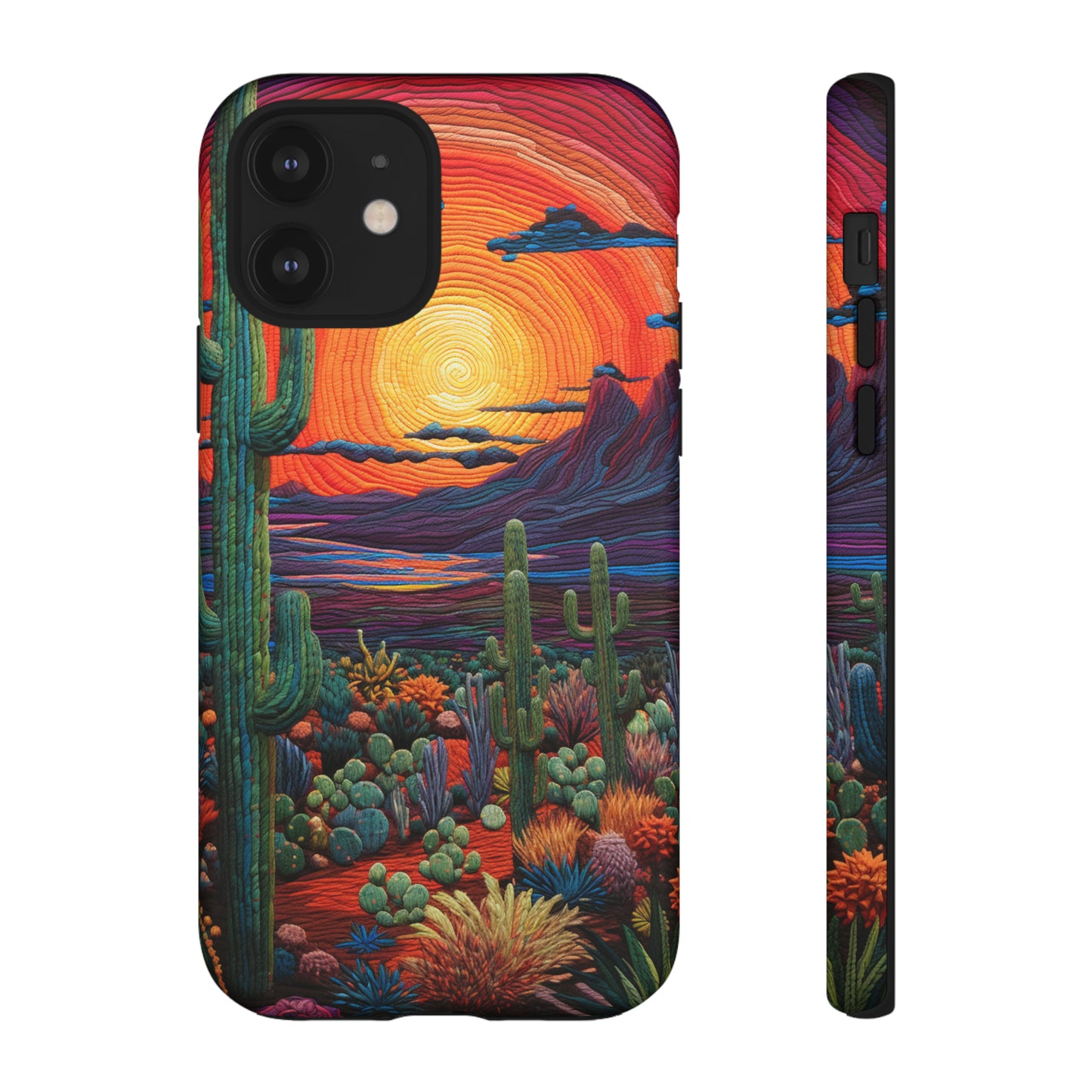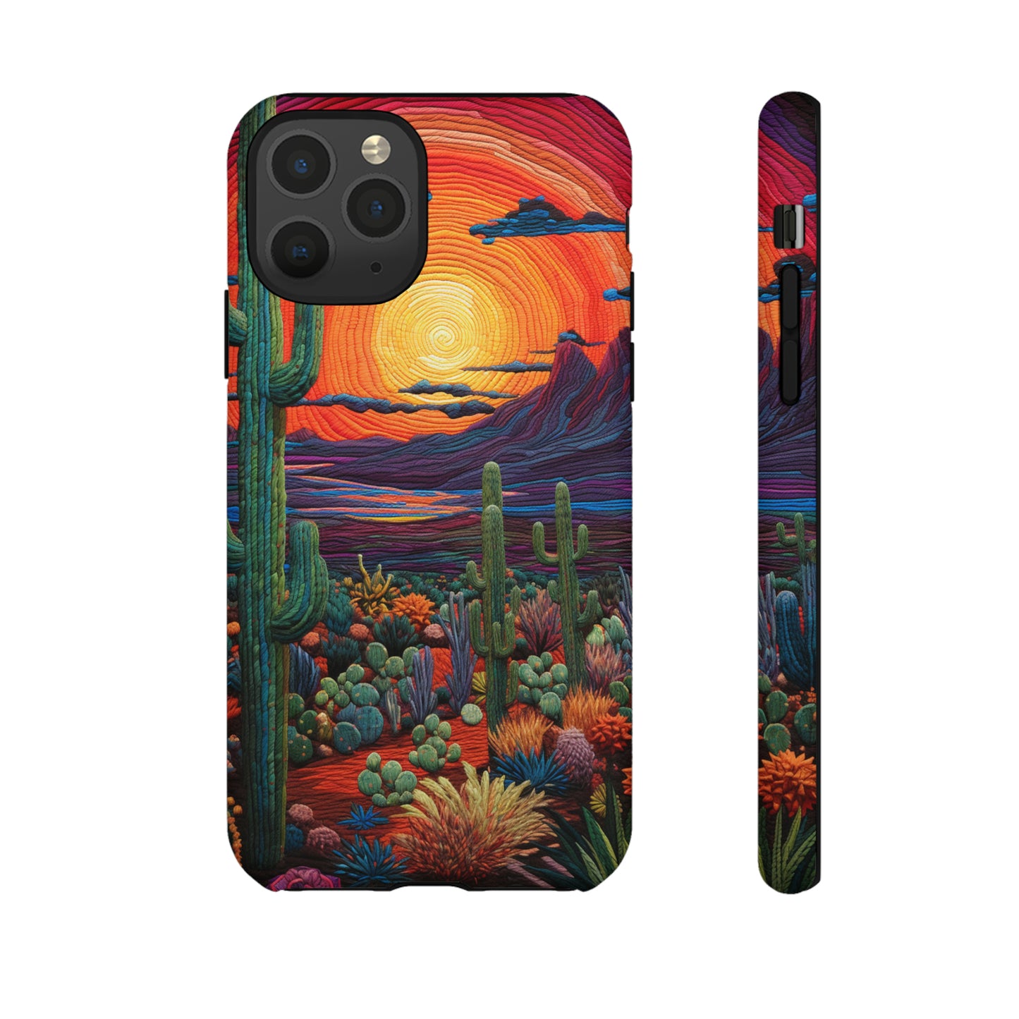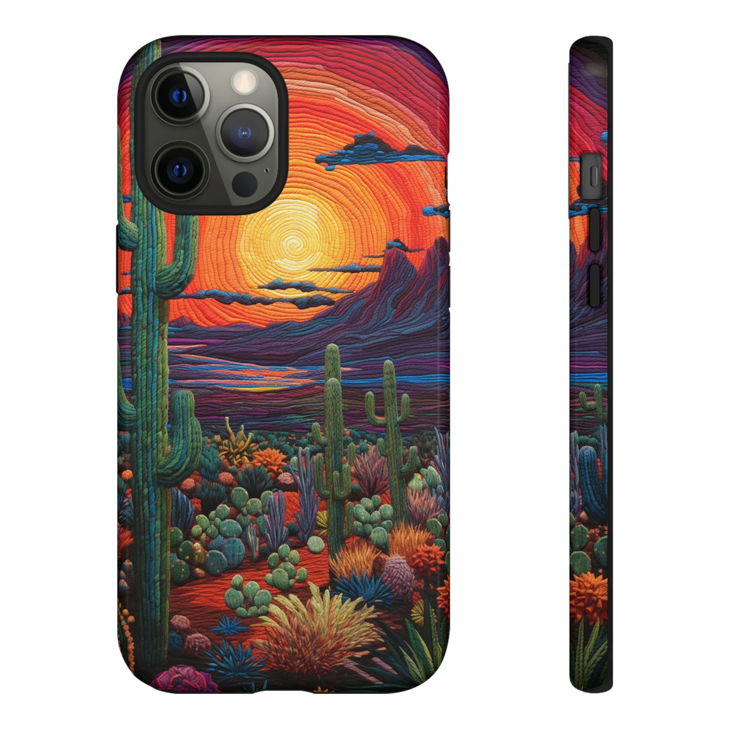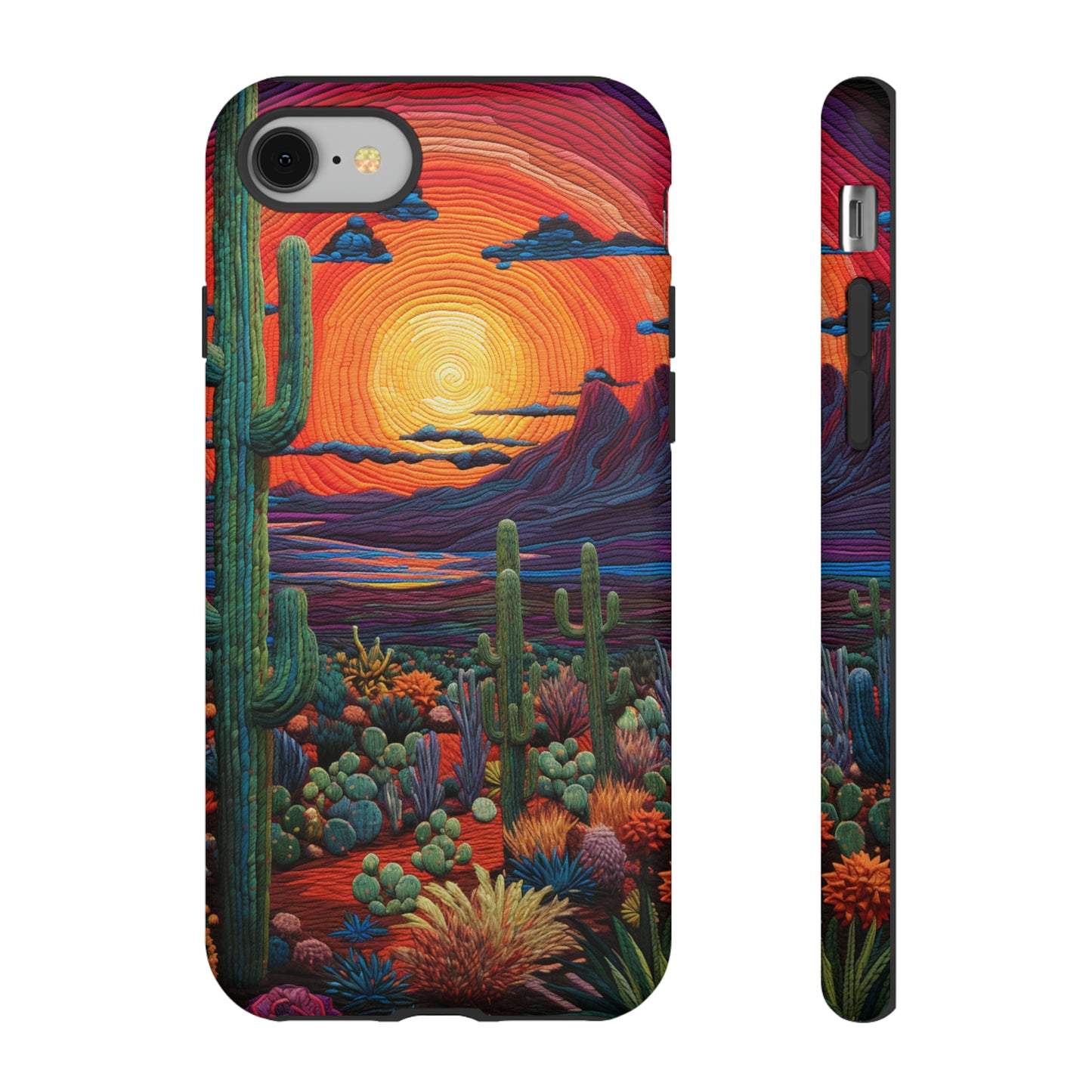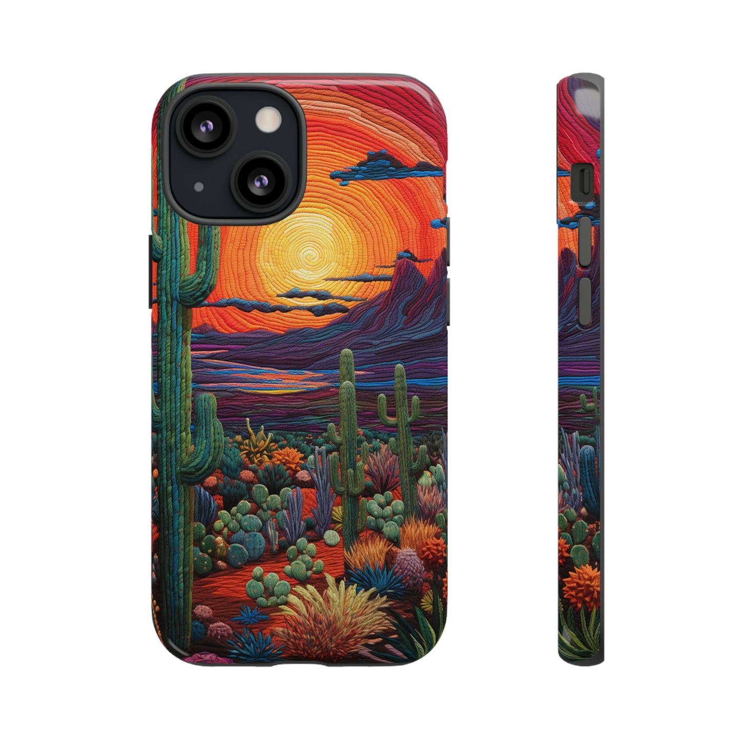 Capture the essence of the Southwest with our Cactus Desert Sunset iPhone Case, available in an exquisite embroidery style design. This unique case is compatible with a range of iPhone models including the iPhone 15, 15 Plus, 12 Mini, XR, XS Max, 8, and 7. Featuring a serene desert scene with cacti silhouetted against a stunning sunset, it embodies the spirit of Arizona's landscapes. Perfect for wanderlust enthusiasts and those who love the rugged beauty of the desert, this case not only adds a touch of Southwest charm to your device but also provides durable protection.