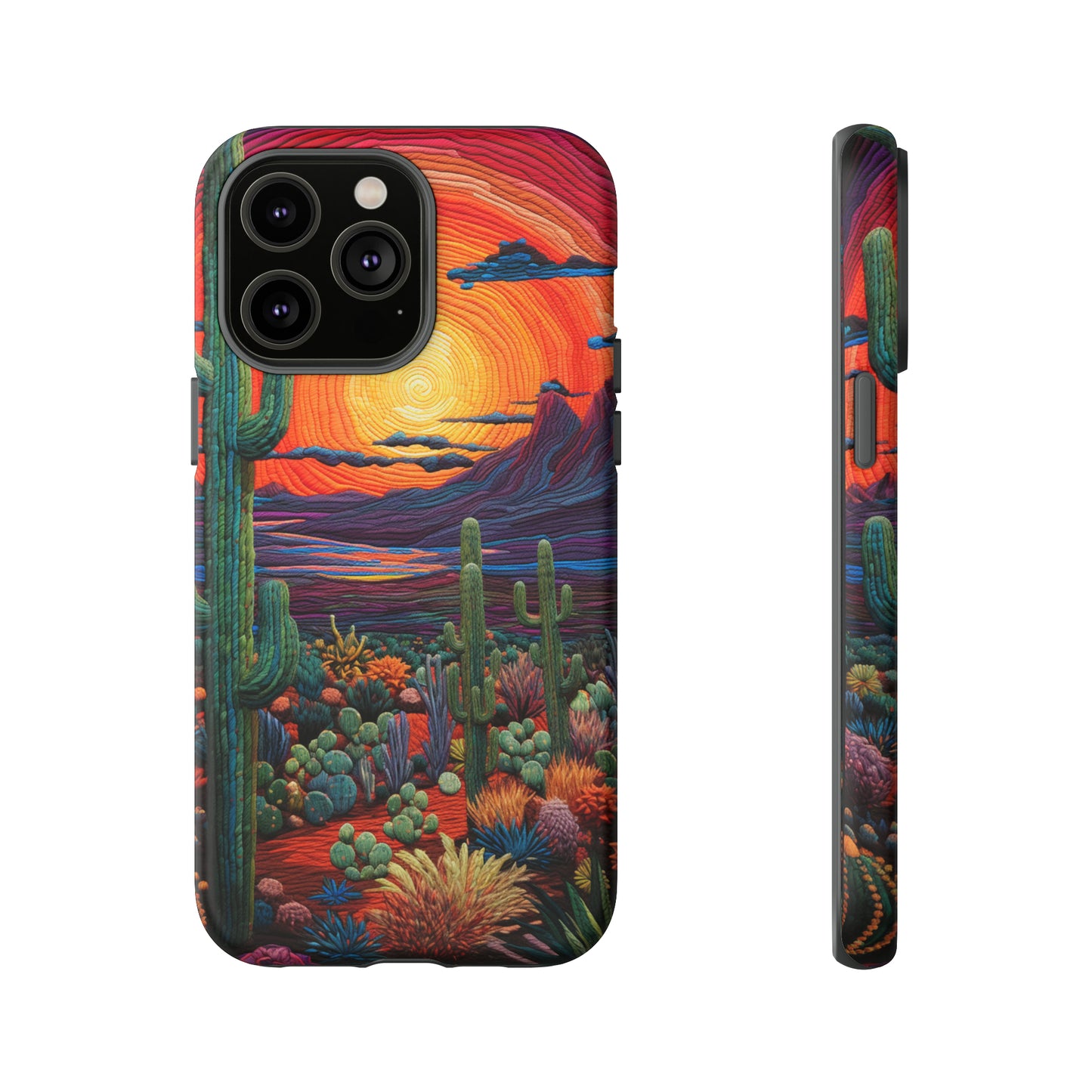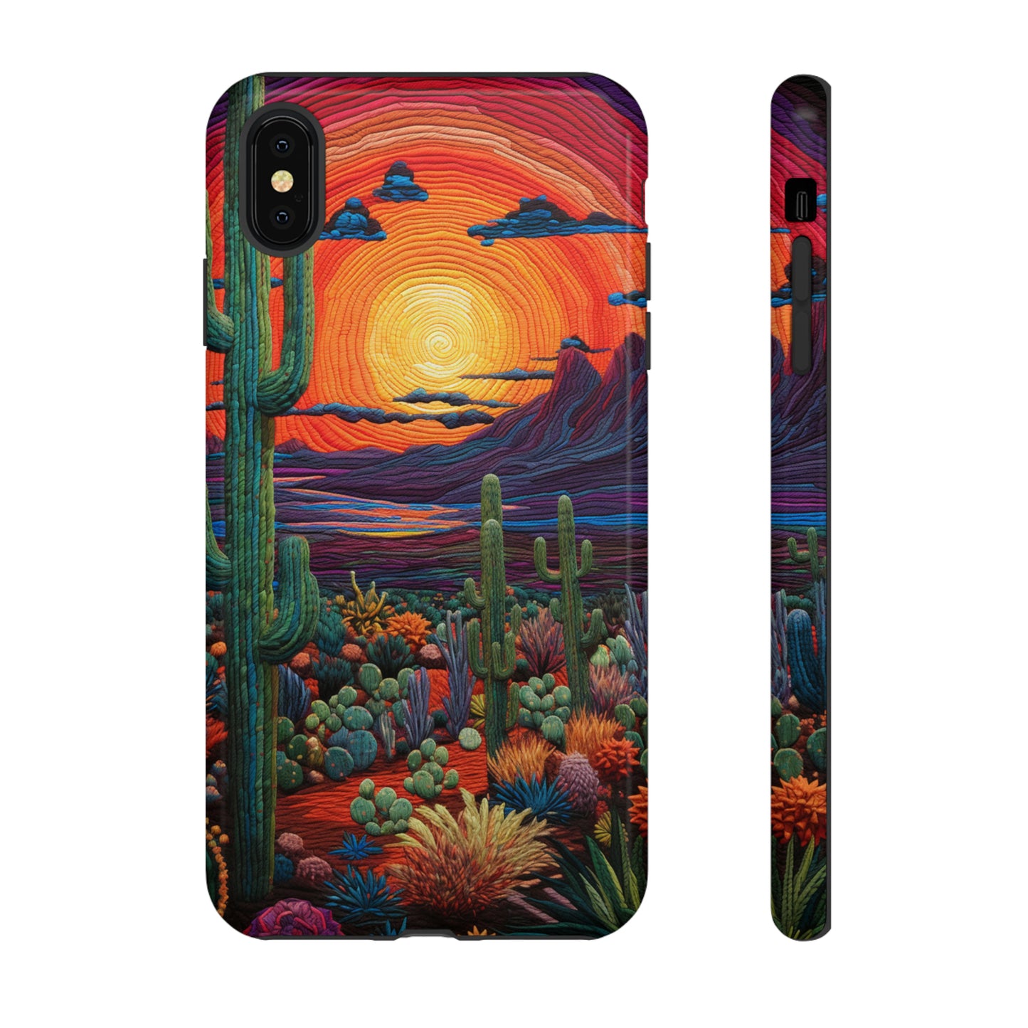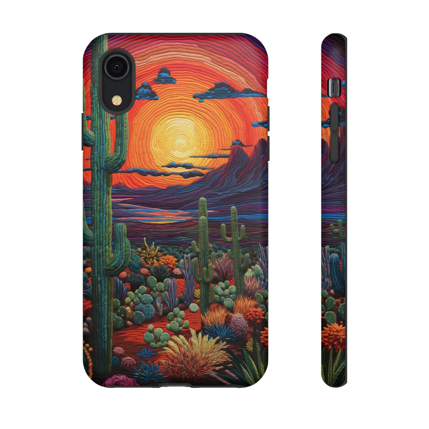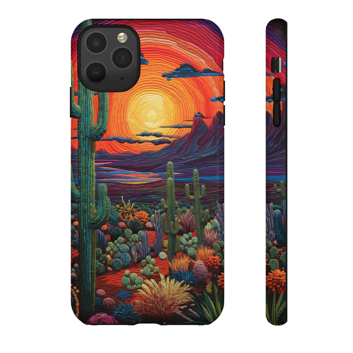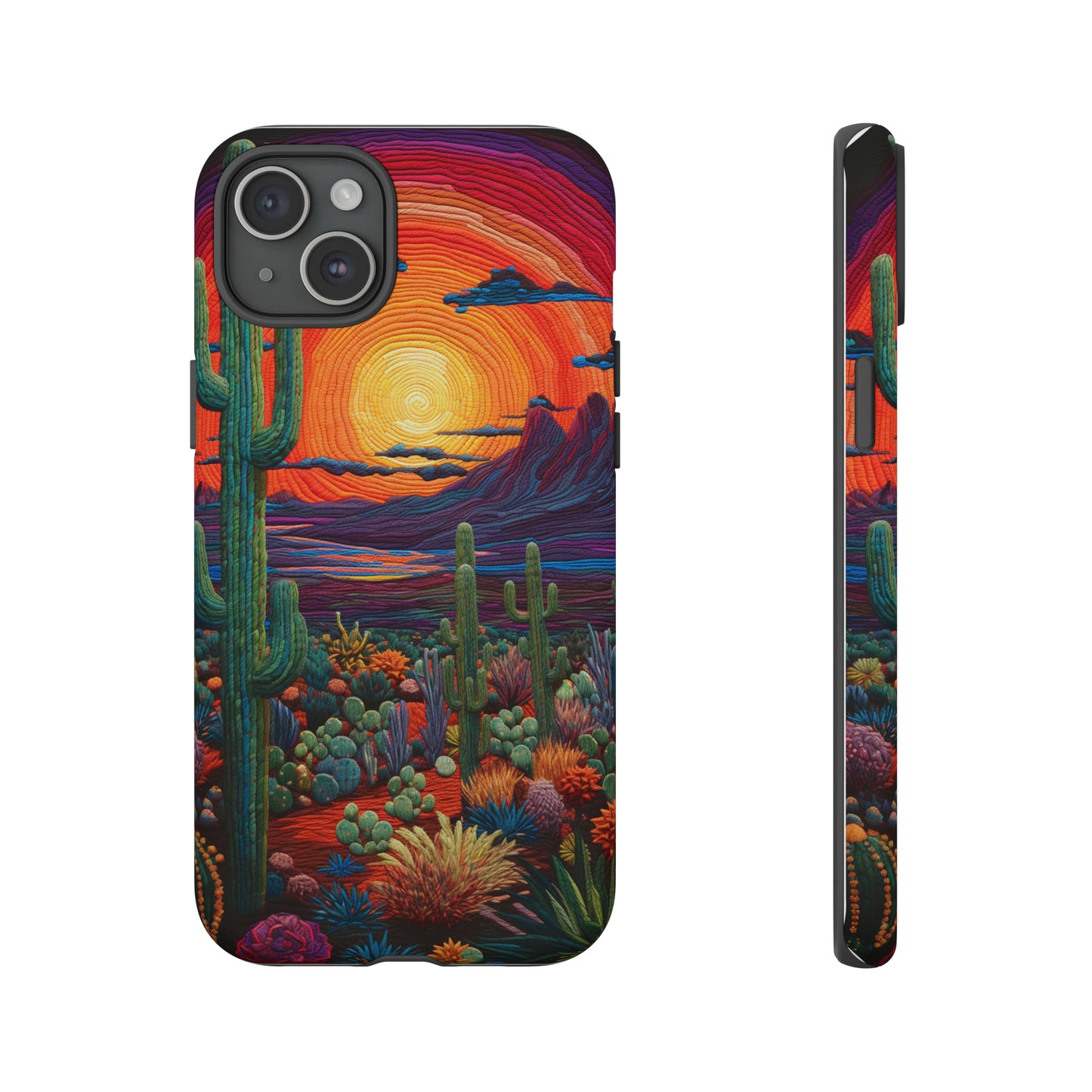 Capture the essence of the Southwest with our Cactus Desert Sunset iPhone Case, available in an exquisite embroidery style design. This unique case is compatible with a range of iPhone models including the iPhone 15, 15 Plus, 12 Mini, XR, XS Max, 8, and 7. Featuring a serene desert scene with cacti silhouetted against a stunning sunset, it embodies the spirit of Arizona's landscapes. Perfect for wanderlust enthusiasts and those who love the rugged beauty of the desert, this case not only adds a touch of Southwest charm to your device but also provides durable protection.