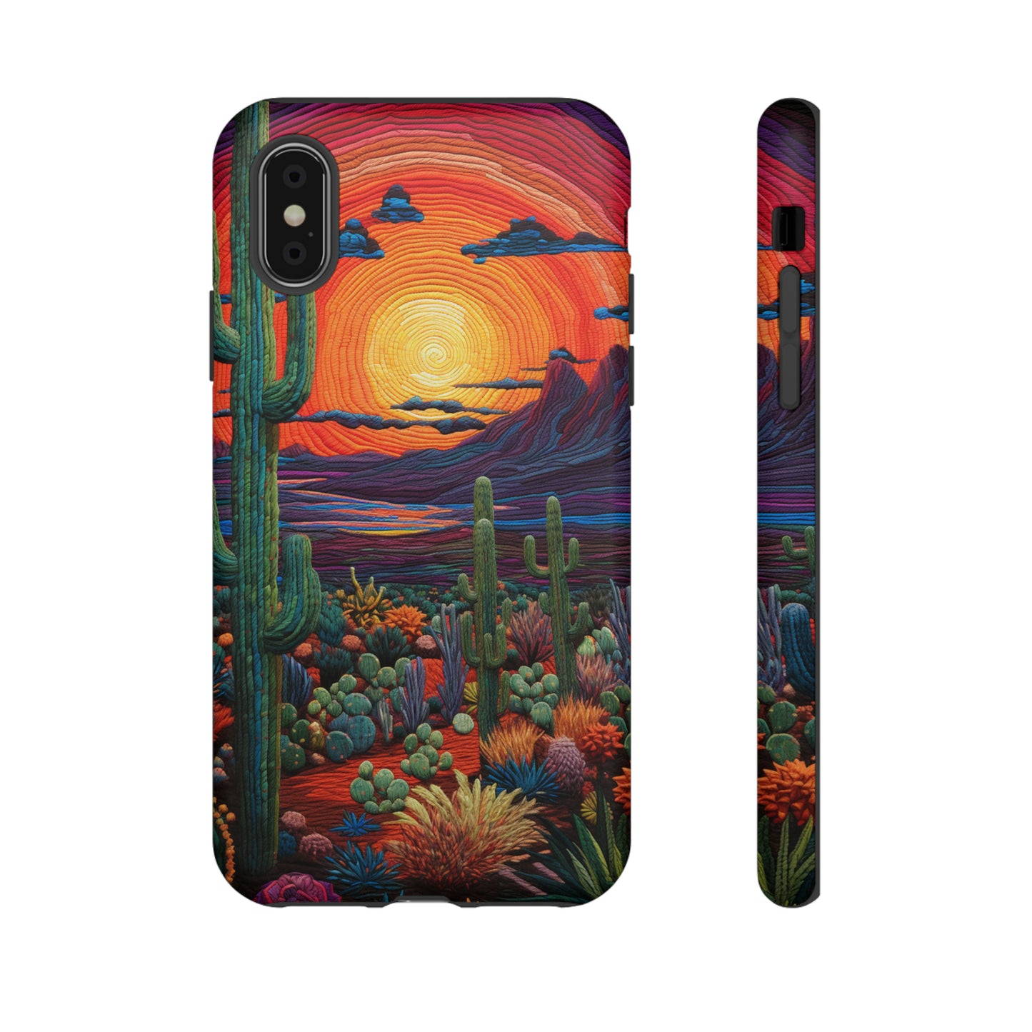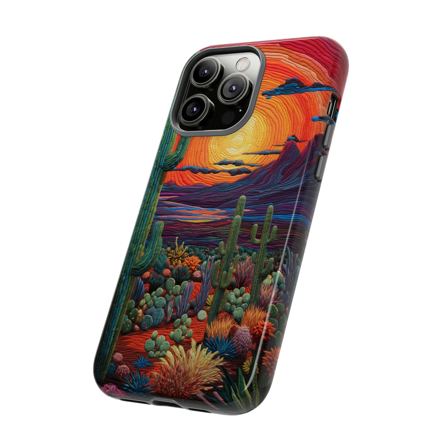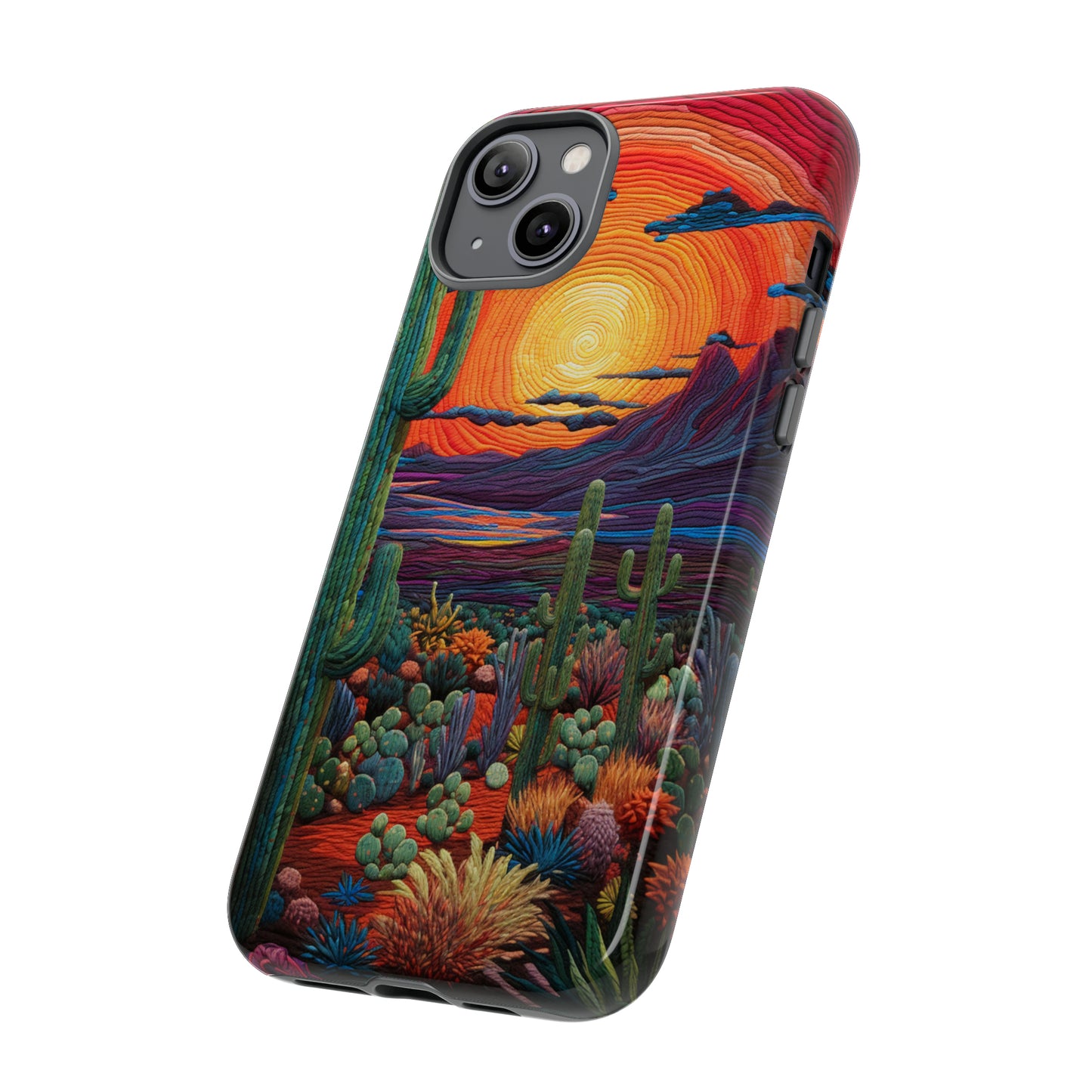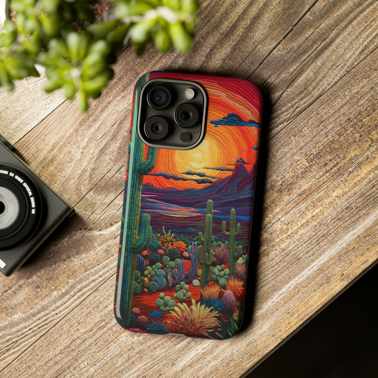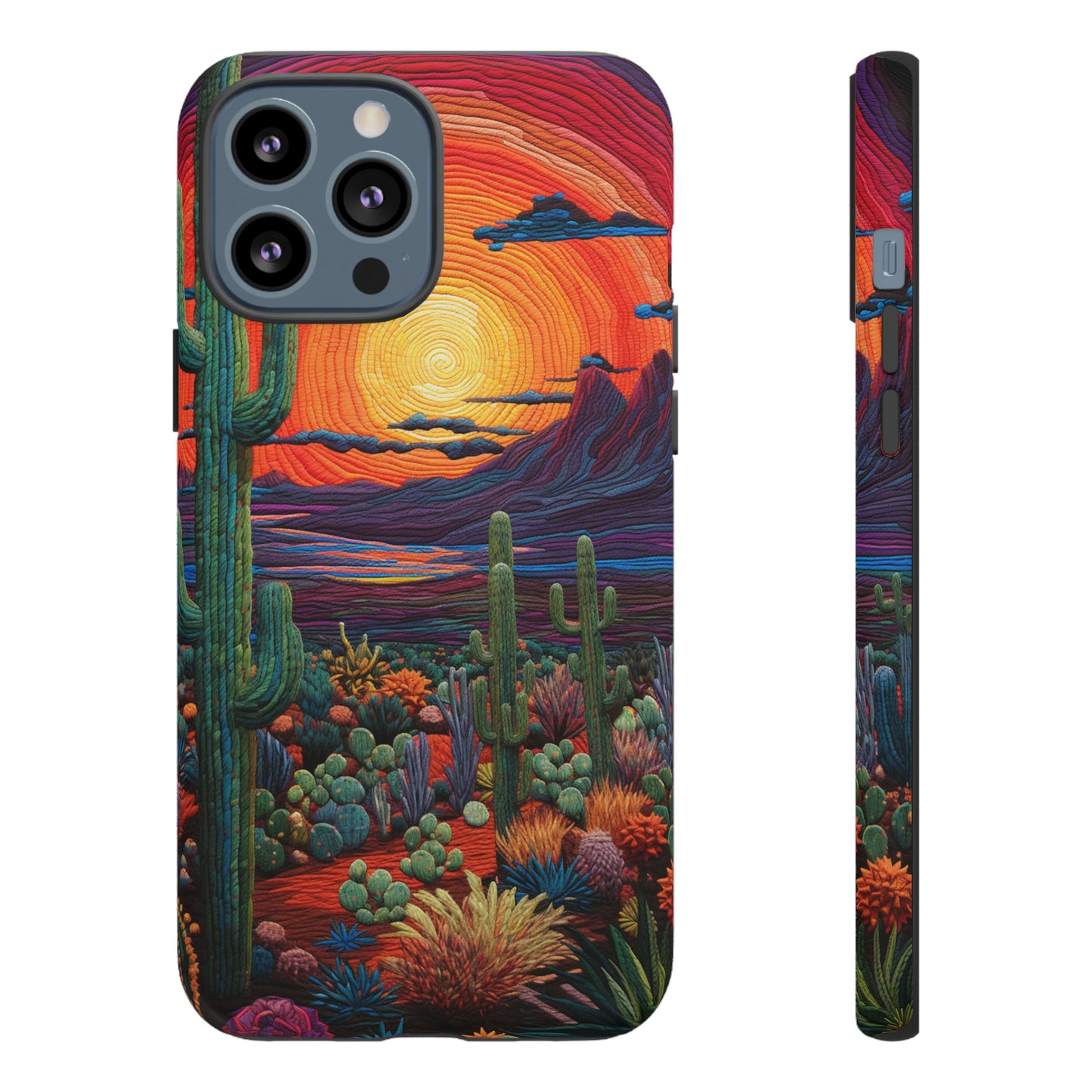 Capture the essence of the Southwest with our Cactus Desert Sunset iPhone Case, available in an exquisite embroidery style design. This unique case is compatible with a range of iPhone models including the iPhone 15, 15 Plus, 12 Mini, XR, XS Max, 8, and 7. Featuring a serene desert scene with cacti silhouetted against a stunning sunset, it embodies the spirit of Arizona's landscapes. Perfect for wanderlust enthusiasts and those who love the rugged beauty of the desert, this case not only adds a touch of Southwest charm to your device but also provides durable protection.