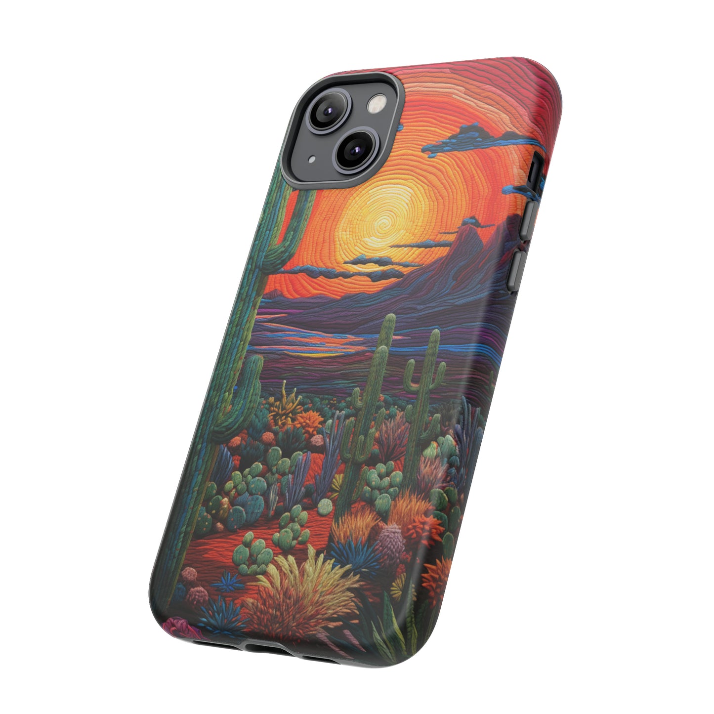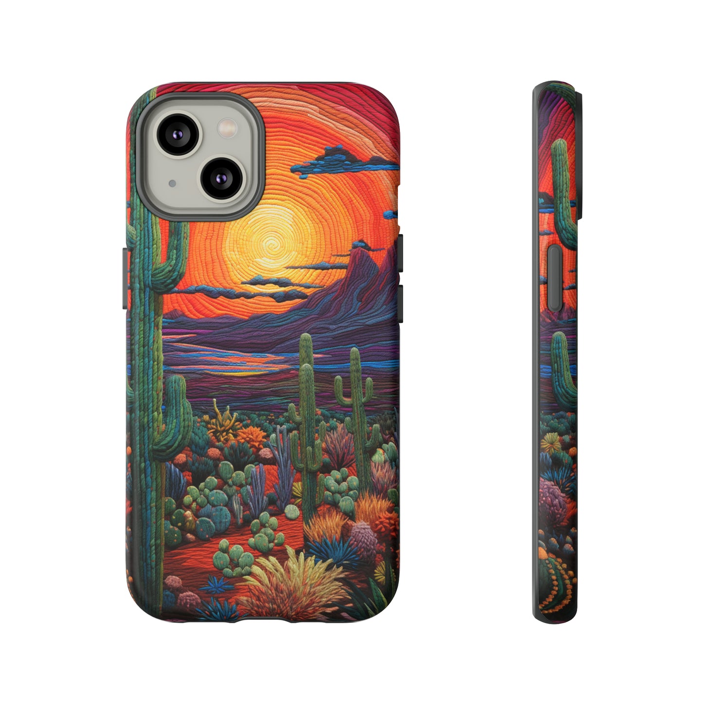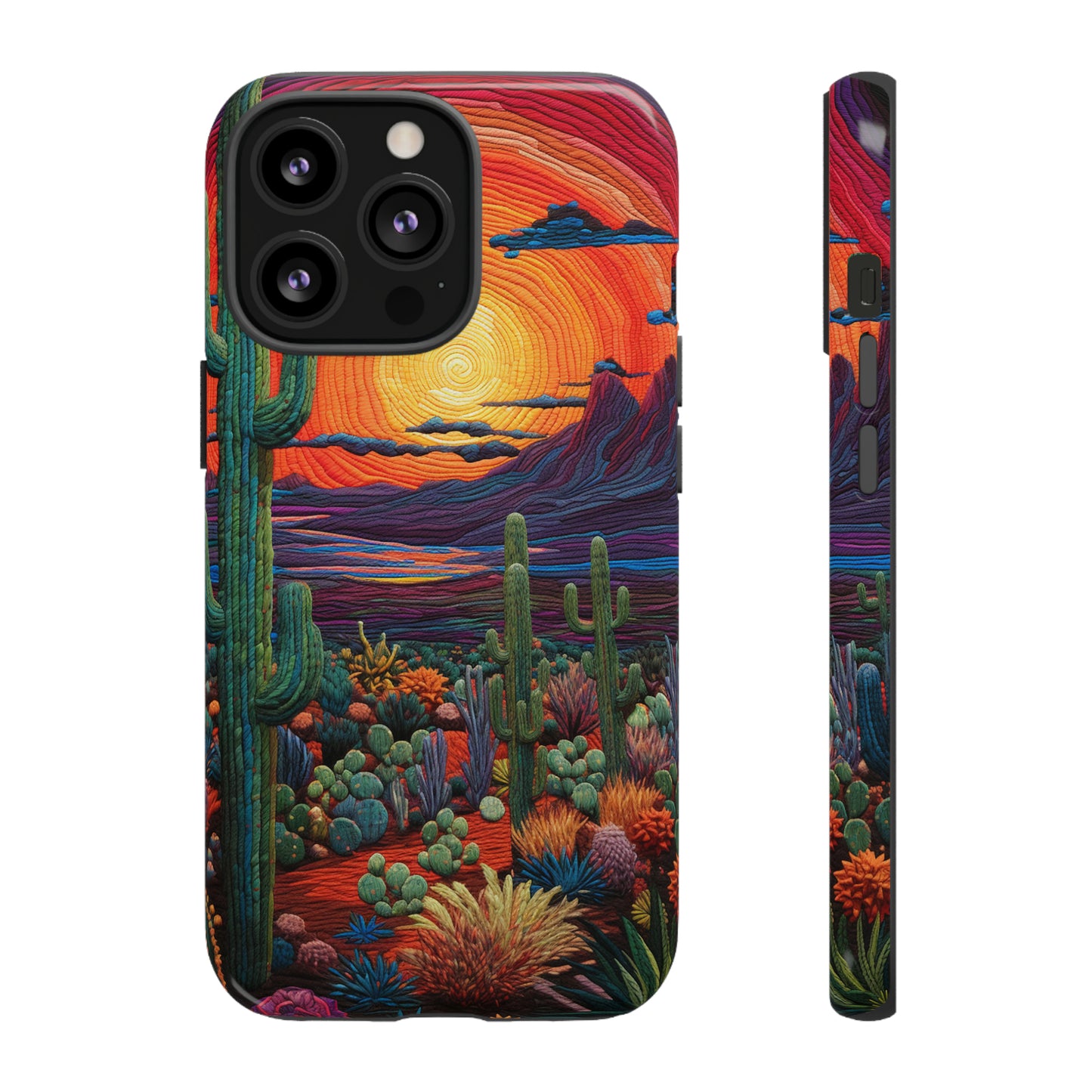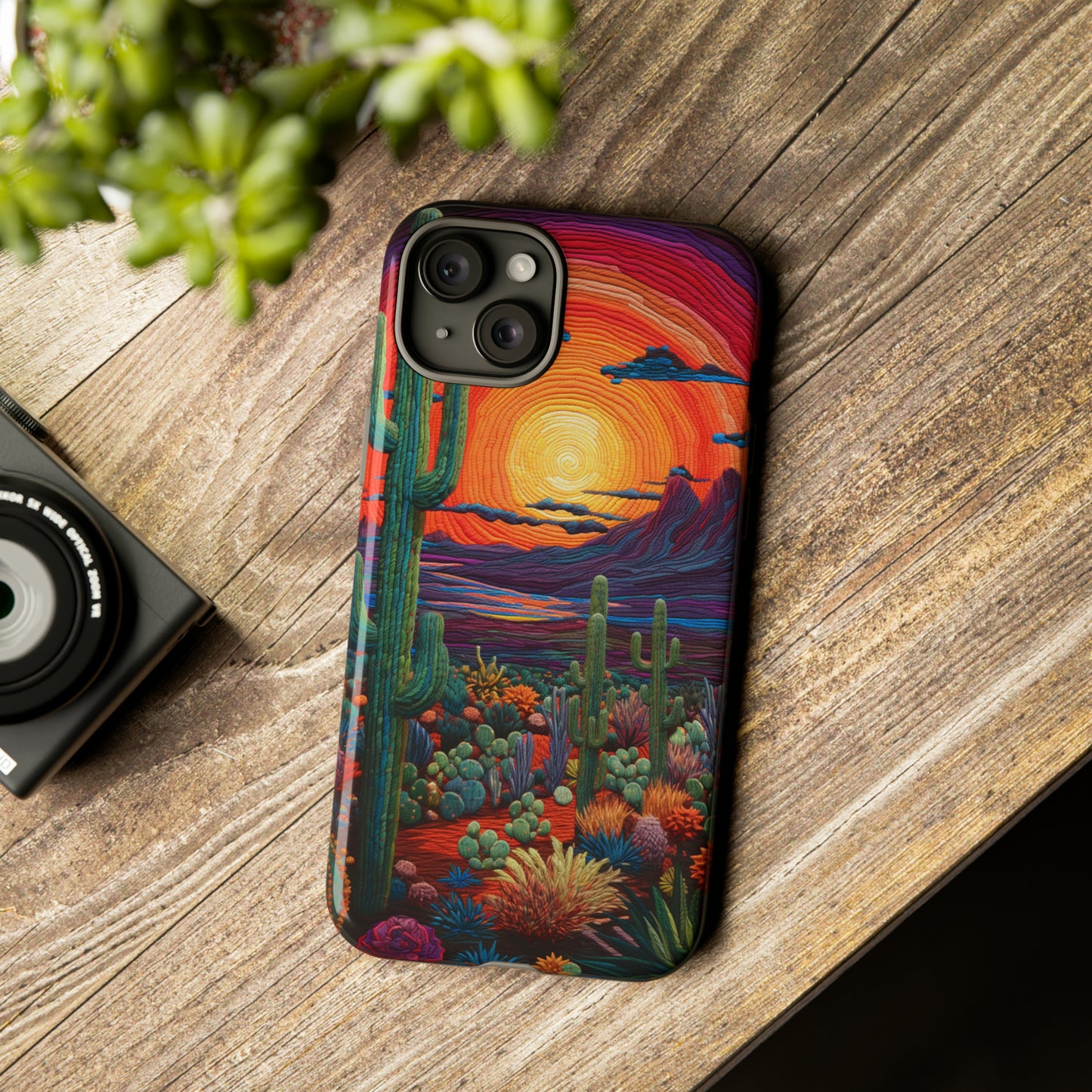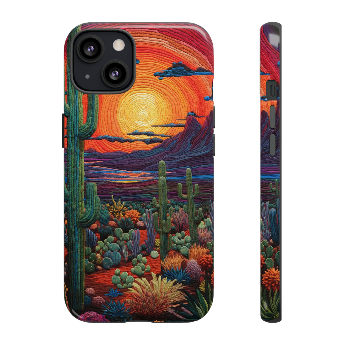Capture the essence of the Southwest with our Cactus Desert Sunset iPhone Case, available in an exquisite embroidery style design. This unique case is compatible with a range of iPhone models including the iPhone 15, 15 Plus, 12 Mini, XR, XS Max, 8, and 7. Featuring a serene desert scene with cacti silhouetted against a stunning sunset, it embodies the spirit of Arizona's landscapes. Perfect for wanderlust enthusiasts and those who love the rugged beauty of the desert, this case not only adds a touch of Southwest charm to your device but also provides durable protection.