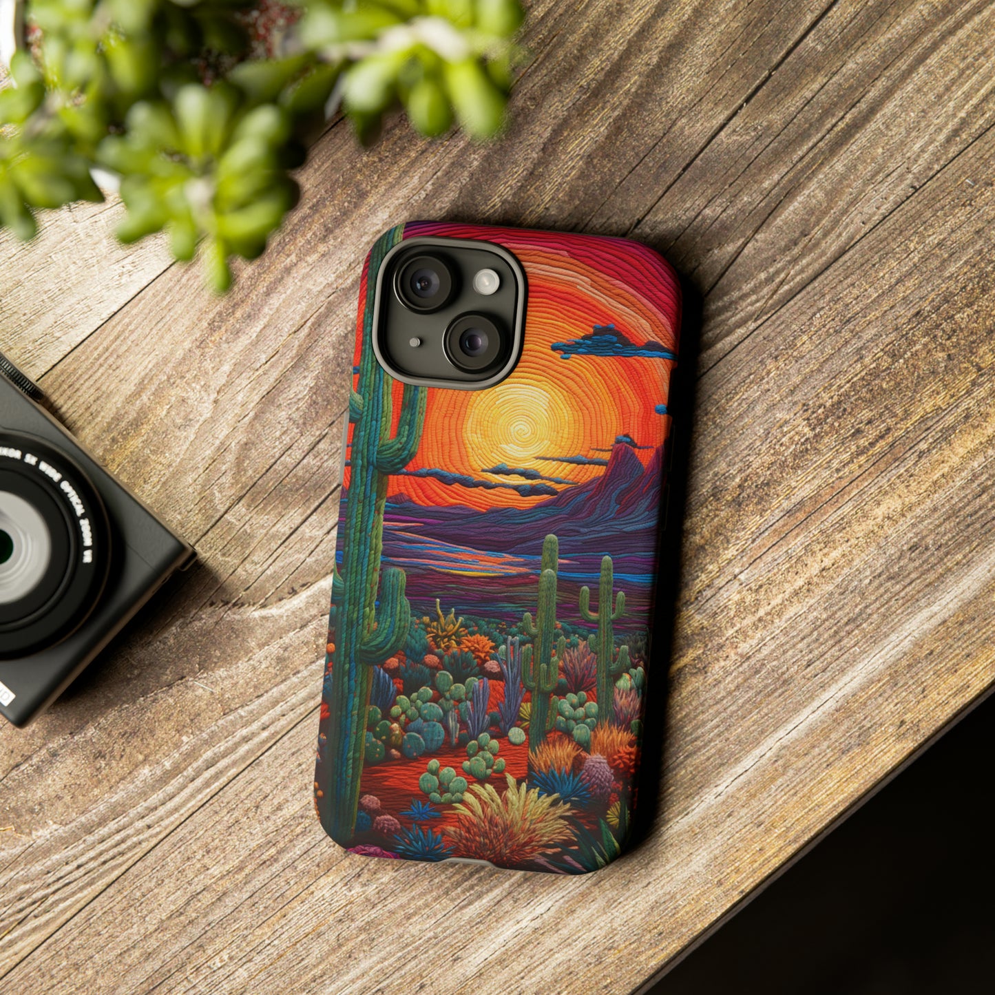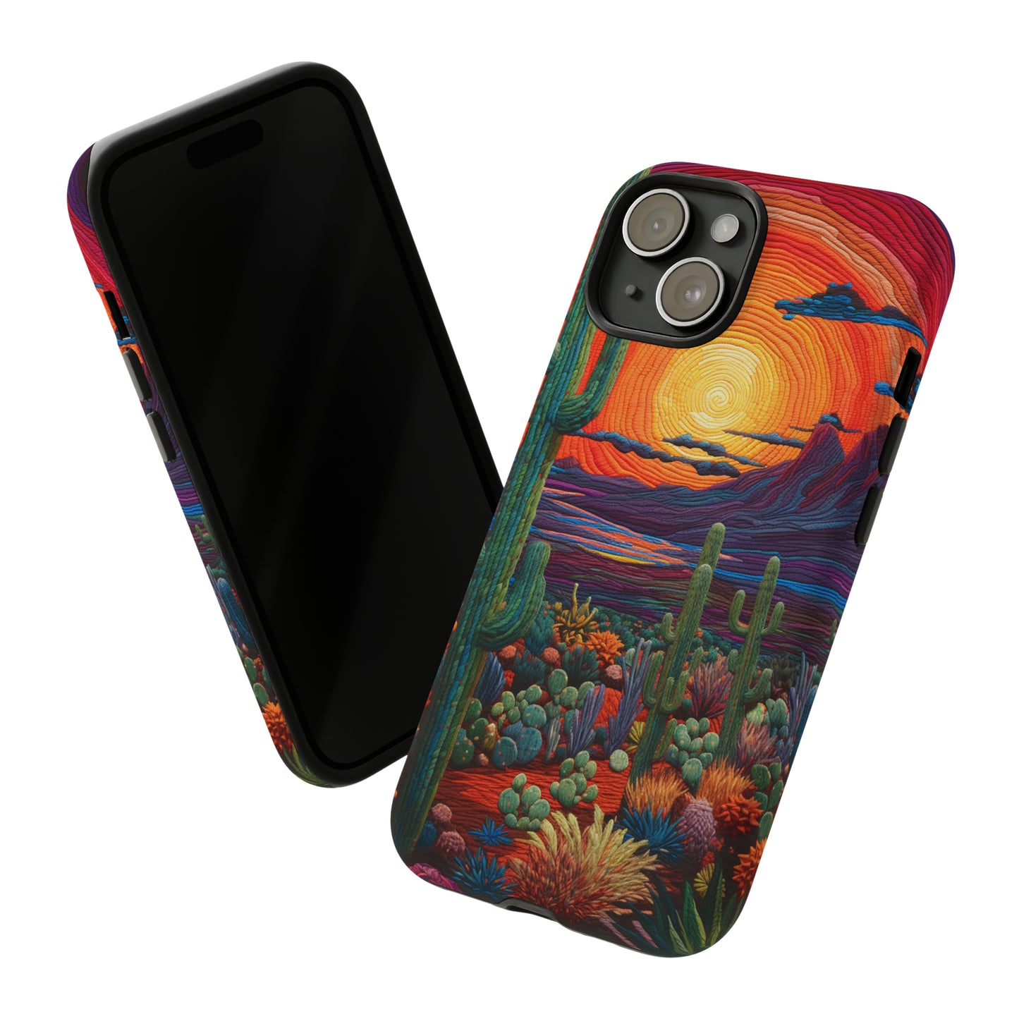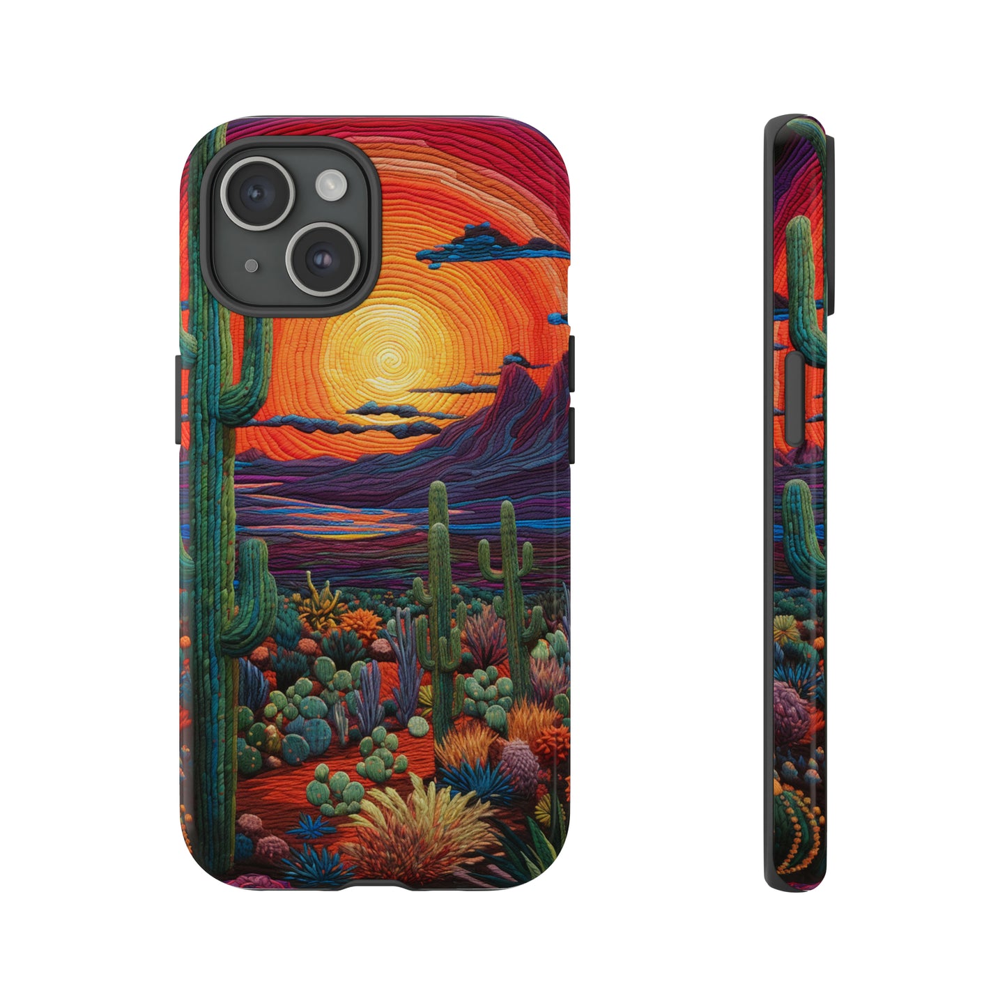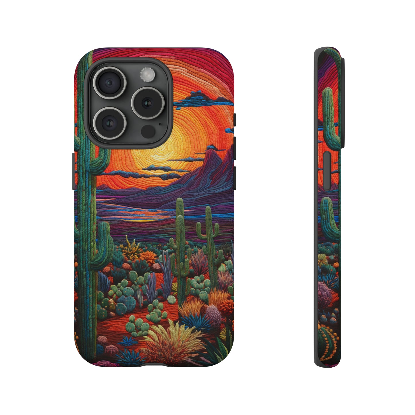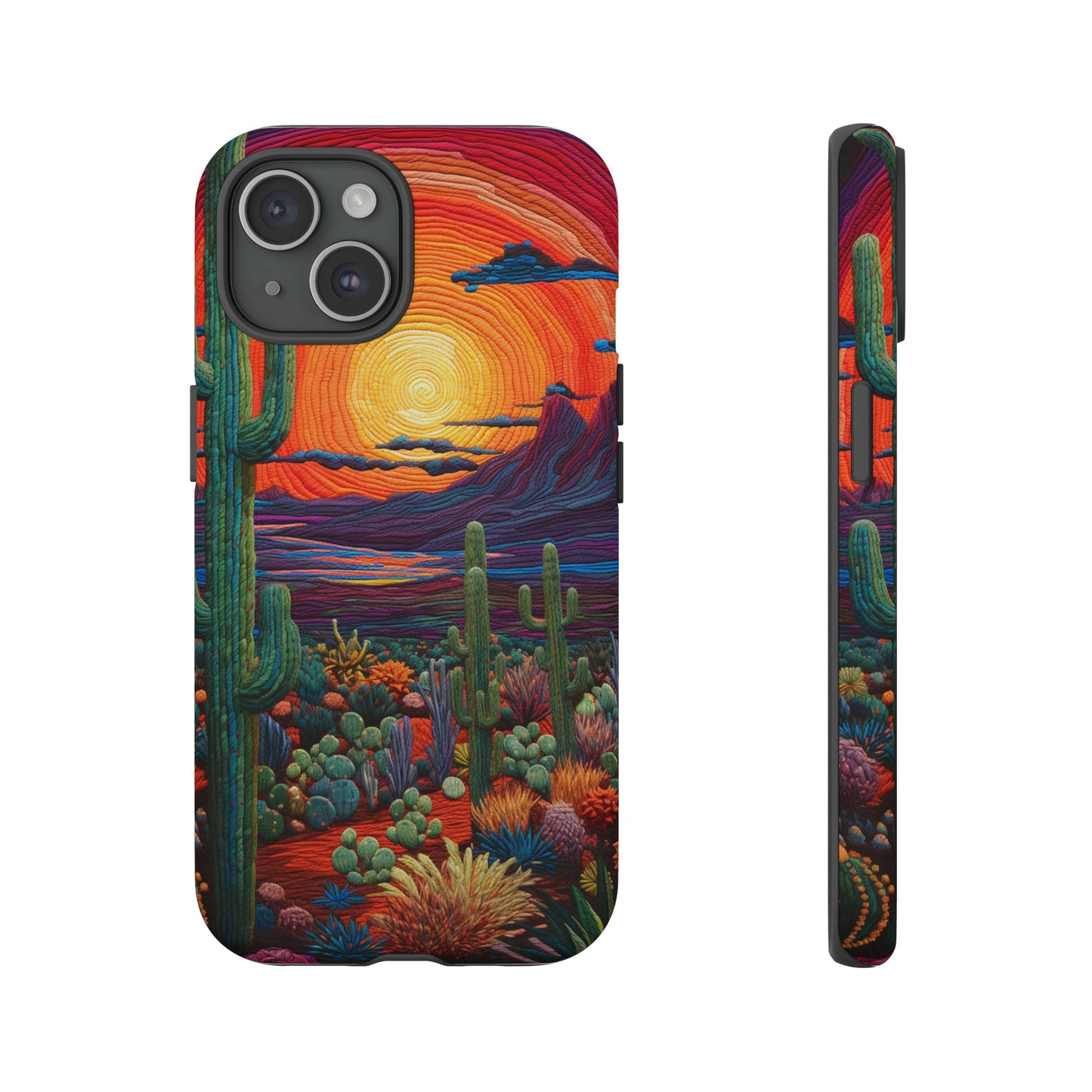 Capture the essence of the Southwest with our Cactus Desert Sunset iPhone Case, available in an exquisite embroidery style design. This unique case is compatible with a range of iPhone models including the iPhone 15, 15 Plus, 12 Mini, XR, XS Max, 8, and 7. Featuring a serene desert scene with cacti silhouetted against a stunning sunset, it embodies the spirit of Arizona's landscapes. Perfect for wanderlust enthusiasts and those who love the rugged beauty of the desert, this case not only adds a touch of Southwest charm to your device but also provides durable protection.