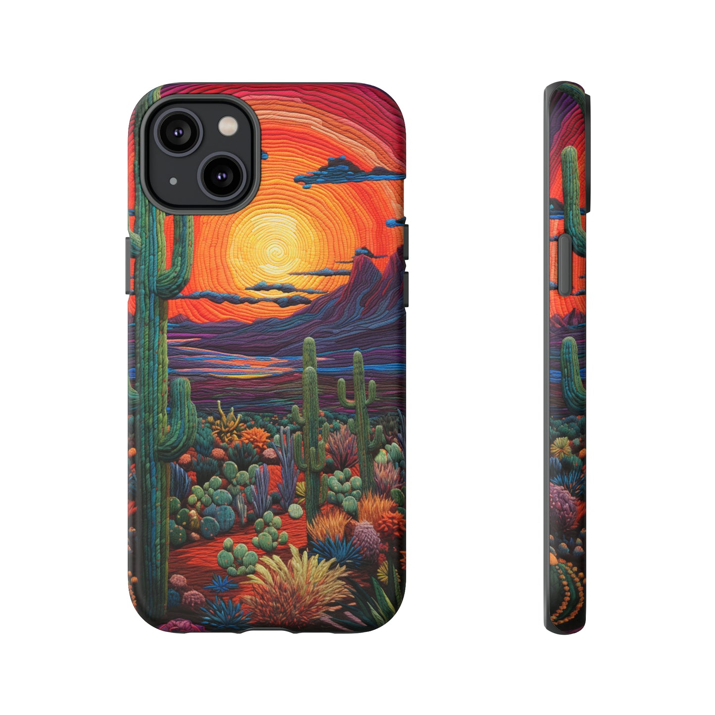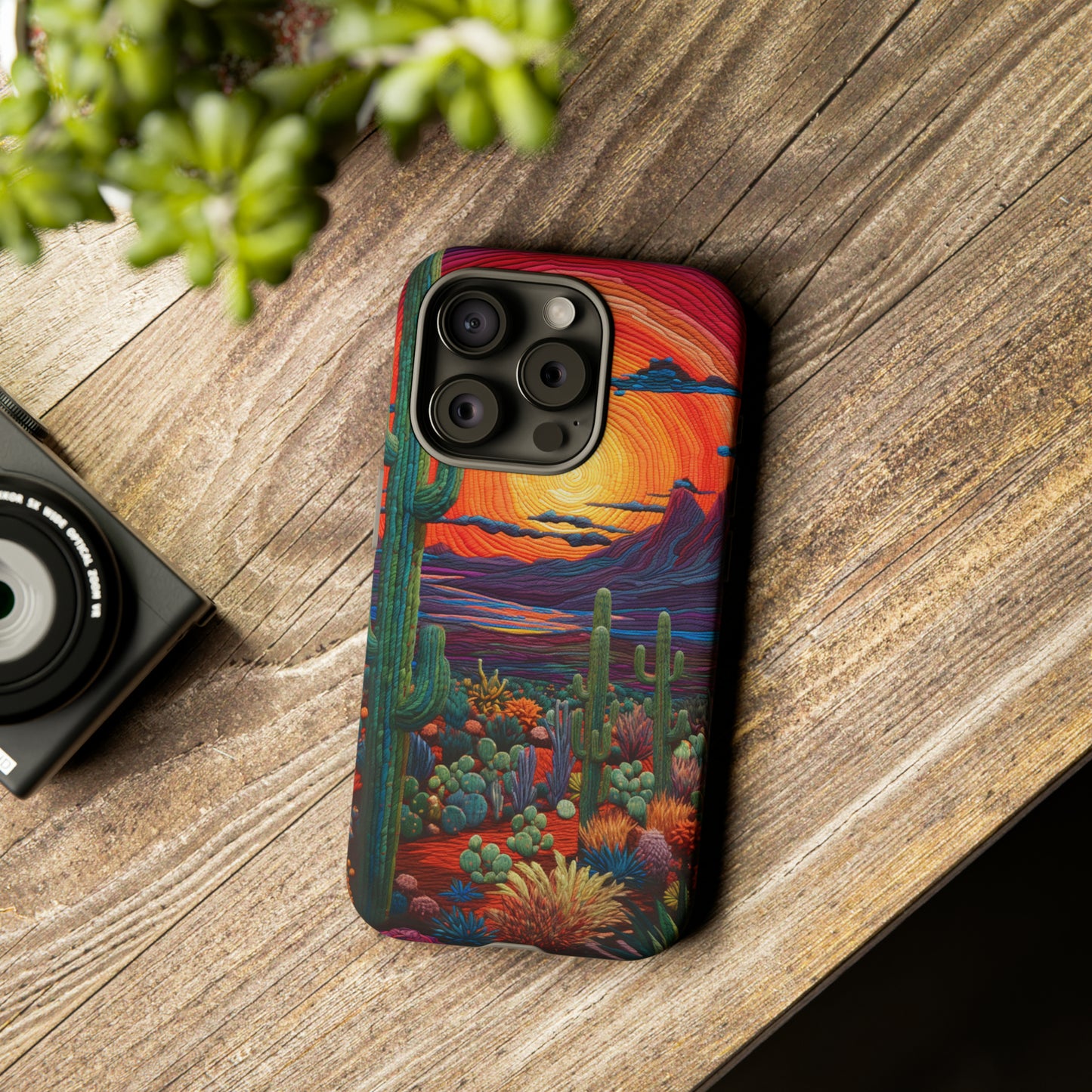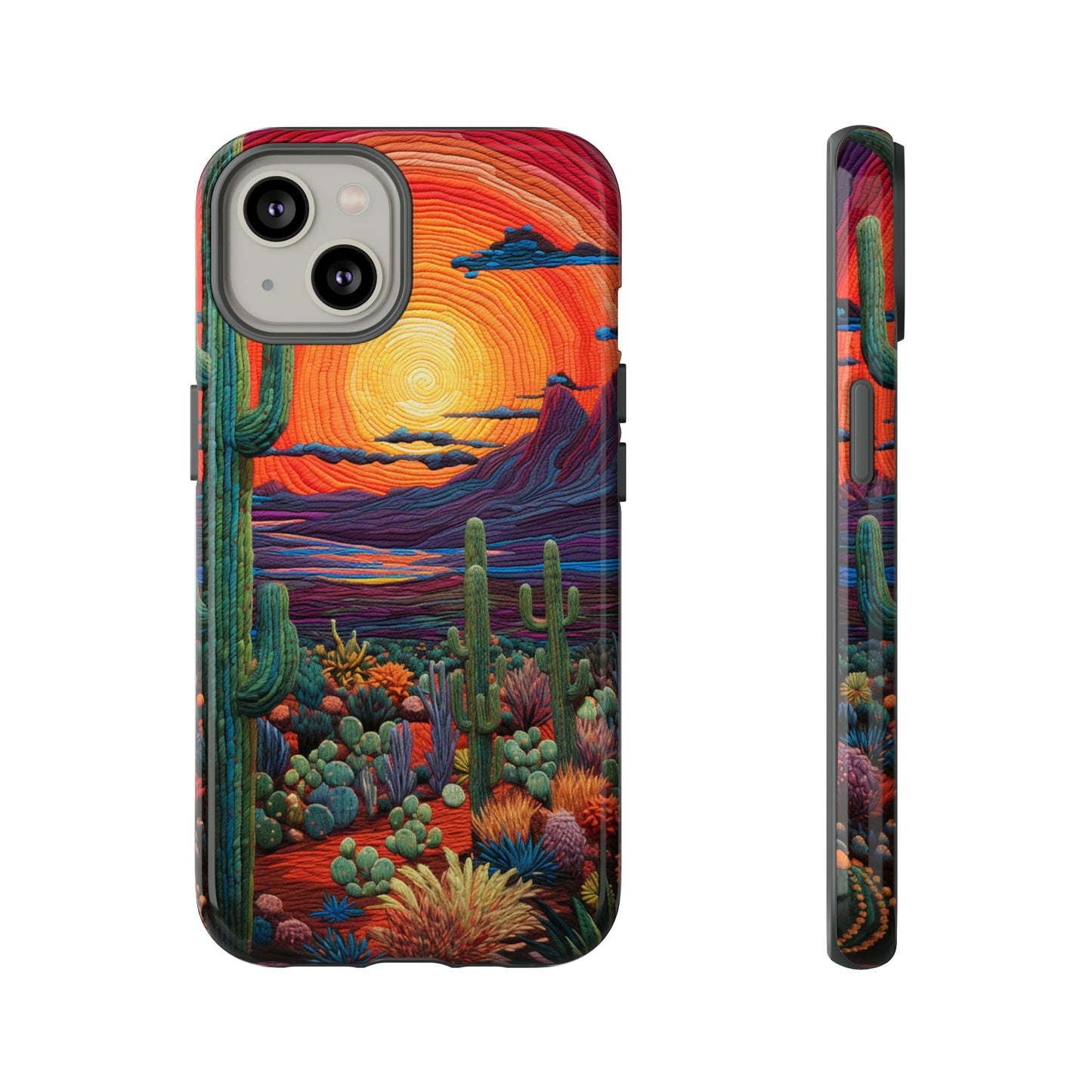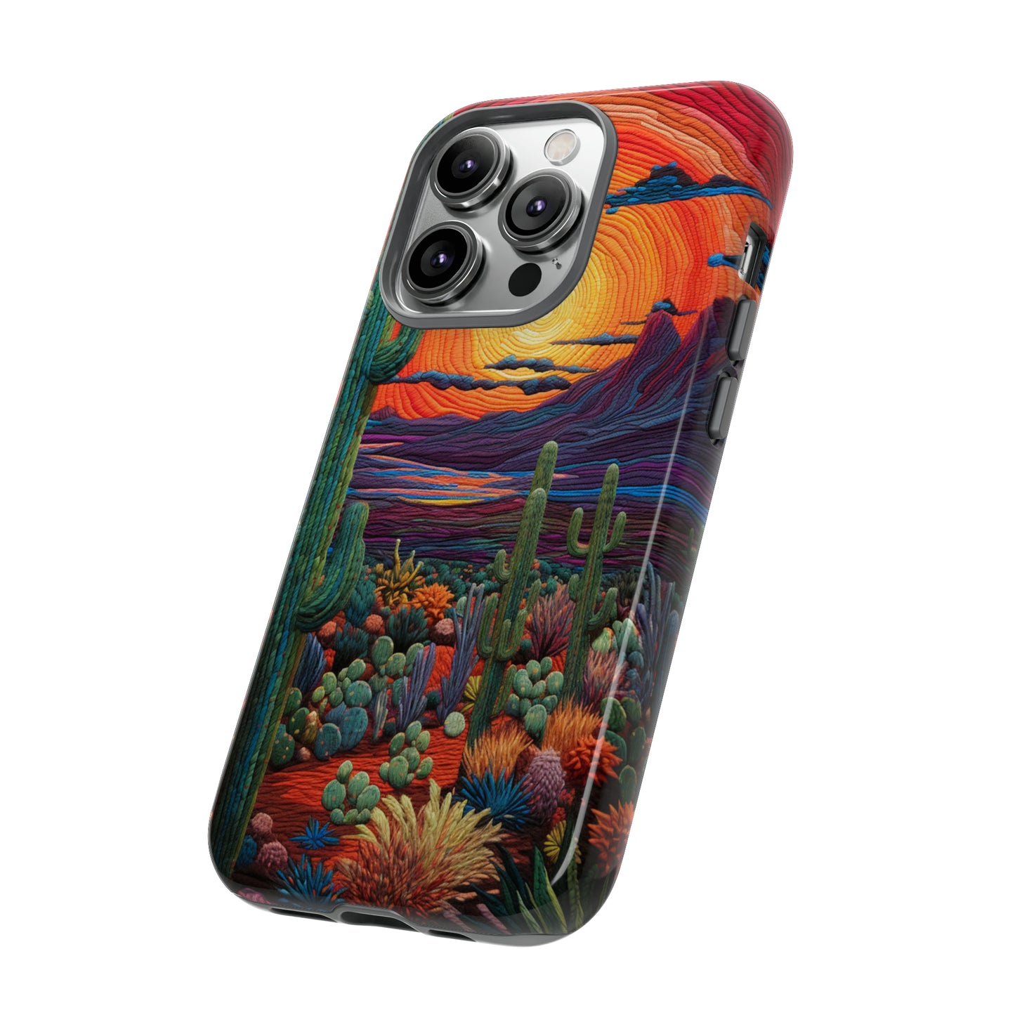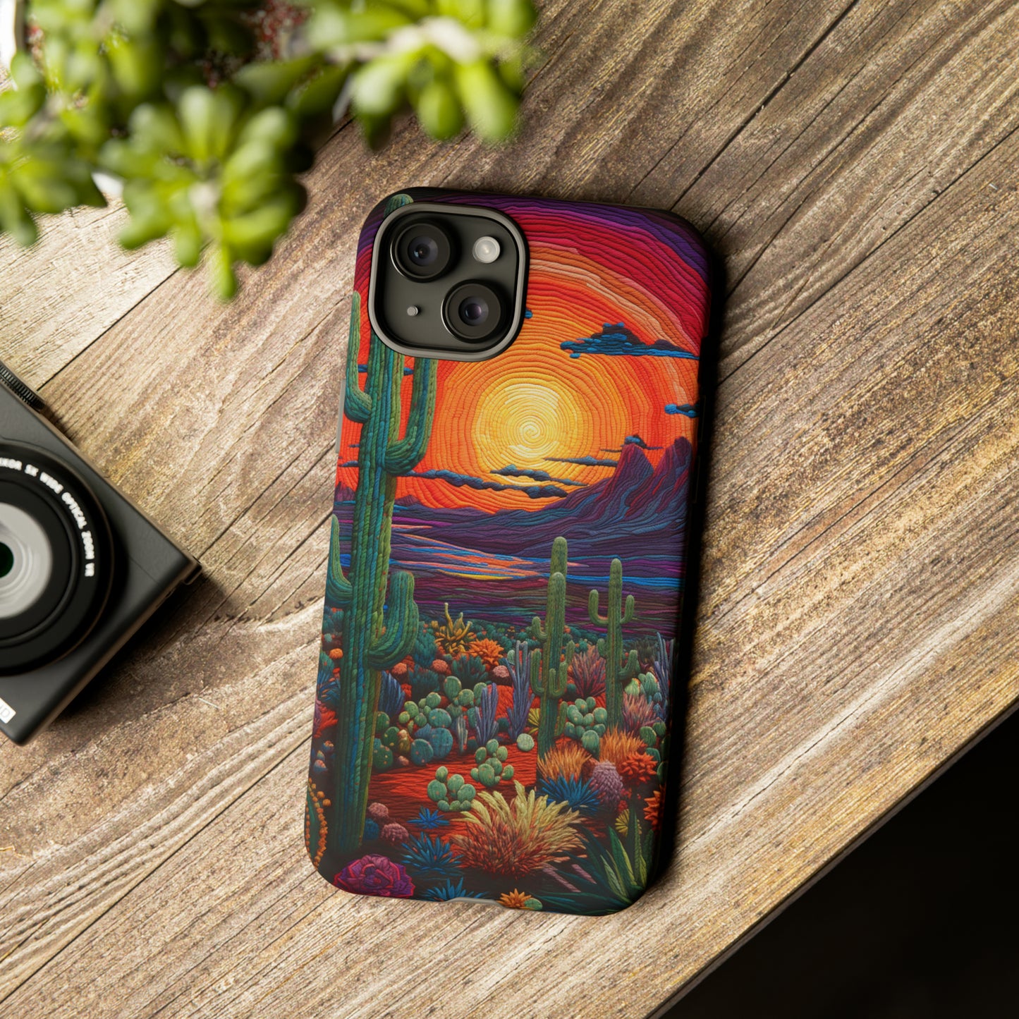 Capture the essence of the Southwest with our Cactus Desert Sunset iPhone Case, available in an exquisite embroidery style design. This unique case is compatible with a range of iPhone models including the iPhone 15, 15 Plus, 12 Mini, XR, XS Max, 8, and 7. Featuring a serene desert scene with cacti silhouetted against a stunning sunset, it embodies the spirit of Arizona's landscapes. Perfect for wanderlust enthusiasts and those who love the rugged beauty of the desert, this case not only adds a touch of Southwest charm to your device but also provides durable protection.