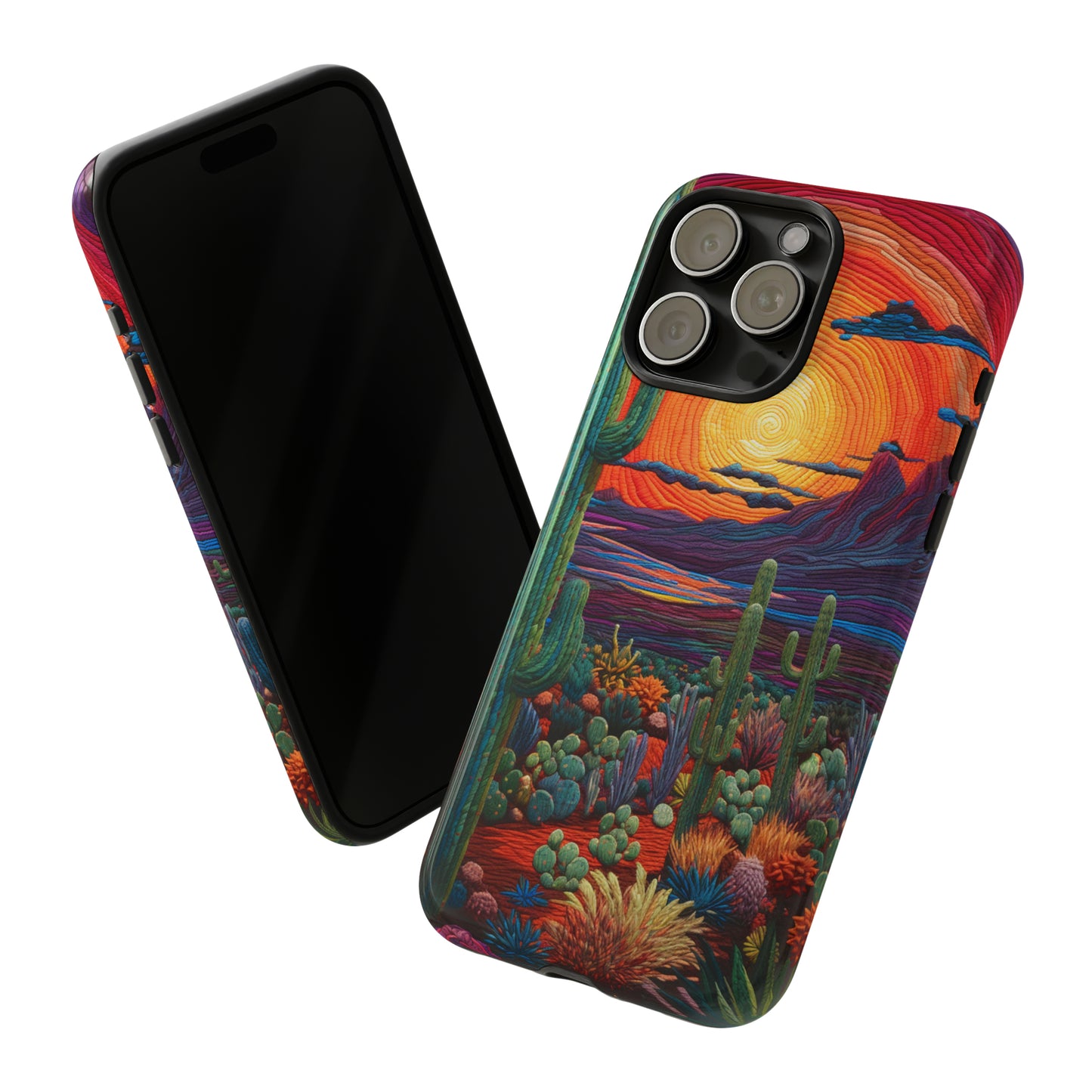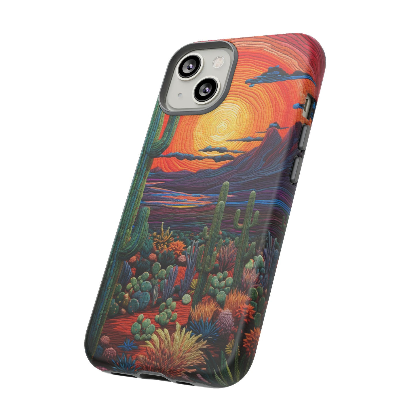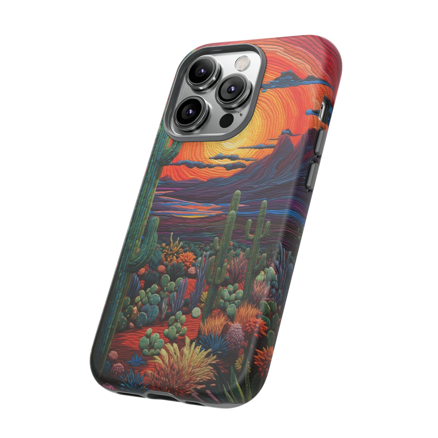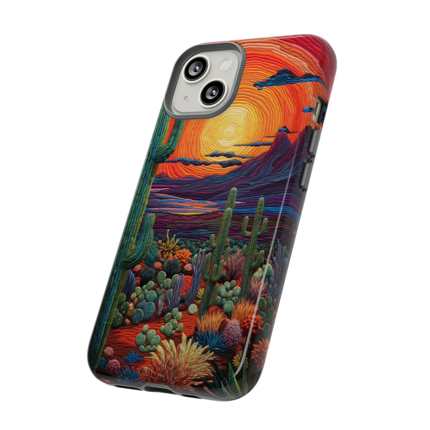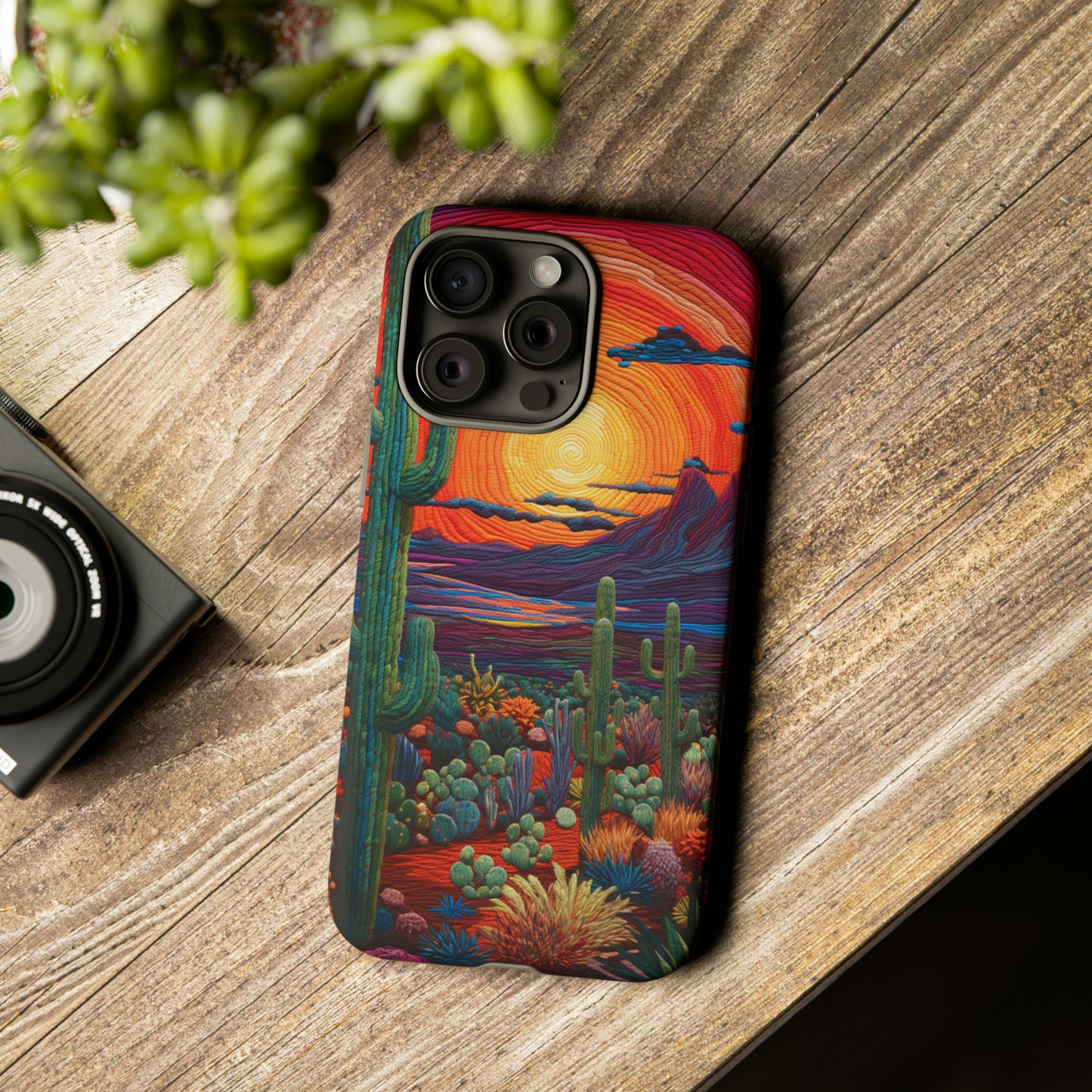 Capture the essence of the Southwest with our Cactus Desert Sunset iPhone Case, available in an exquisite embroidery style design. This unique case is compatible with a range of iPhone models including the iPhone 15, 15 Plus, 12 Mini, XR, XS Max, 8, and 7. Featuring a serene desert scene with cacti silhouetted against a stunning sunset, it embodies the spirit of Arizona's landscapes. Perfect for wanderlust enthusiasts and those who love the rugged beauty of the desert, this case not only adds a touch of Southwest charm to your device but also provides durable protection.