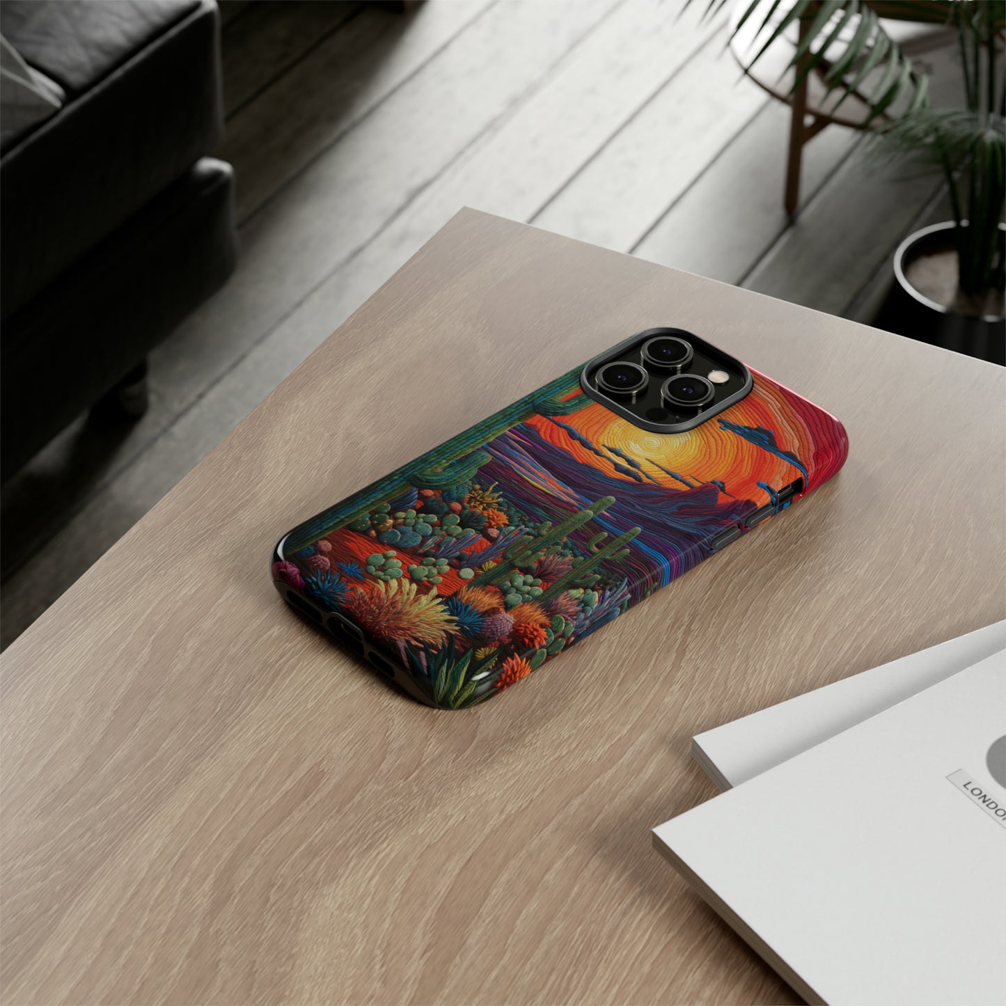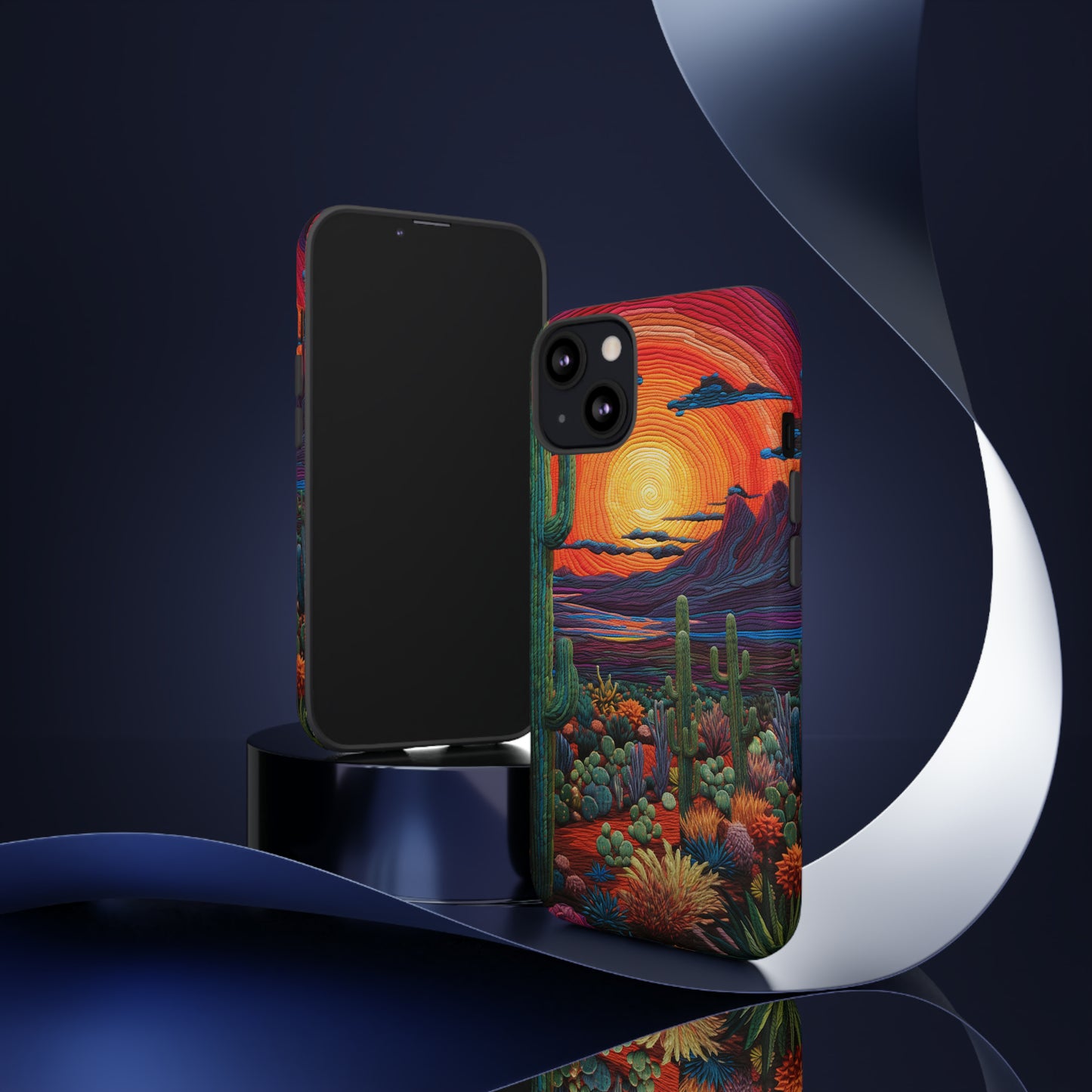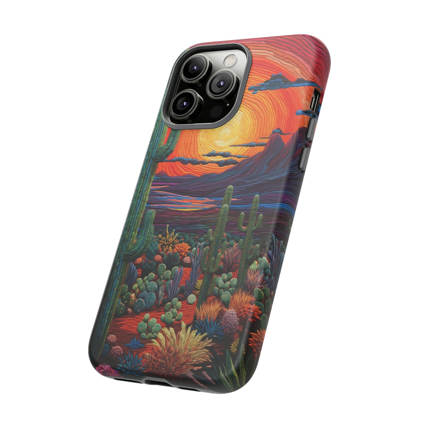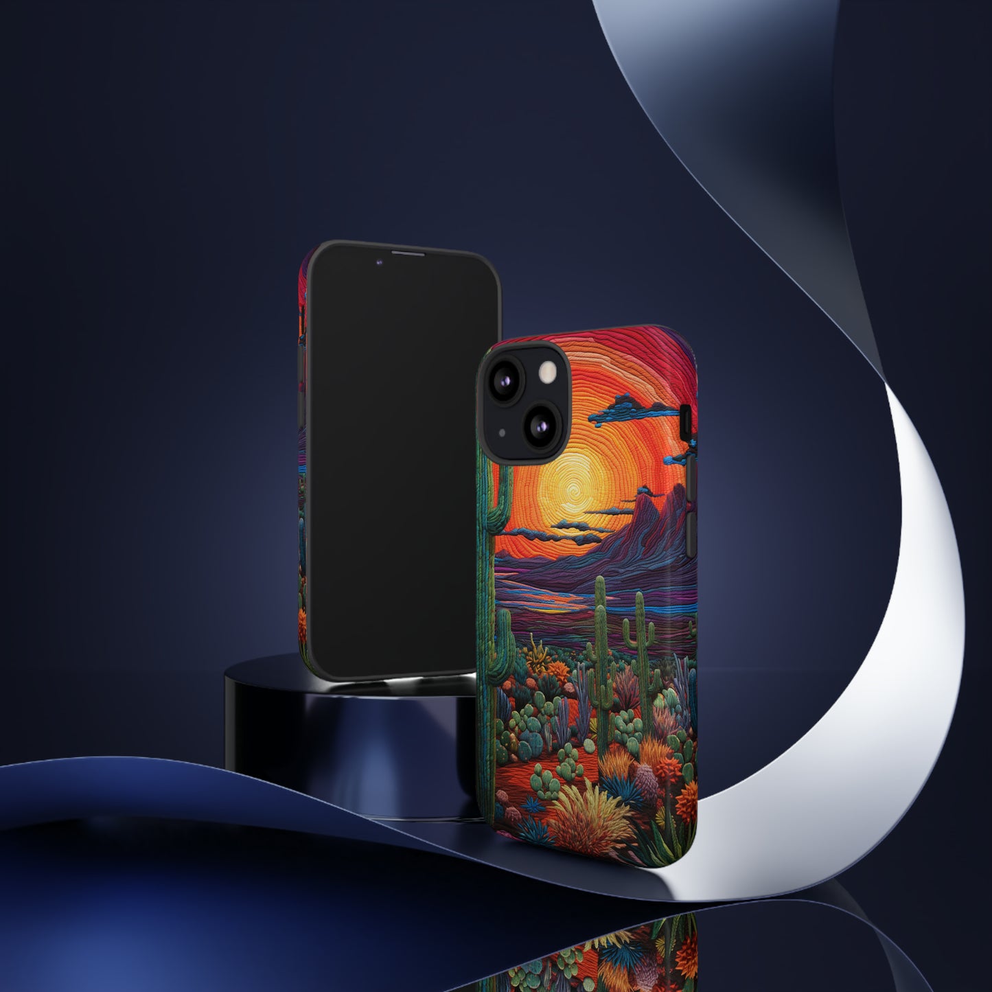 Capture the essence of the Southwest with our Cactus Desert Sunset iPhone Case, available in an exquisite embroidery style design. This unique case is compatible with a range of iPhone models including the iPhone 15, 15 Plus, 12 Mini, XR, XS Max, 8, and 7. Featuring a serene desert scene with cacti silhouetted against a stunning sunset, it embodies the spirit of Arizona's landscapes. Perfect for wanderlust enthusiasts and those who love the rugged beauty of the desert, this case not only adds a touch of Southwest charm to your device but also provides durable protection.