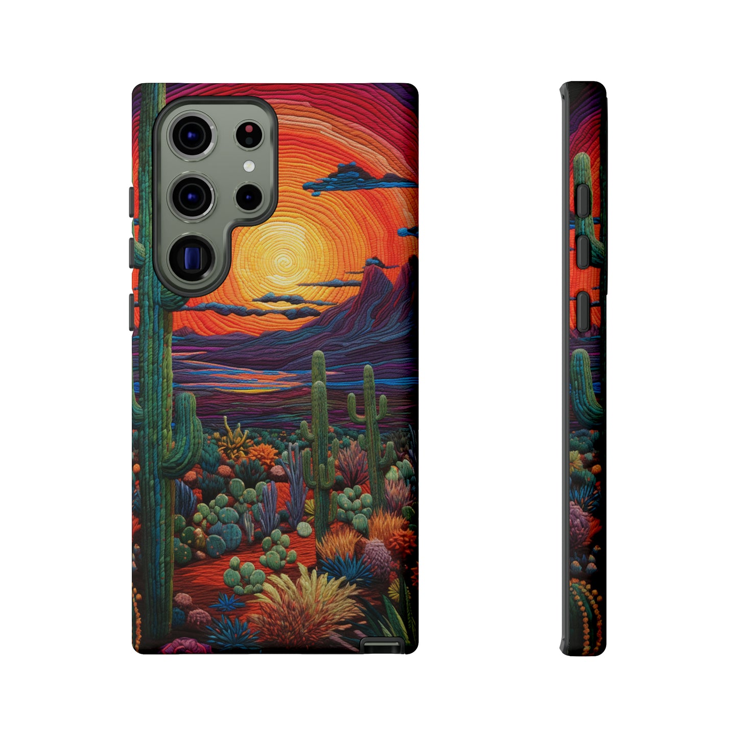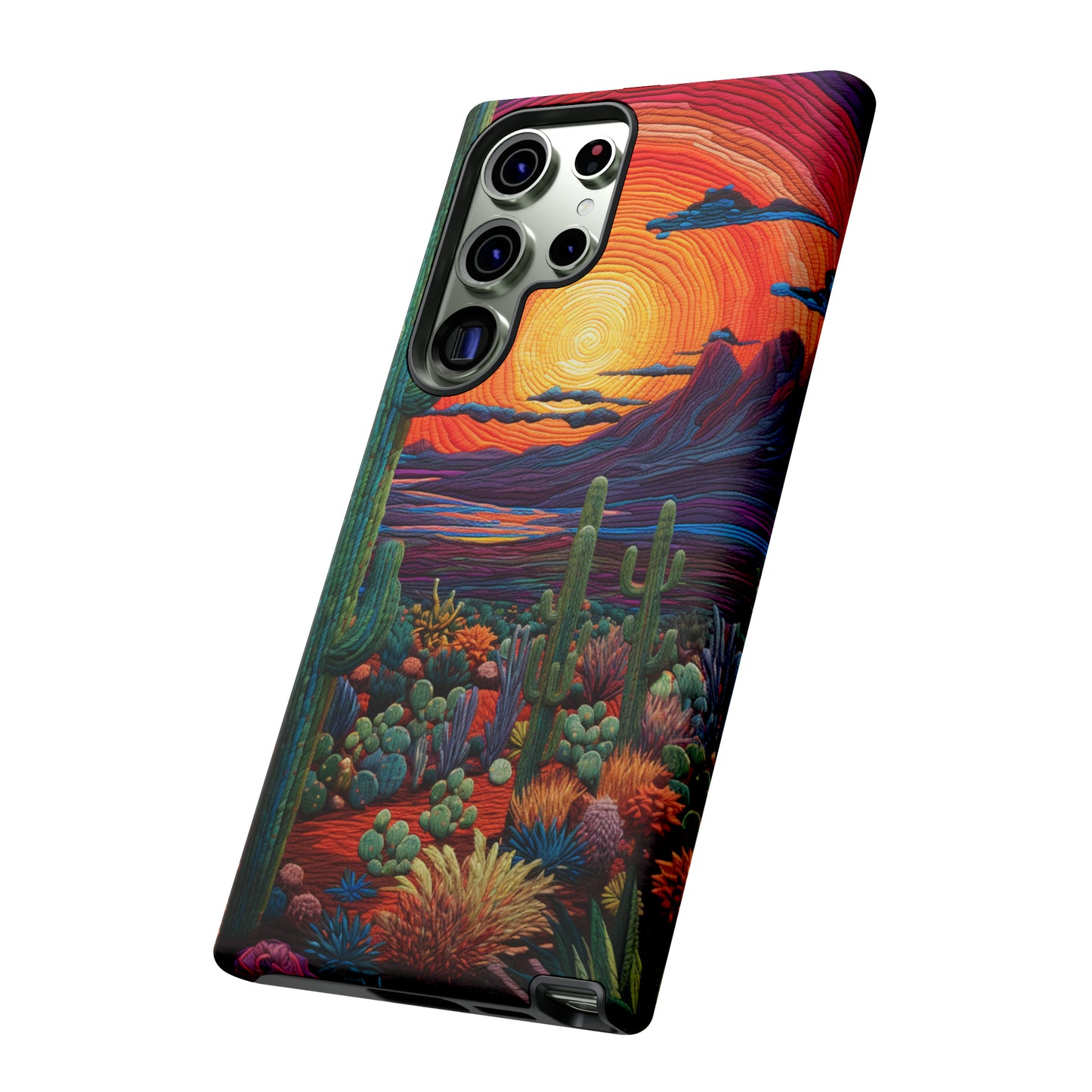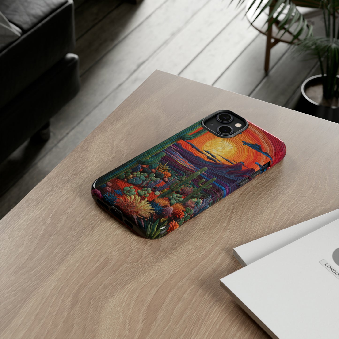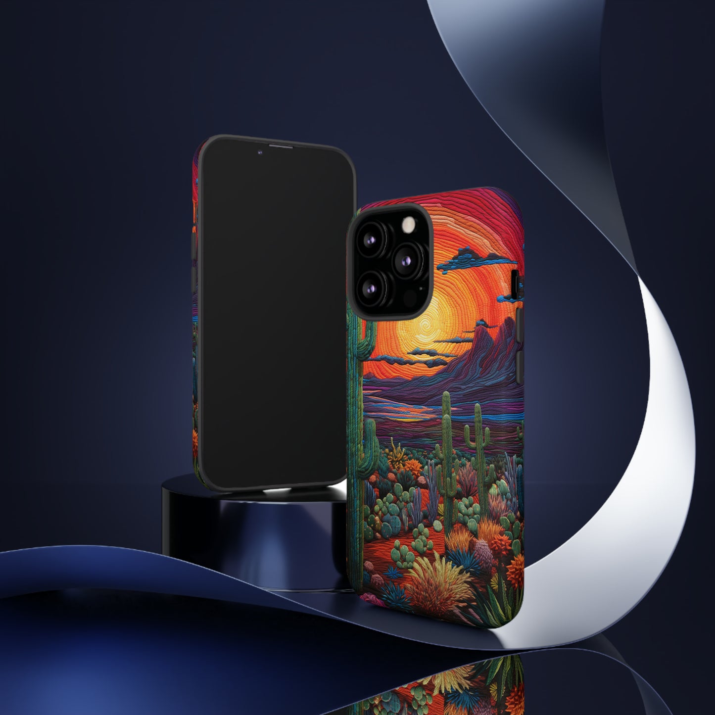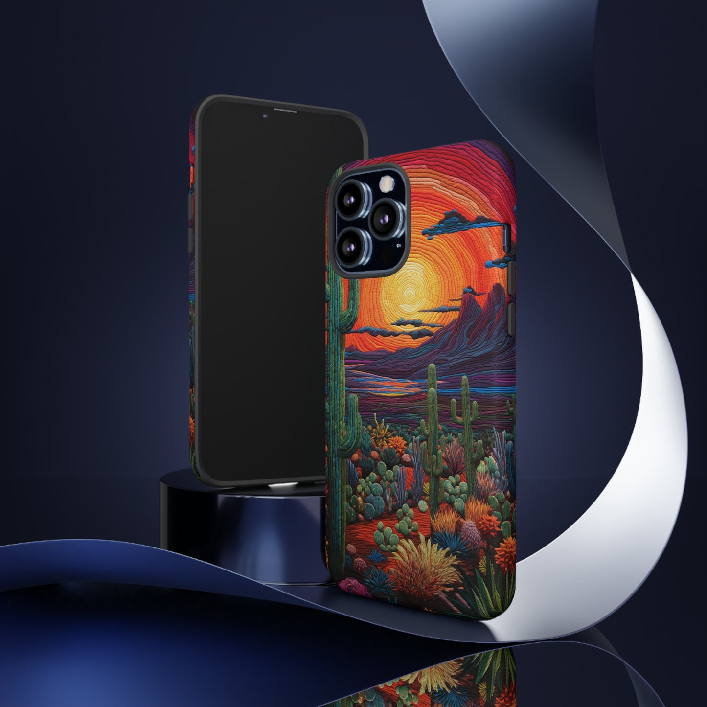 Capture the essence of the Southwest with our Cactus Desert Sunset iPhone Case, available in an exquisite embroidery style design. This unique case is compatible with a range of iPhone models including the iPhone 15, 15 Plus, 12 Mini, XR, XS Max, 8, and 7. Featuring a serene desert scene with cacti silhouetted against a stunning sunset, it embodies the spirit of Arizona's landscapes. Perfect for wanderlust enthusiasts and those who love the rugged beauty of the desert, this case not only adds a touch of Southwest charm to your device but also provides durable protection.