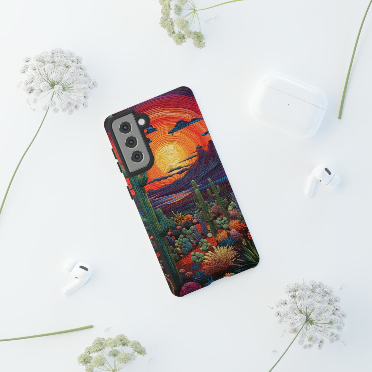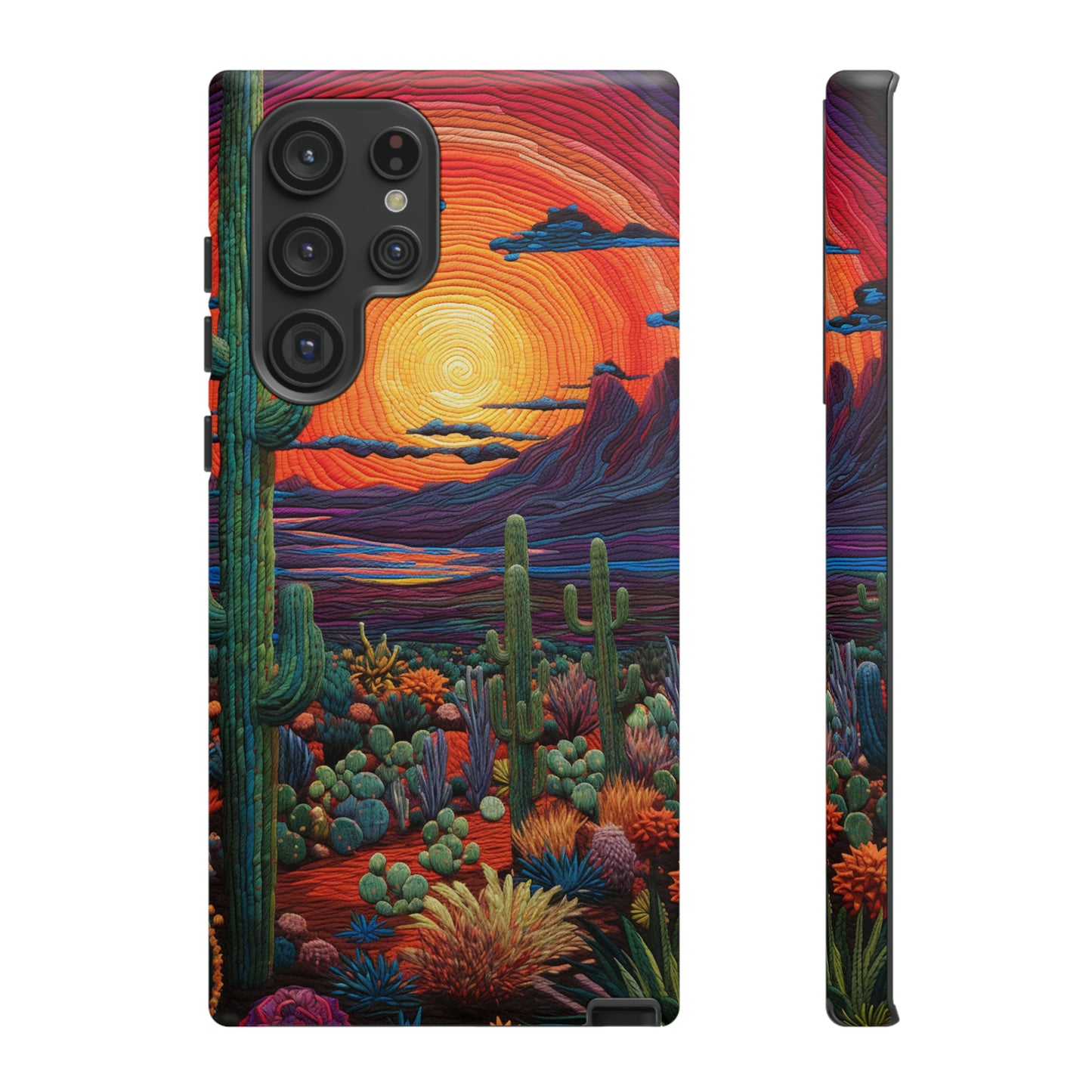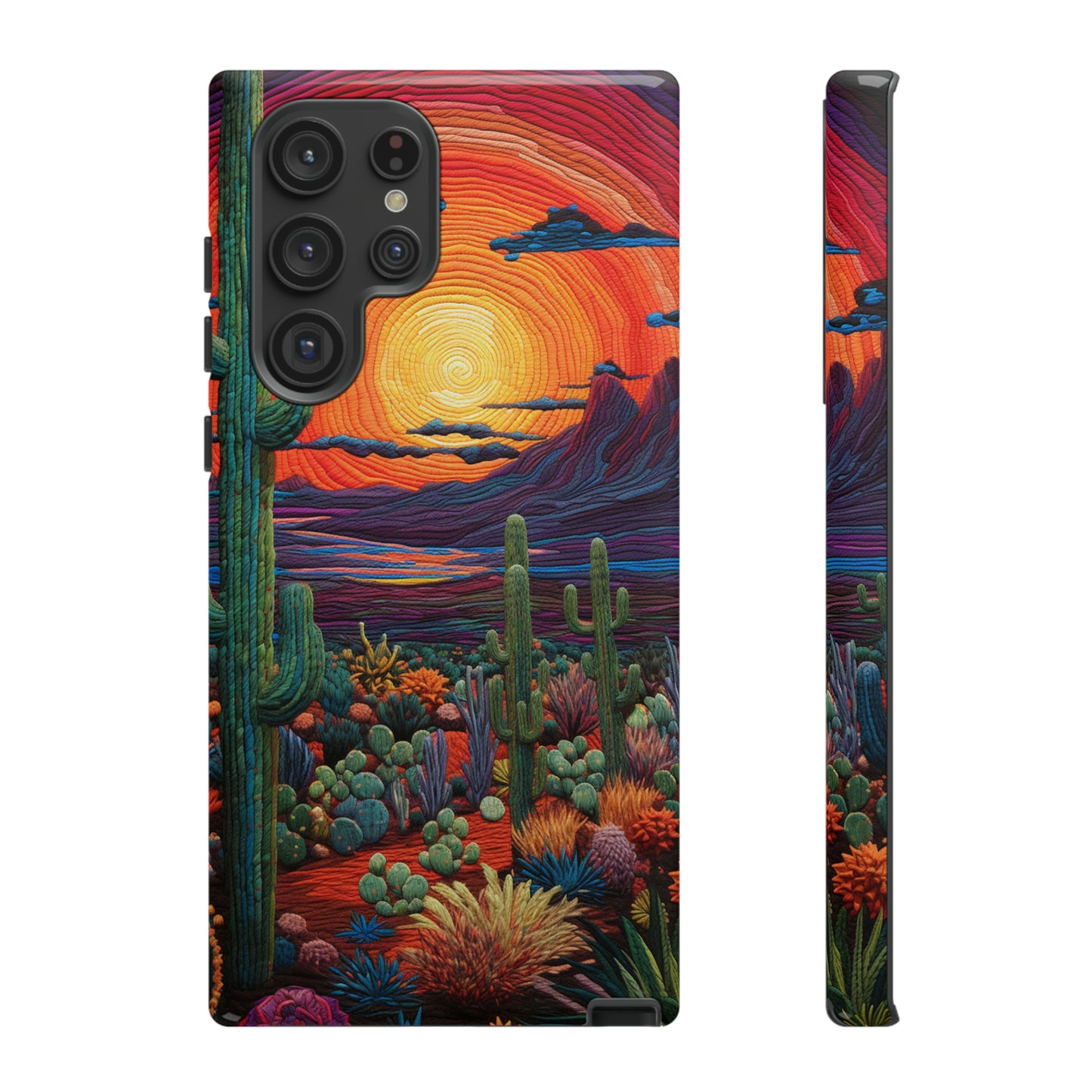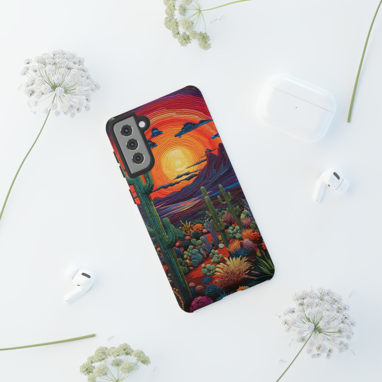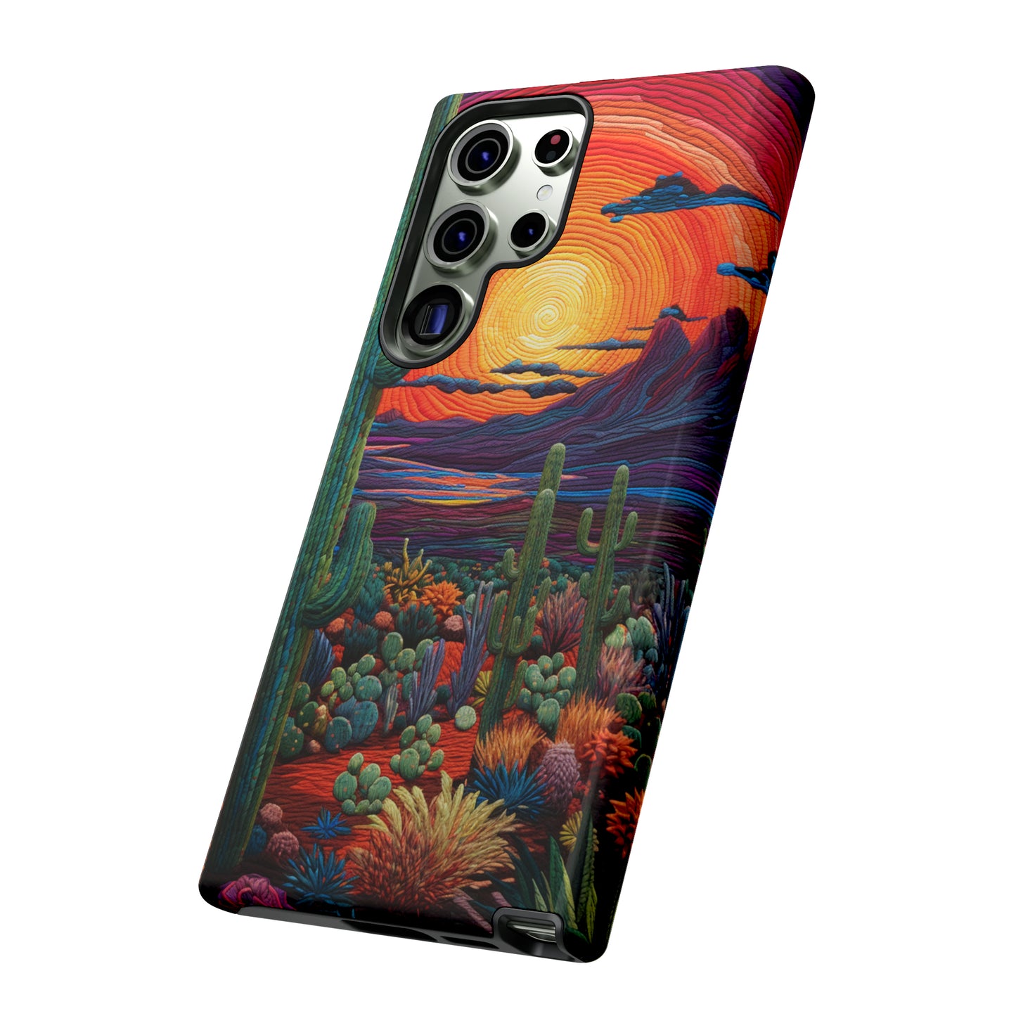 Capture the essence of the Southwest with our Cactus Desert Sunset iPhone Case, available in an exquisite embroidery style design. This unique case is compatible with a range of iPhone models including the iPhone 15, 15 Plus, 12 Mini, XR, XS Max, 8, and 7. Featuring a serene desert scene with cacti silhouetted against a stunning sunset, it embodies the spirit of Arizona's landscapes. Perfect for wanderlust enthusiasts and those who love the rugged beauty of the desert, this case not only adds a touch of Southwest charm to your device but also provides durable protection.