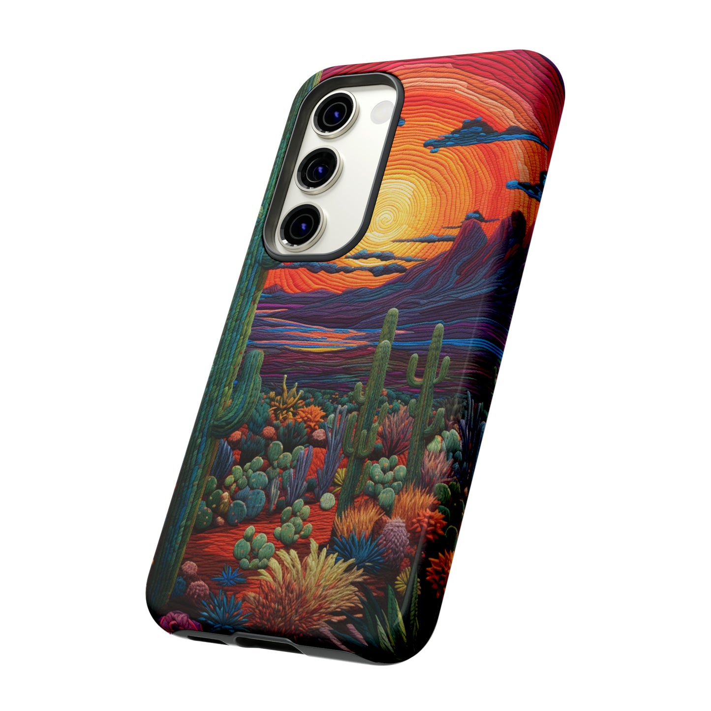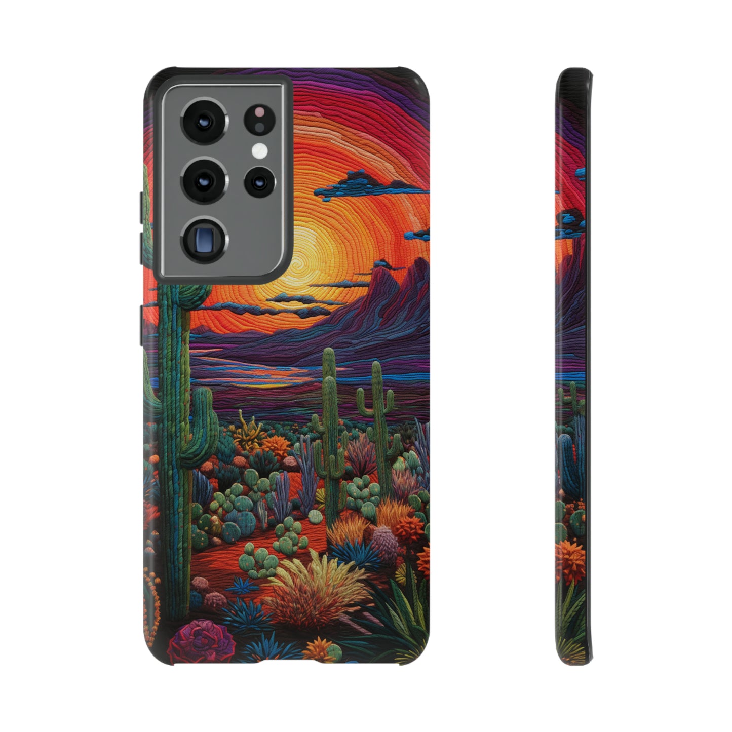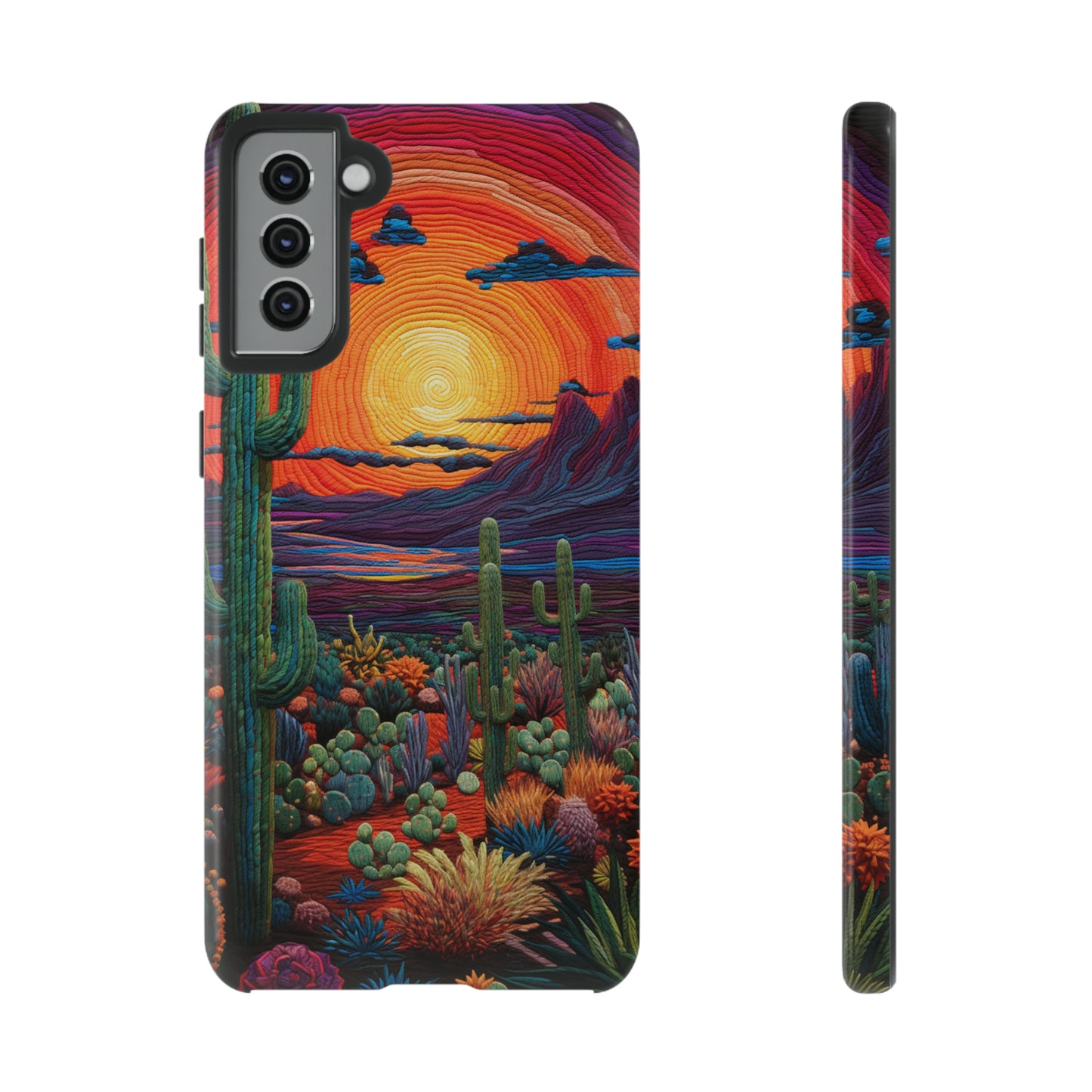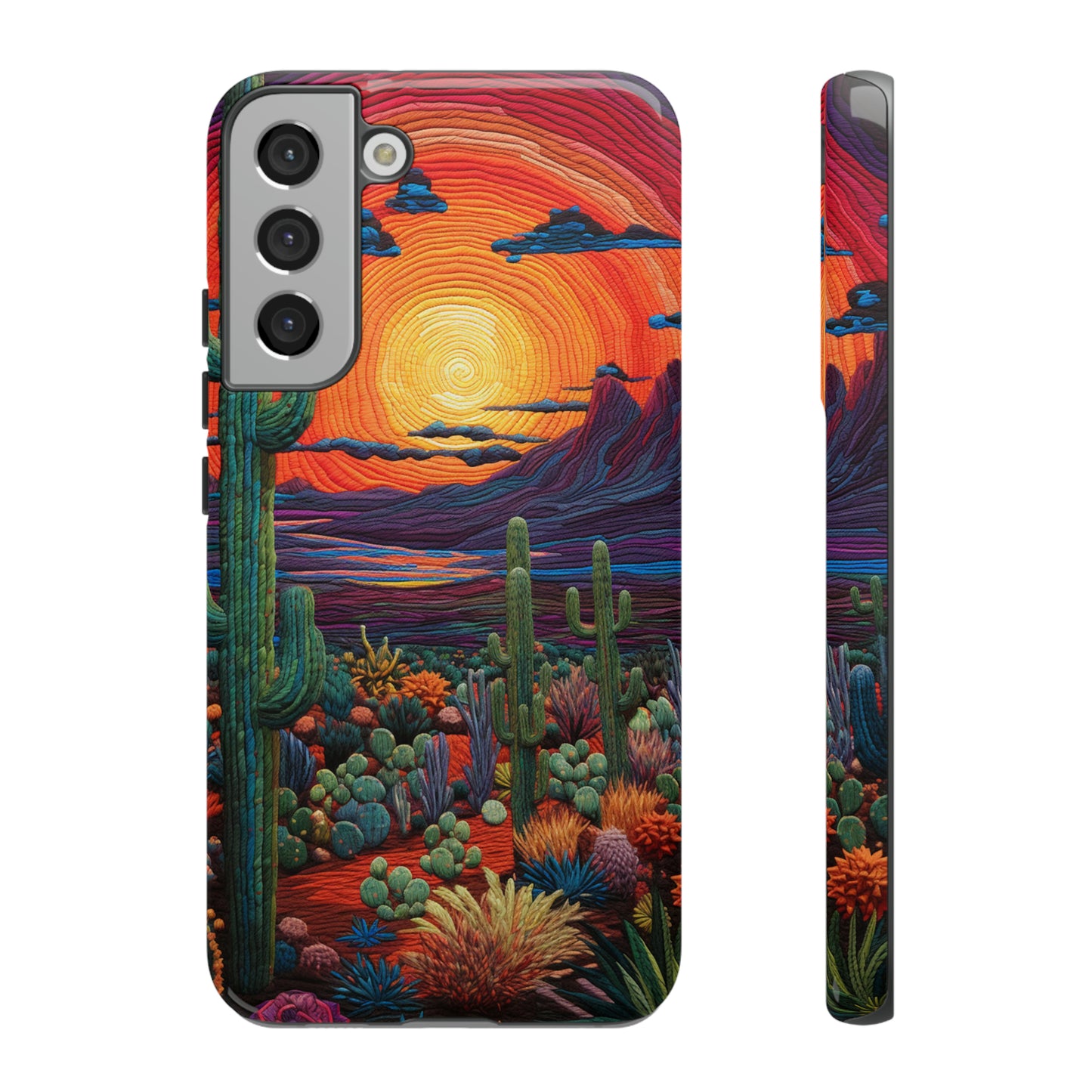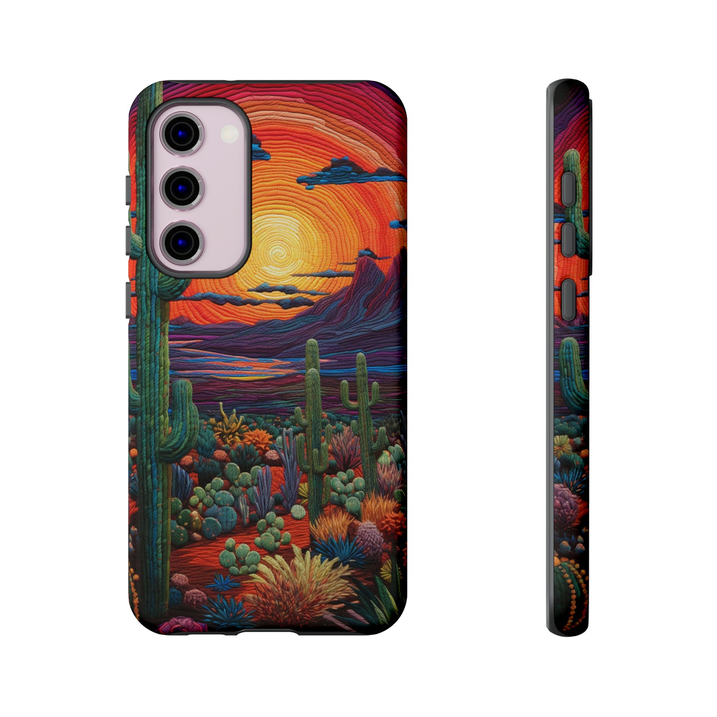 Capture the essence of the Southwest with our Cactus Desert Sunset iPhone Case, available in an exquisite embroidery style design. This unique case is compatible with a range of iPhone models including the iPhone 15, 15 Plus, 12 Mini, XR, XS Max, 8, and 7. Featuring a serene desert scene with cacti silhouetted against a stunning sunset, it embodies the spirit of Arizona's landscapes. Perfect for wanderlust enthusiasts and those who love the rugged beauty of the desert, this case not only adds a touch of Southwest charm to your device but also provides durable protection.