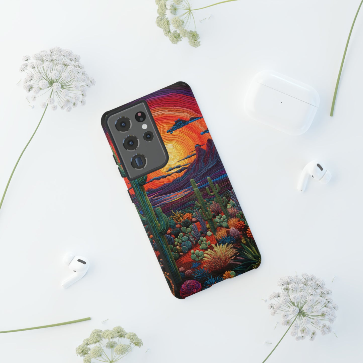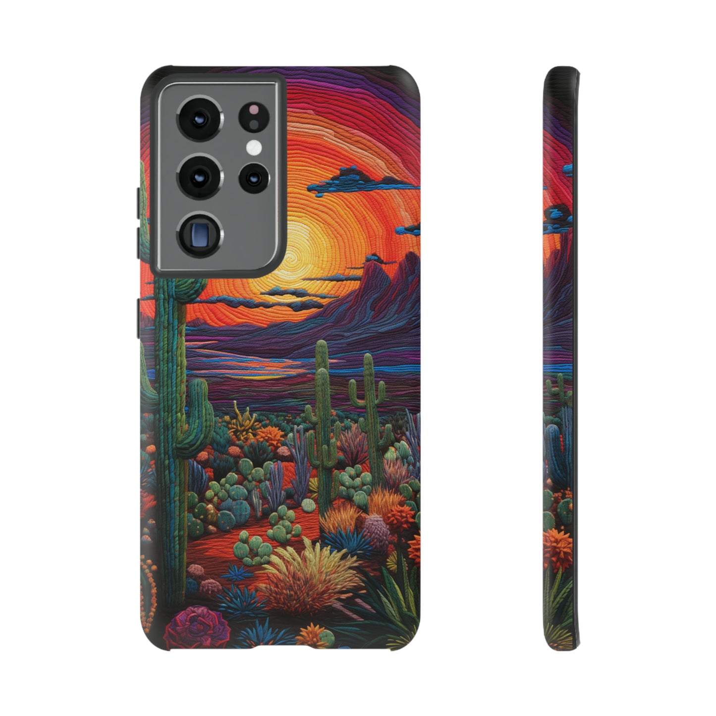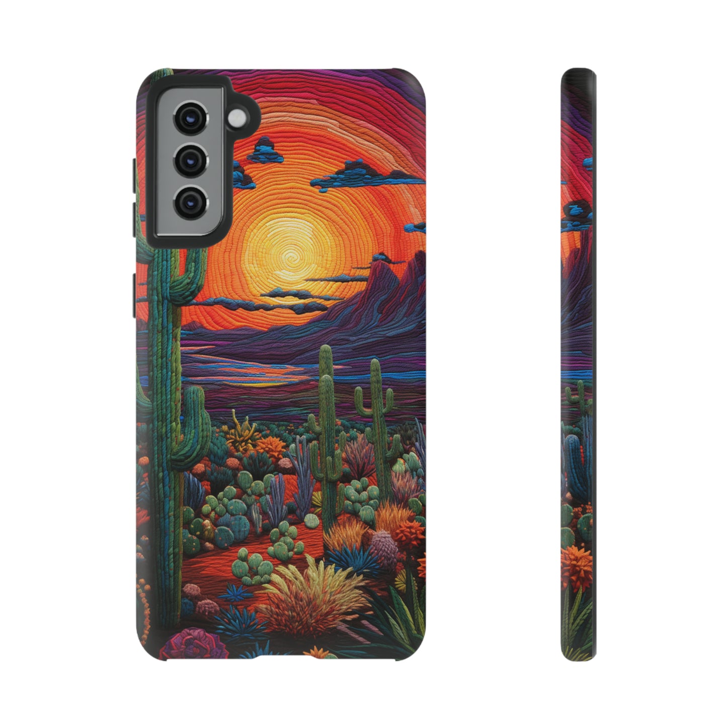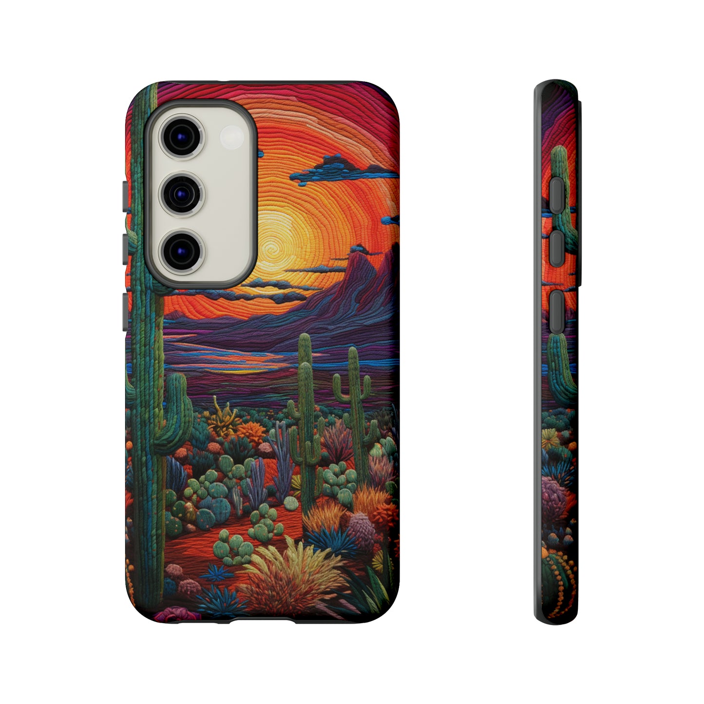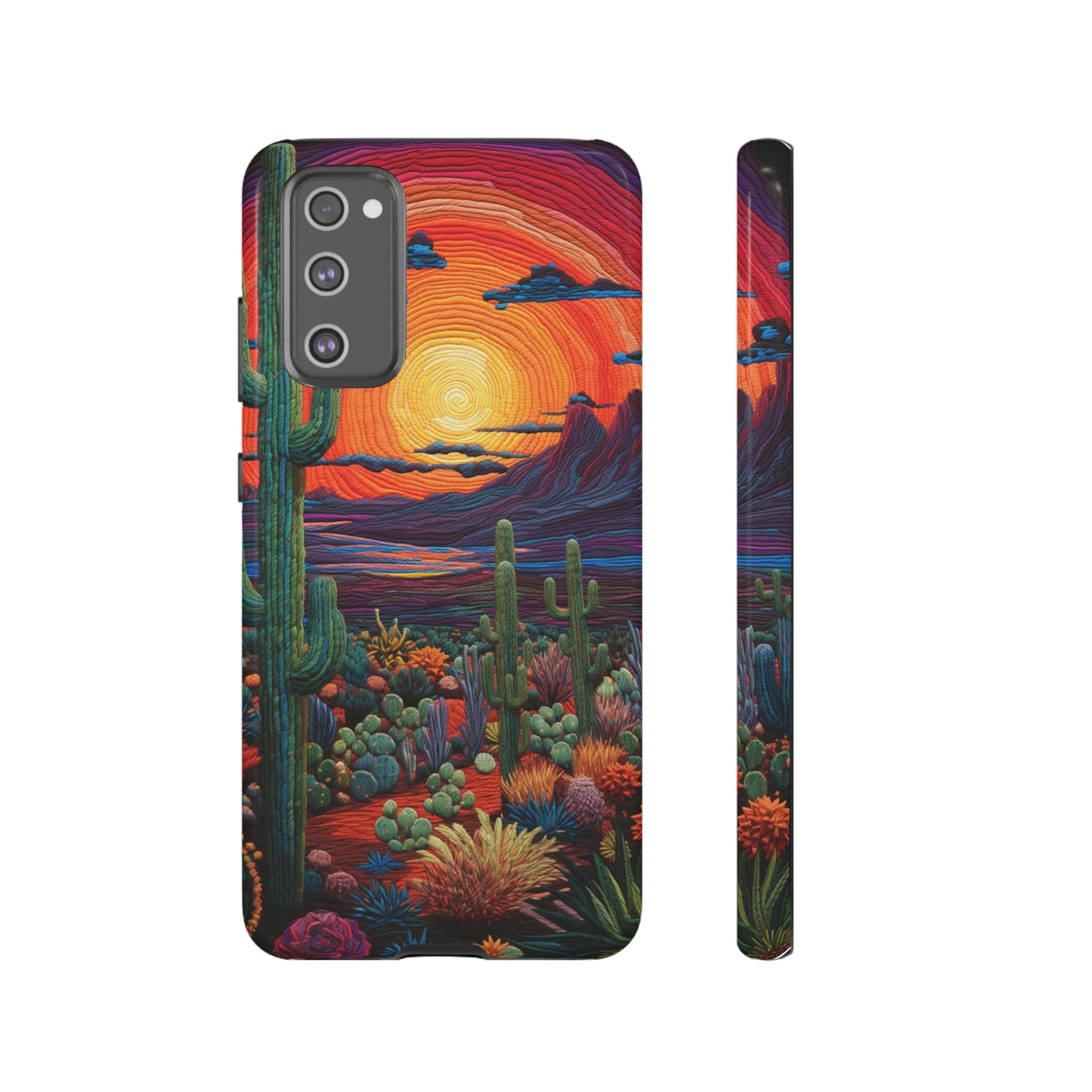 Capture the essence of the Southwest with our Cactus Desert Sunset iPhone Case, available in an exquisite embroidery style design. This unique case is compatible with a range of iPhone models including the iPhone 15, 15 Plus, 12 Mini, XR, XS Max, 8, and 7. Featuring a serene desert scene with cacti silhouetted against a stunning sunset, it embodies the spirit of Arizona's landscapes. Perfect for wanderlust enthusiasts and those who love the rugged beauty of the desert, this case not only adds a touch of Southwest charm to your device but also provides durable protection.