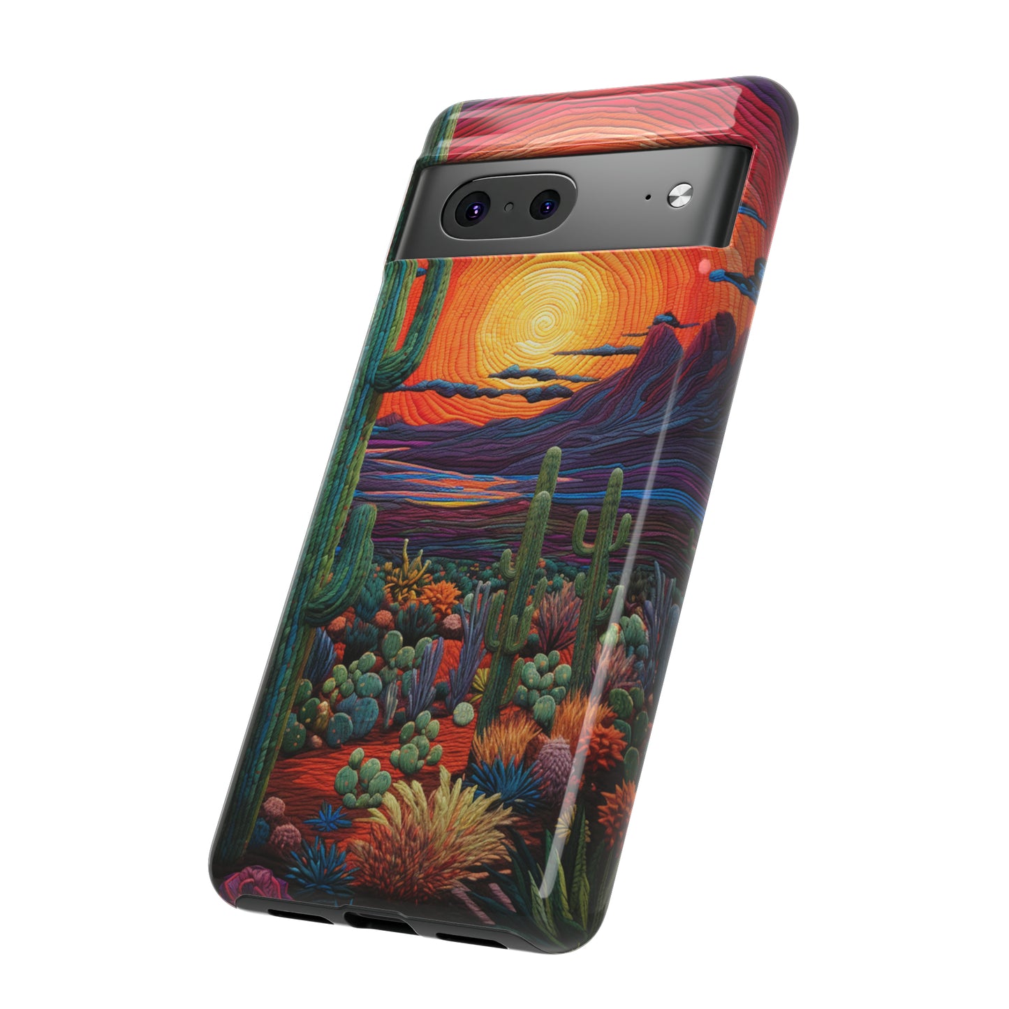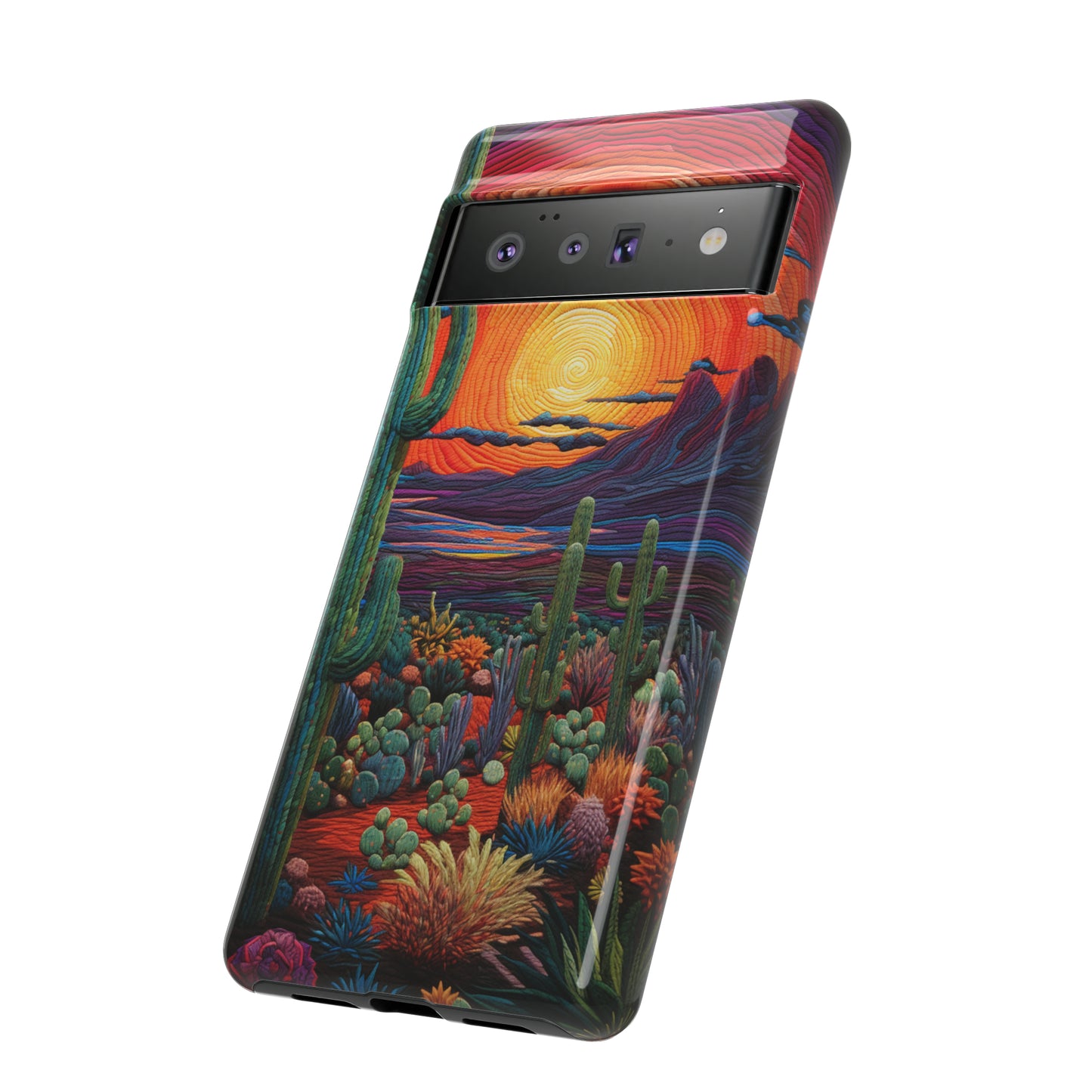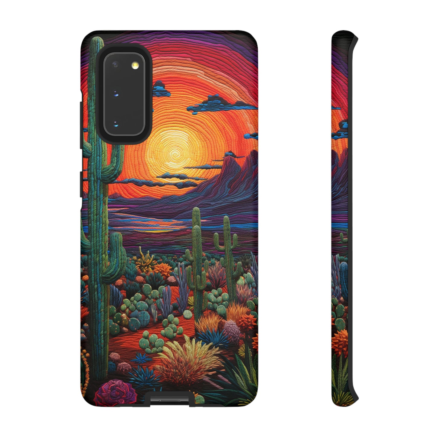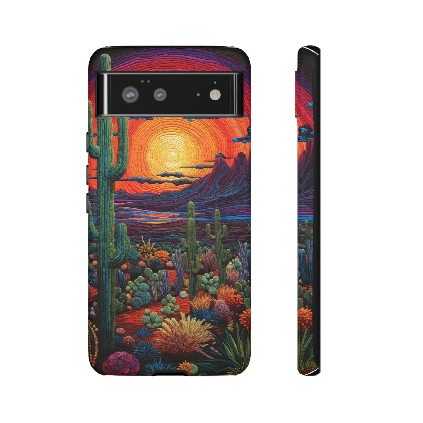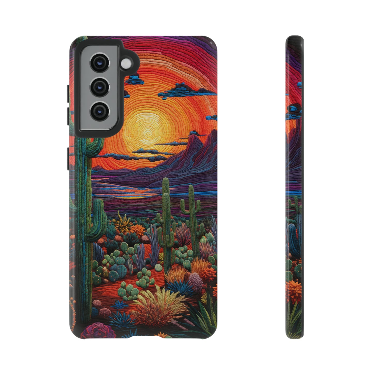 Capture the essence of the Southwest with our Cactus Desert Sunset iPhone Case, available in an exquisite embroidery style design. This unique case is compatible with a range of iPhone models including the iPhone 15, 15 Plus, 12 Mini, XR, XS Max, 8, and 7. Featuring a serene desert scene with cacti silhouetted against a stunning sunset, it embodies the spirit of Arizona's landscapes. Perfect for wanderlust enthusiasts and those who love the rugged beauty of the desert, this case not only adds a touch of Southwest charm to your device but also provides durable protection.