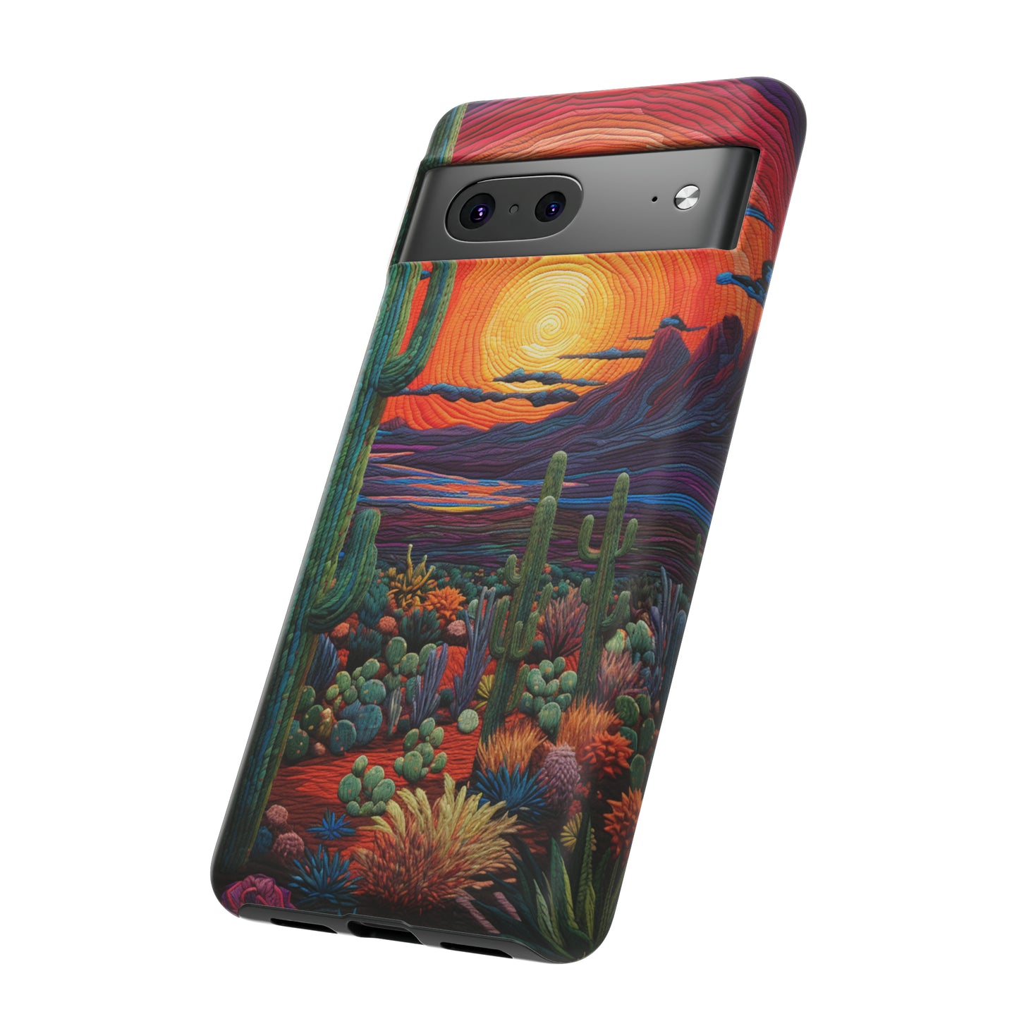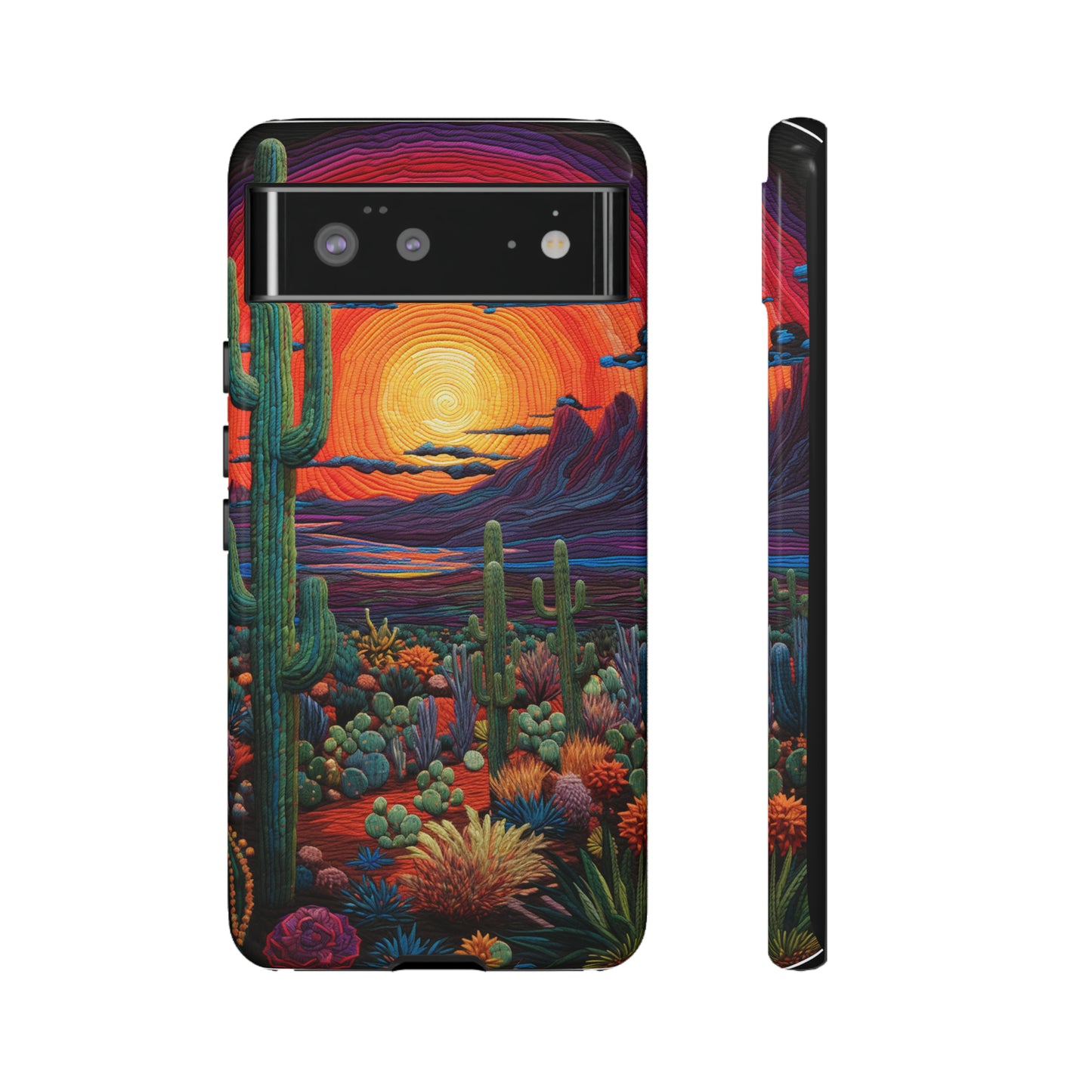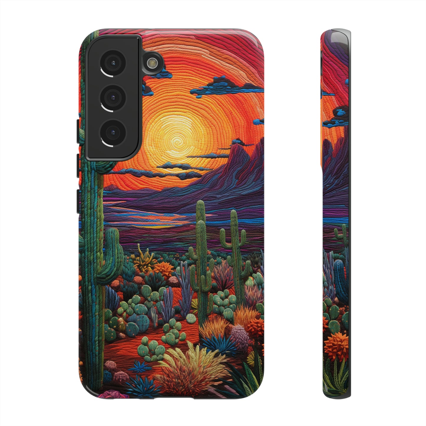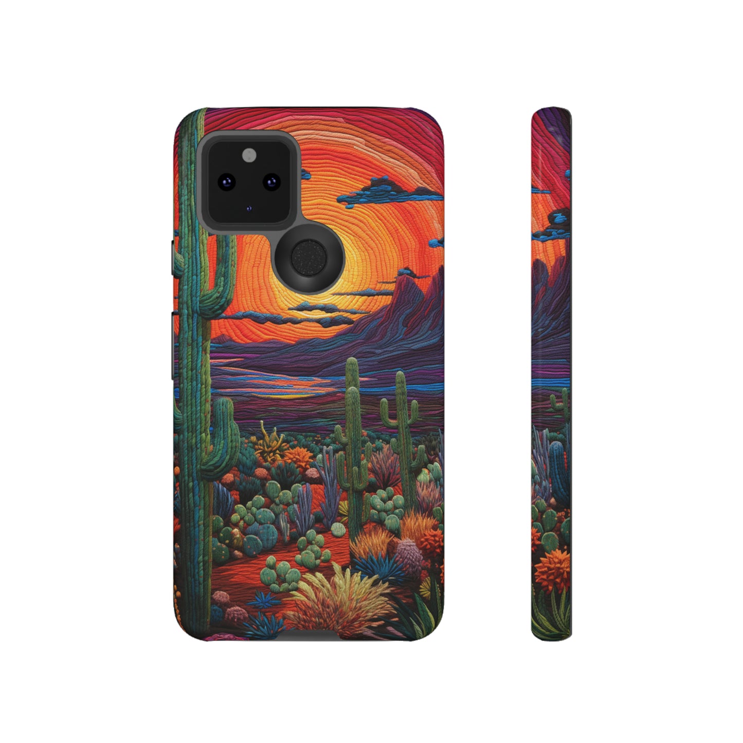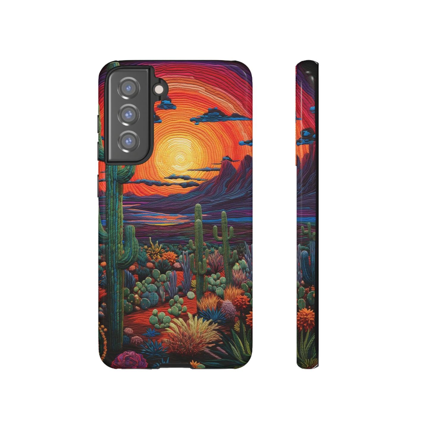 Capture the essence of the Southwest with our Cactus Desert Sunset iPhone Case, available in an exquisite embroidery style design. This unique case is compatible with a range of iPhone models including the iPhone 15, 15 Plus, 12 Mini, XR, XS Max, 8, and 7. Featuring a serene desert scene with cacti silhouetted against a stunning sunset, it embodies the spirit of Arizona's landscapes. Perfect for wanderlust enthusiasts and those who love the rugged beauty of the desert, this case not only adds a touch of Southwest charm to your device but also provides durable protection.
