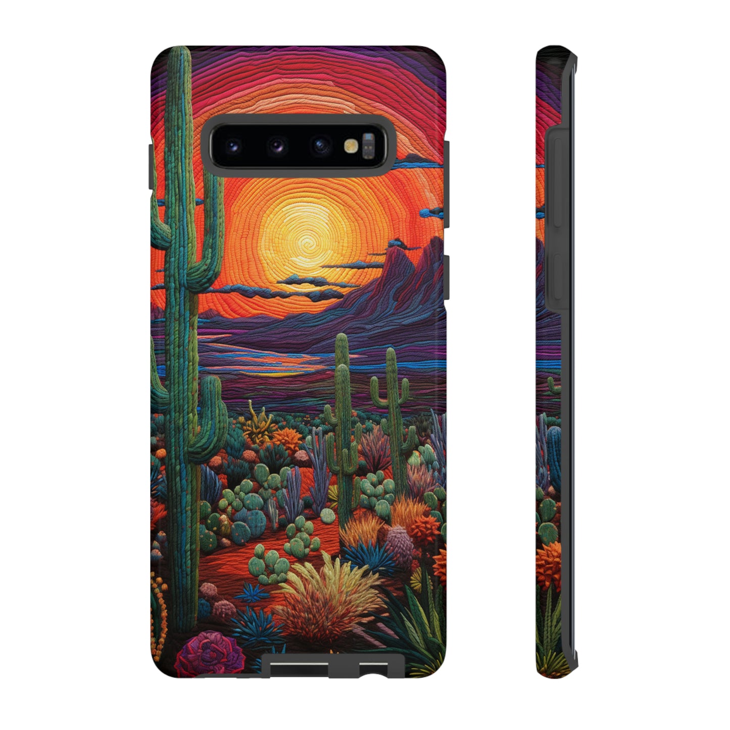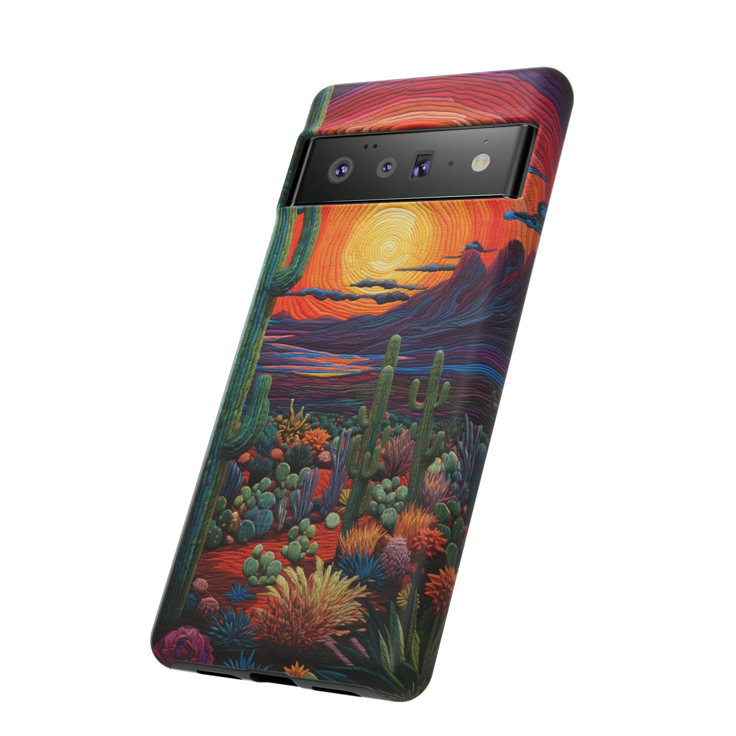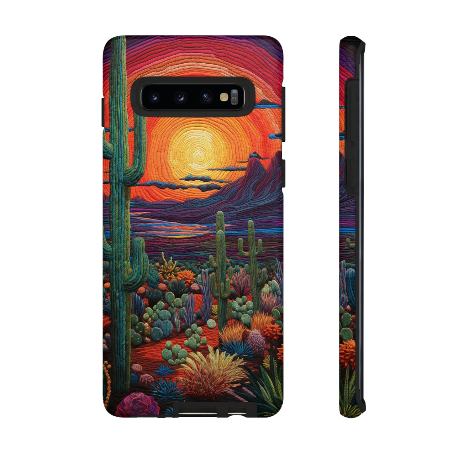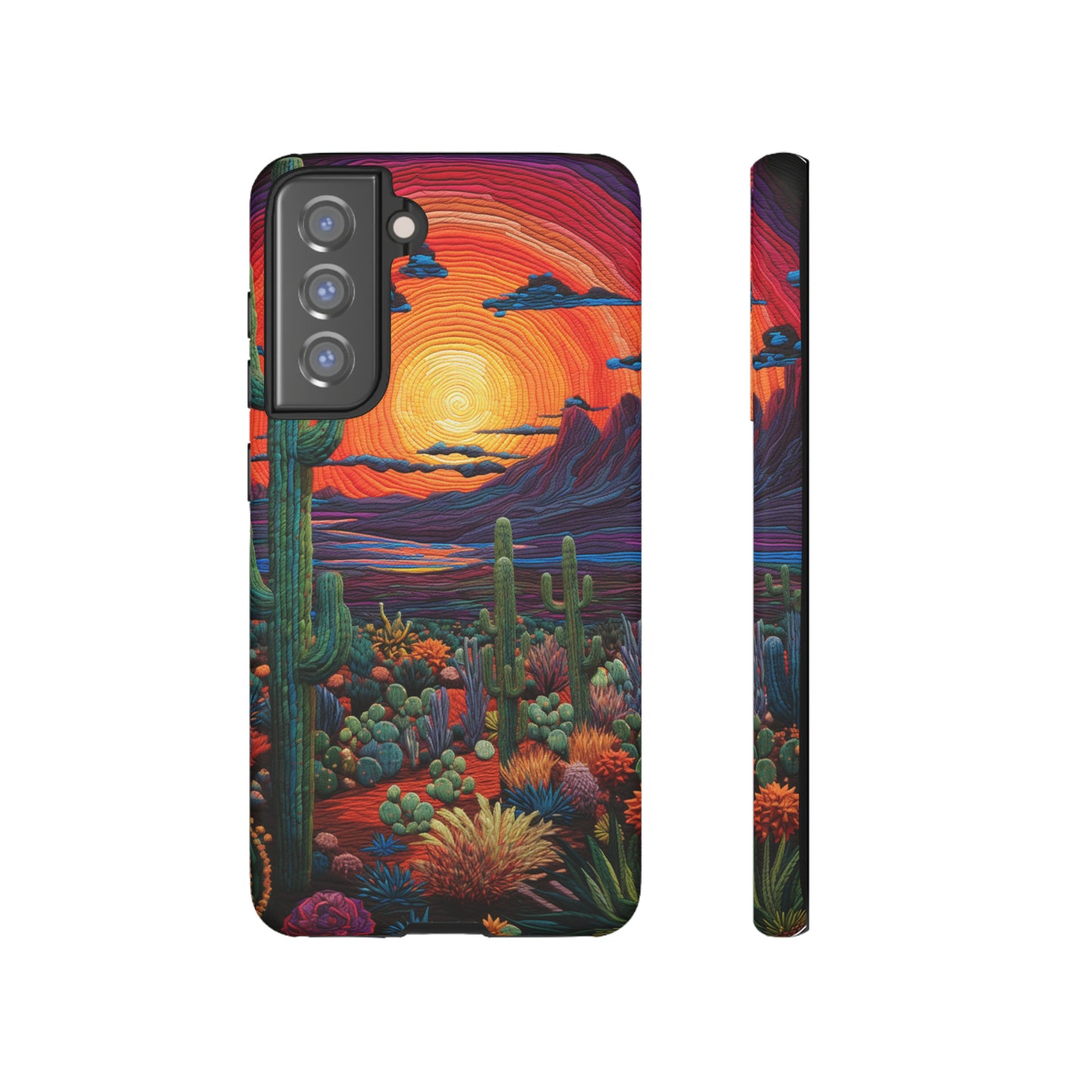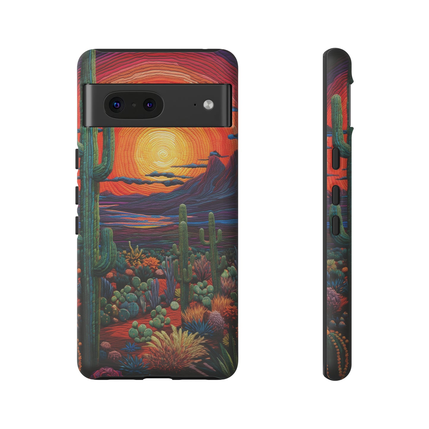Capture the essence of the Southwest with our Cactus Desert Sunset iPhone Case, available in an exquisite embroidery style design. This unique case is compatible with a range of iPhone models including the iPhone 15, 15 Plus, 12 Mini, XR, XS Max, 8, and 7. Featuring a serene desert scene with cacti silhouetted against a stunning sunset, it embodies the spirit of Arizona's landscapes. Perfect for wanderlust enthusiasts and those who love the rugged beauty of the desert, this case not only adds a touch of Southwest charm to your device but also provides durable protection.