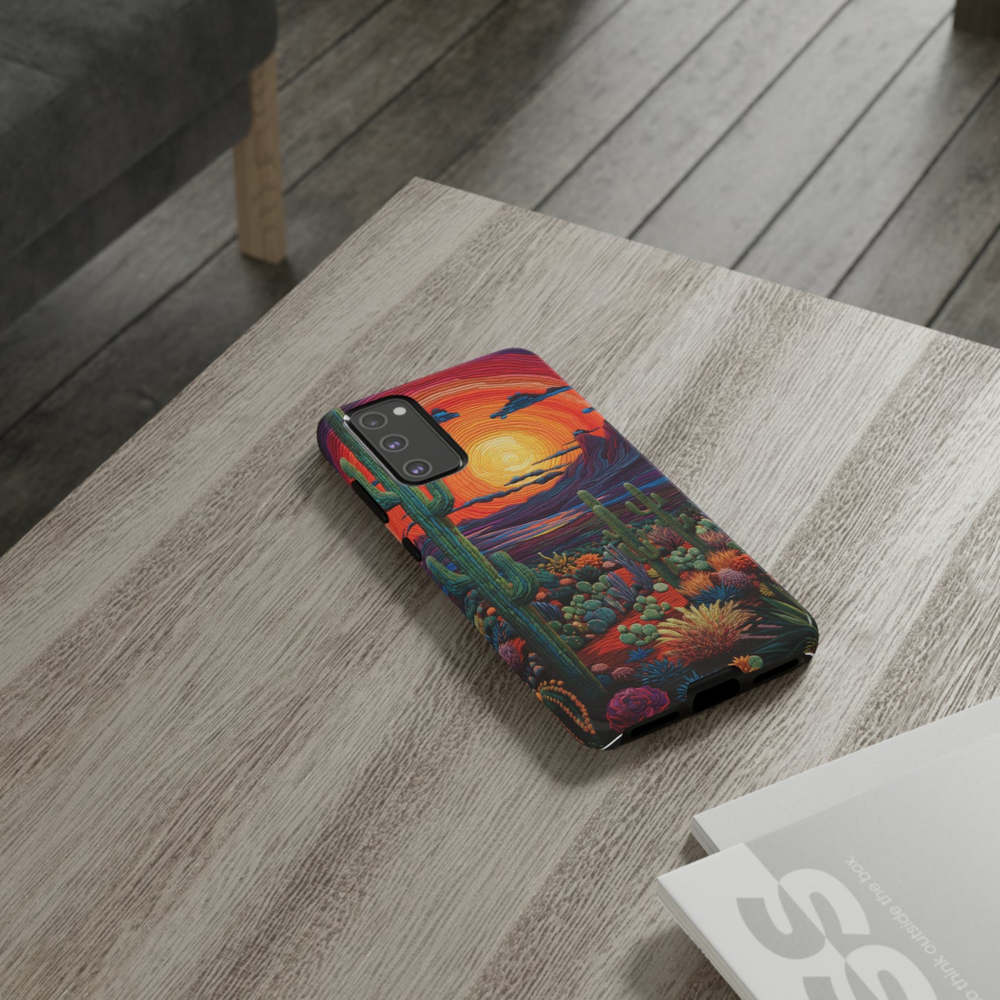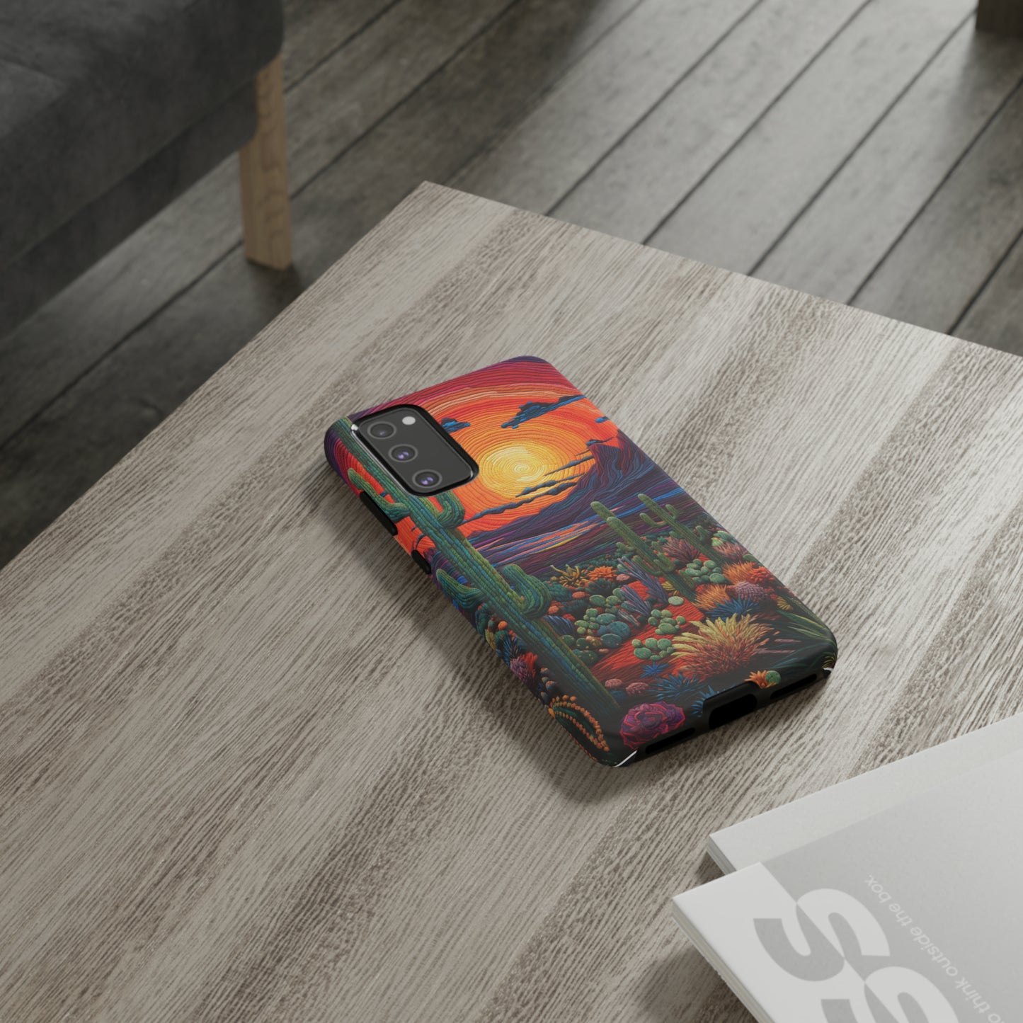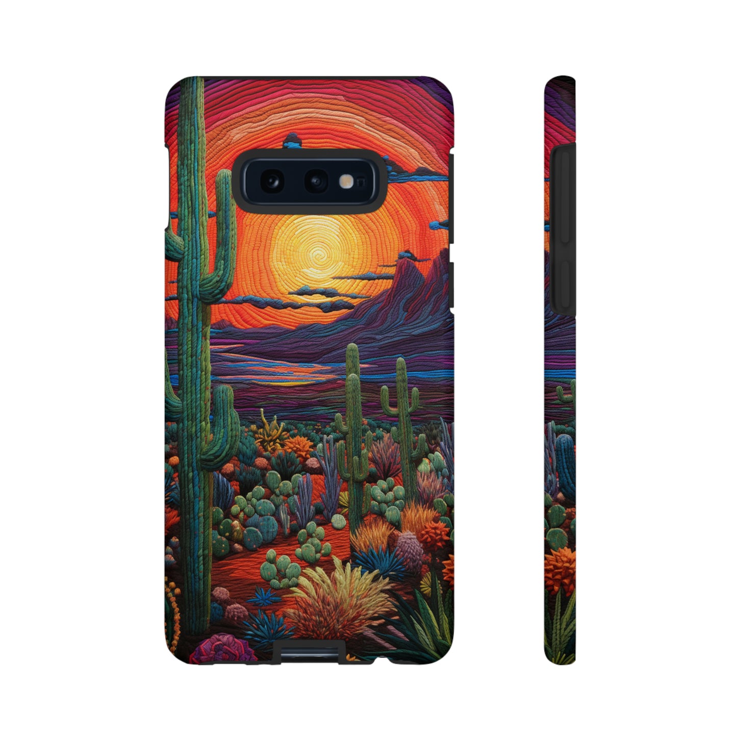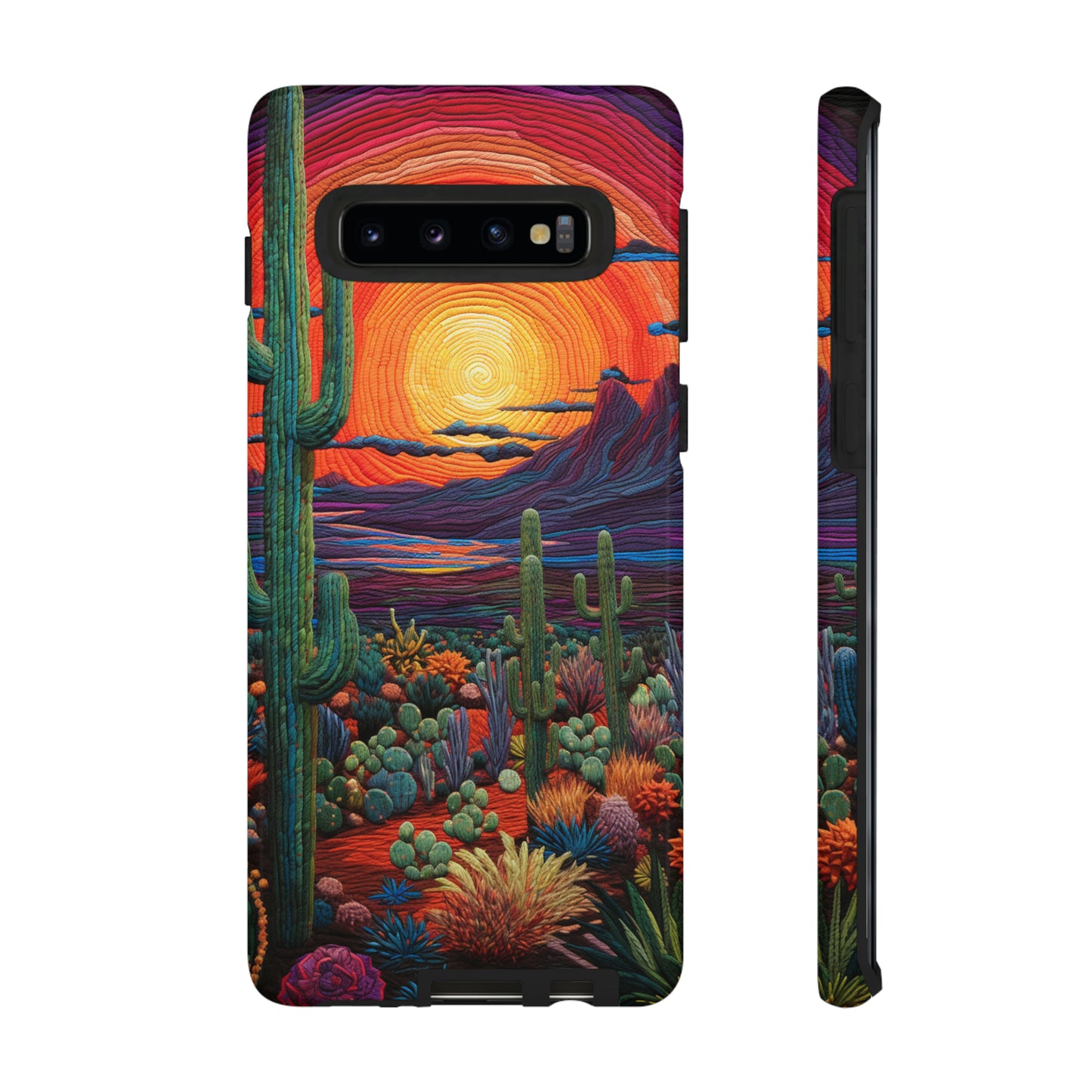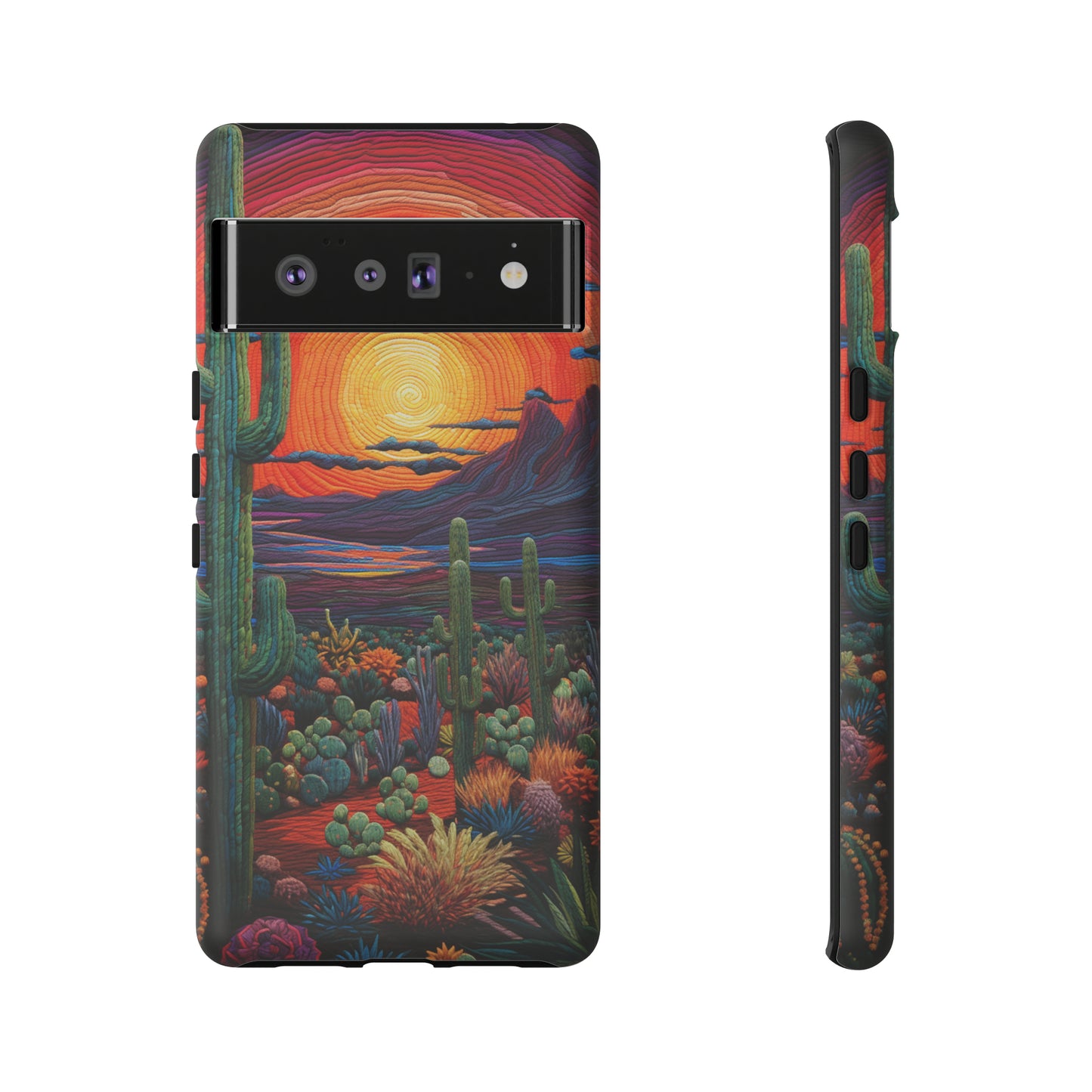 Capture the essence of the Southwest with our Cactus Desert Sunset iPhone Case, available in an exquisite embroidery style design. This unique case is compatible with a range of iPhone models including the iPhone 15, 15 Plus, 12 Mini, XR, XS Max, 8, and 7. Featuring a serene desert scene with cacti silhouetted against a stunning sunset, it embodies the spirit of Arizona's landscapes. Perfect for wanderlust enthusiasts and those who love the rugged beauty of the desert, this case not only adds a touch of Southwest charm to your device but also provides durable protection.