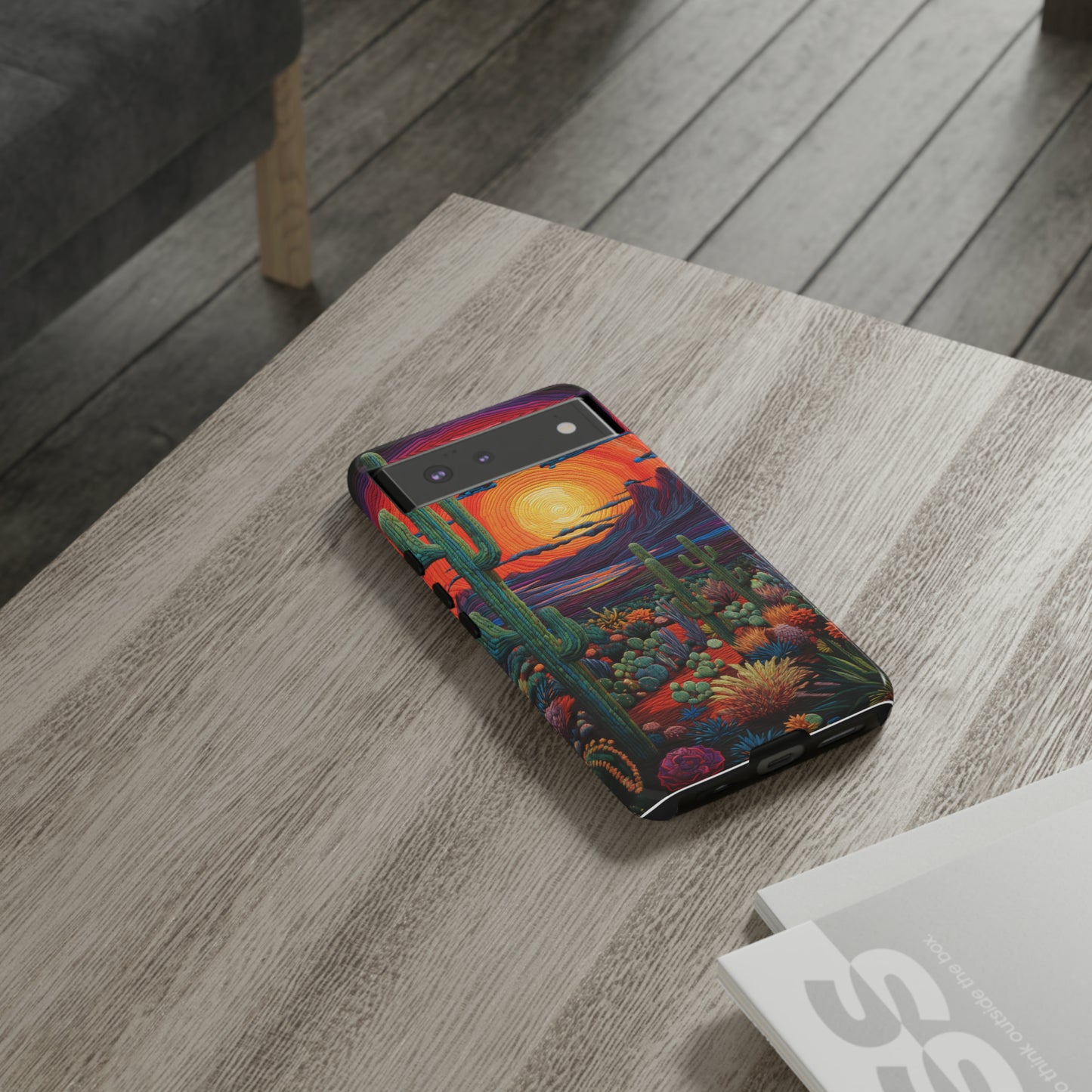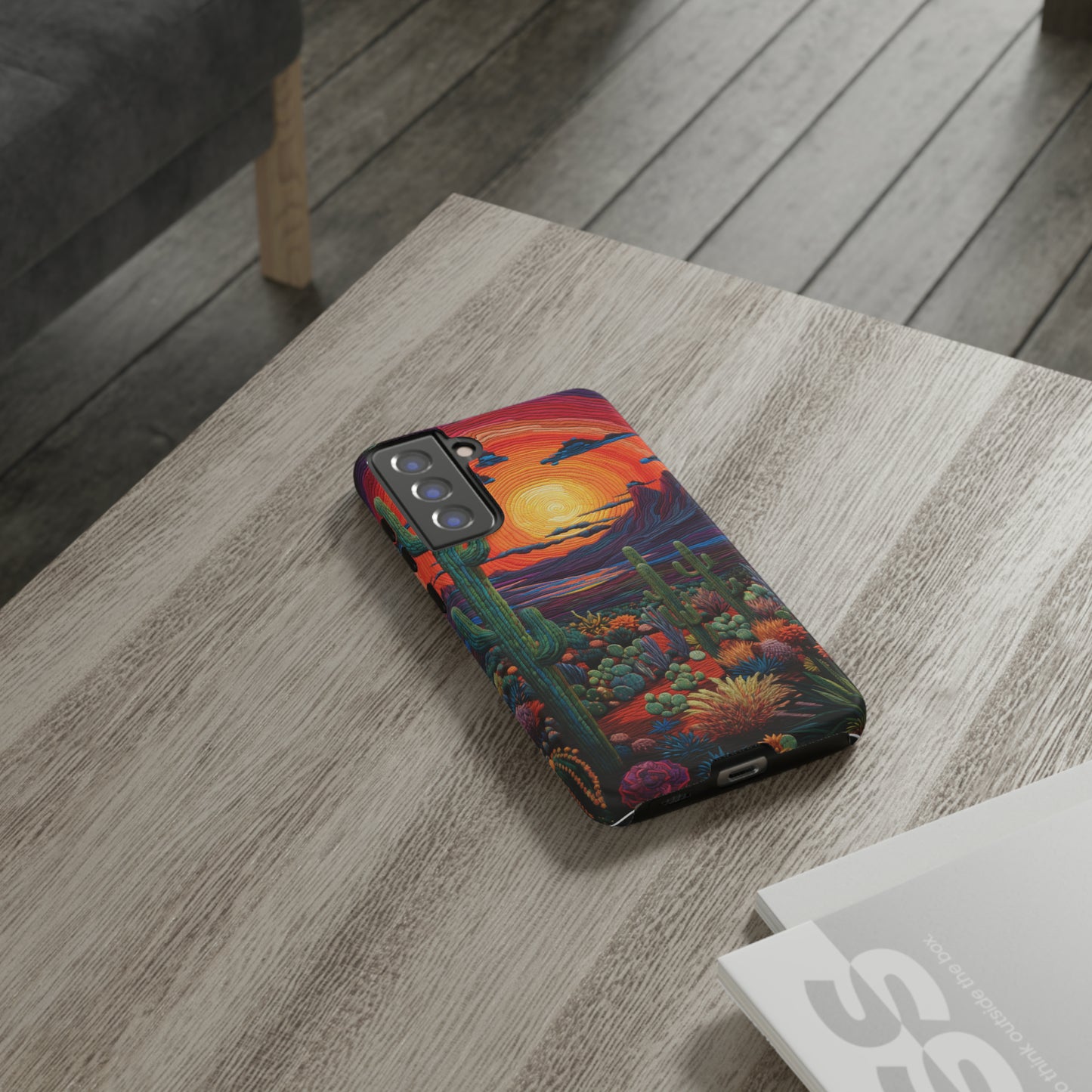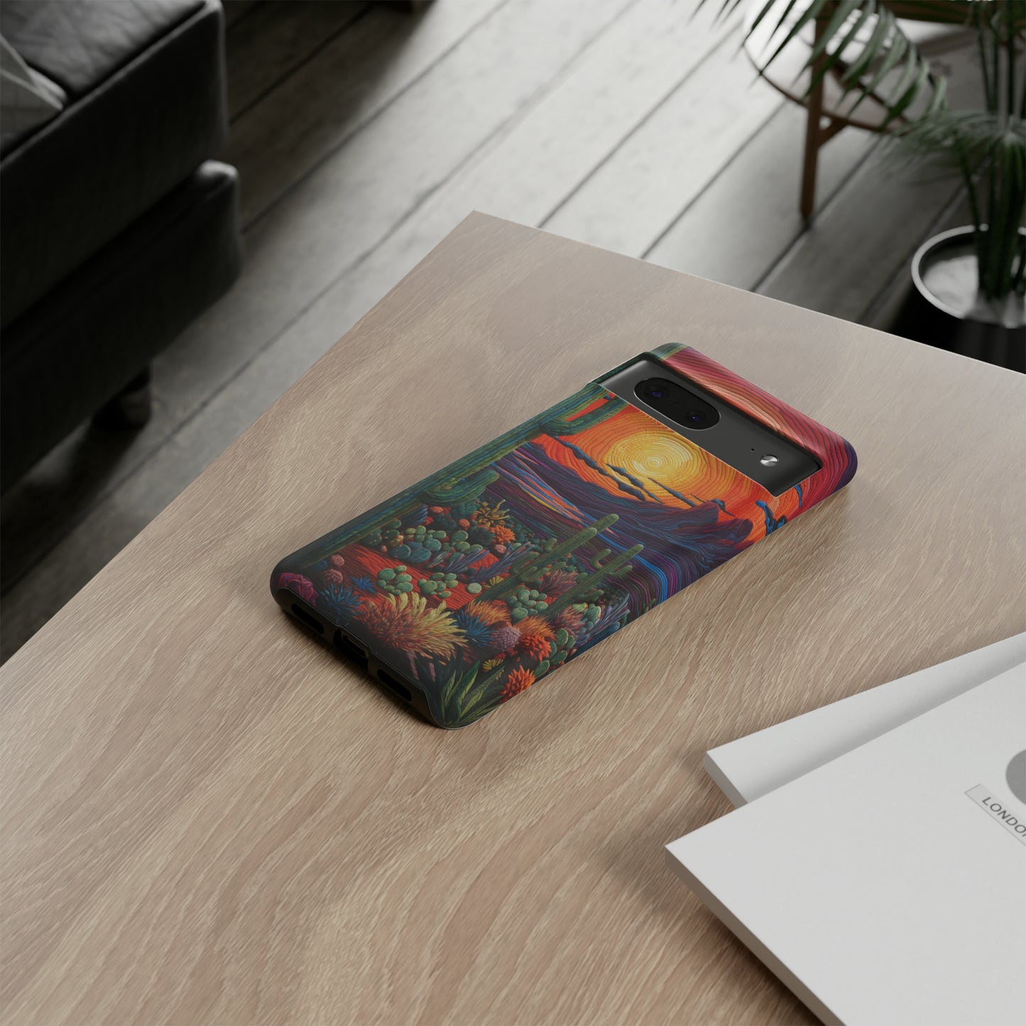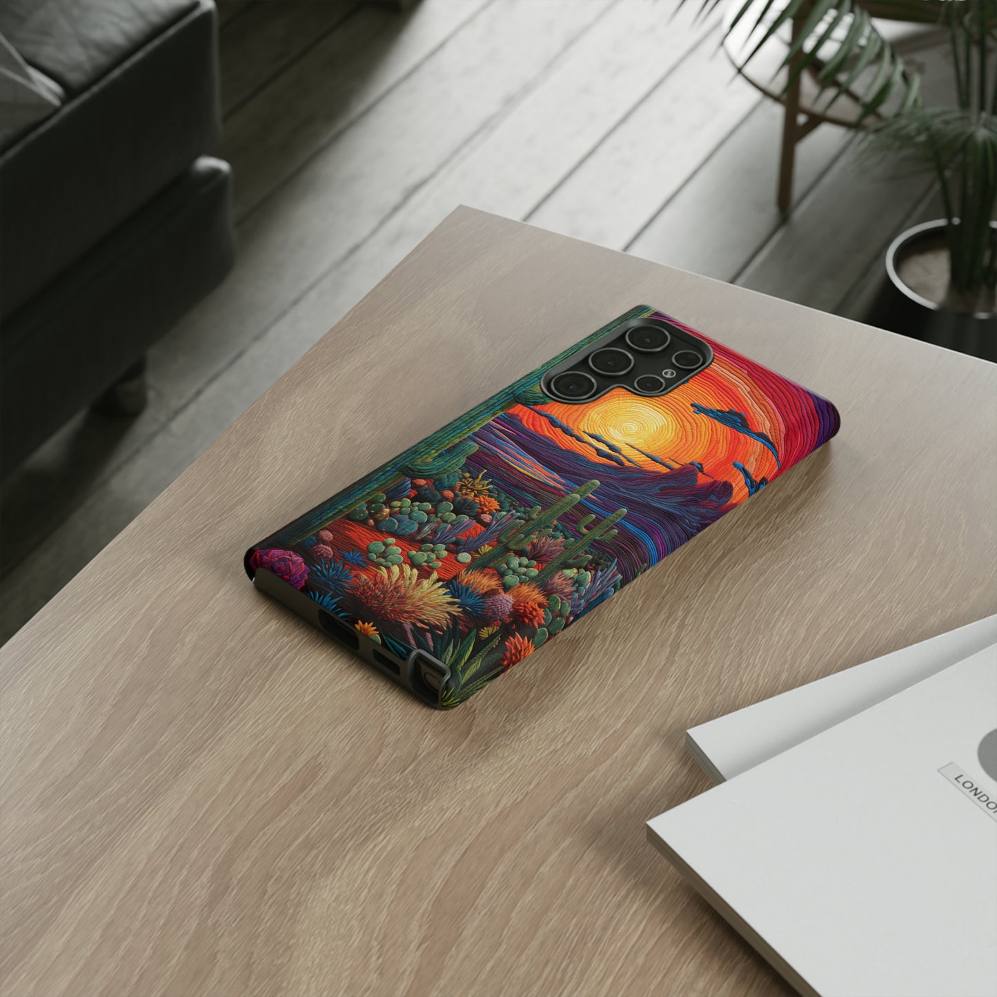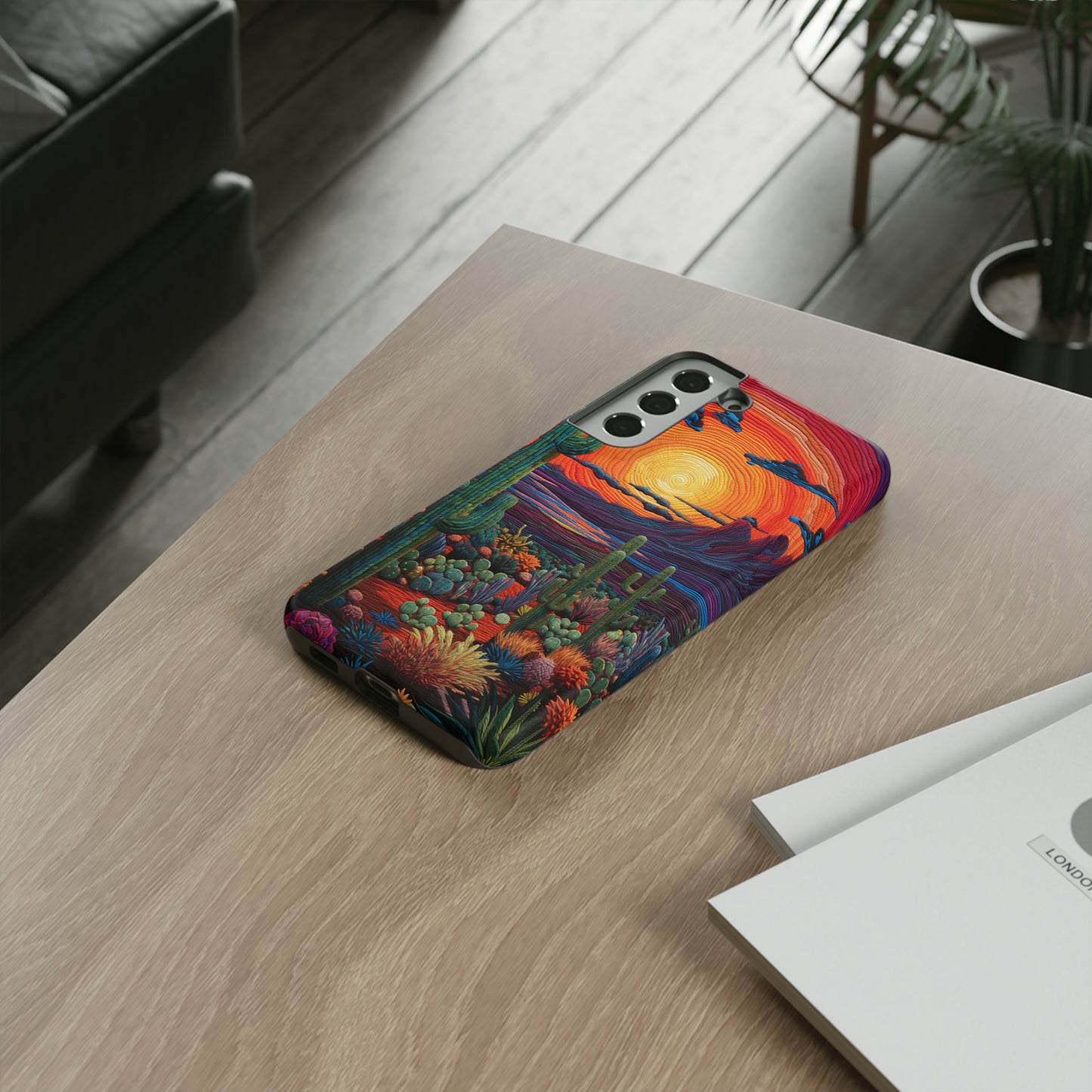 Capture the essence of the Southwest with our Cactus Desert Sunset iPhone Case, available in an exquisite embroidery style design. This unique case is compatible with a range of iPhone models including the iPhone 15, 15 Plus, 12 Mini, XR, XS Max, 8, and 7. Featuring a serene desert scene with cacti silhouetted against a stunning sunset, it embodies the spirit of Arizona's landscapes. Perfect for wanderlust enthusiasts and those who love the rugged beauty of the desert, this case not only adds a touch of Southwest charm to your device but also provides durable protection.