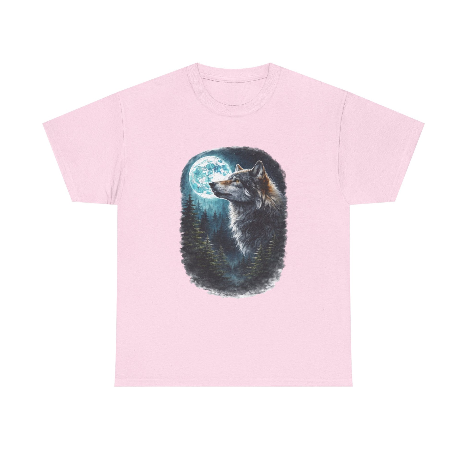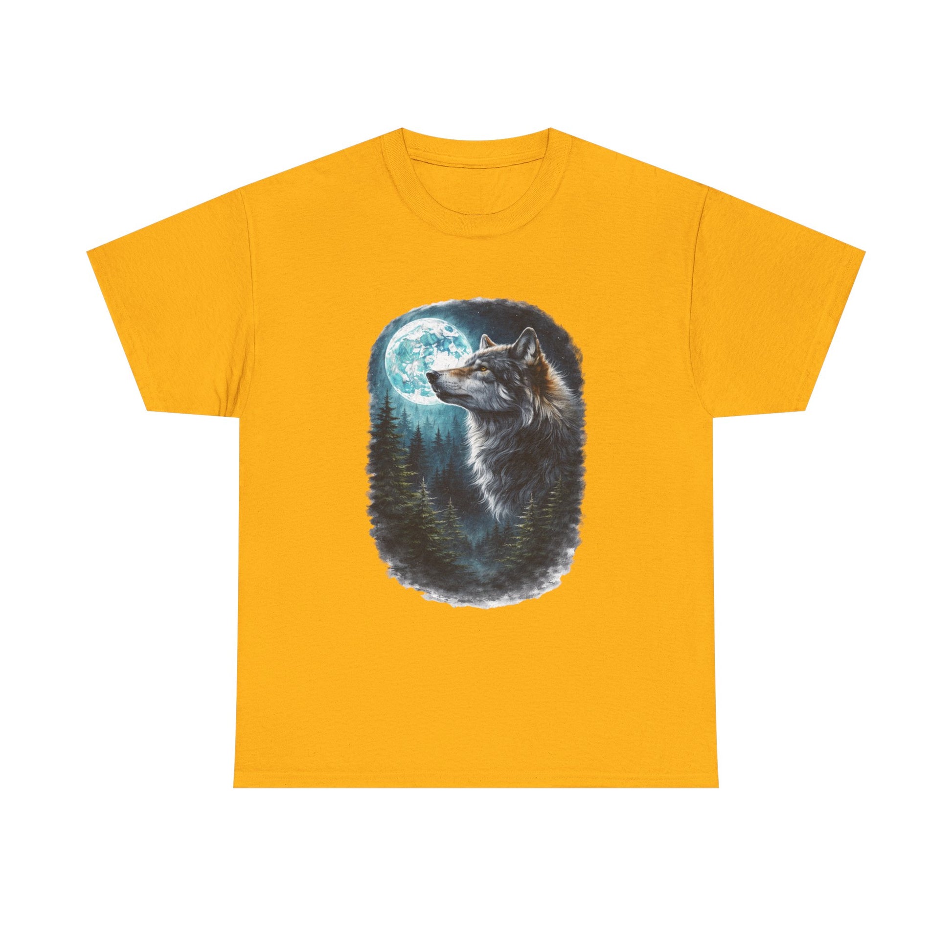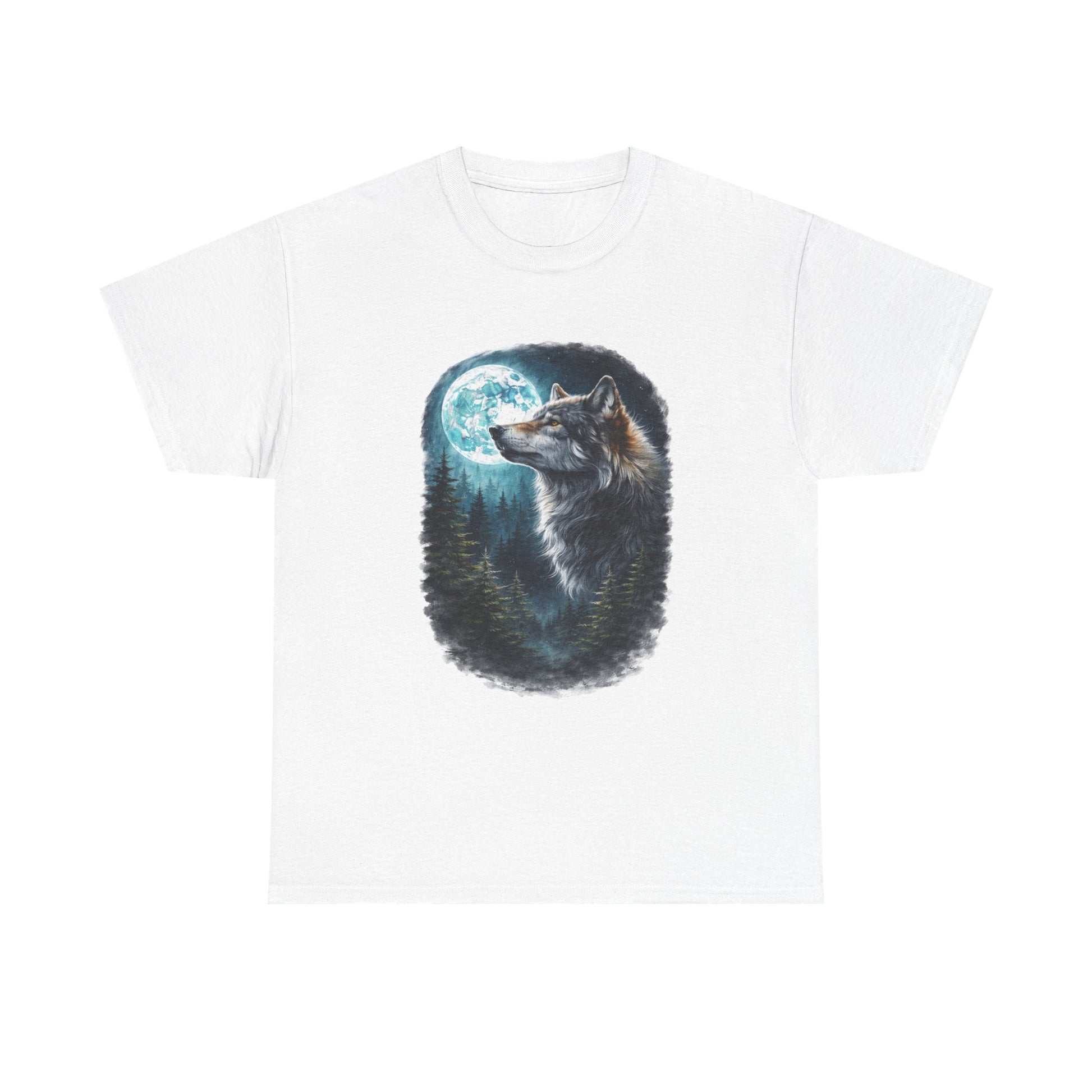 A classic t-shirt featuring a wolf beneath the moon, inspired by myth, wilderness, and timeless fantasy symbolism.