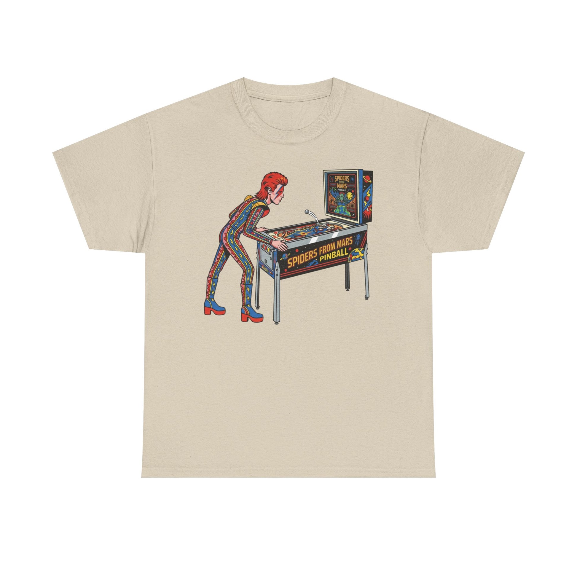 Inspired by the era when music went cosmic and arcades ruled the night, this design features a spacefaring, glam-inspired alien locked into a glowing pinball machine. It captures the energy of retro futurism, theatrical style, and old-school arcade obsession—without referencing any specific artist or character.