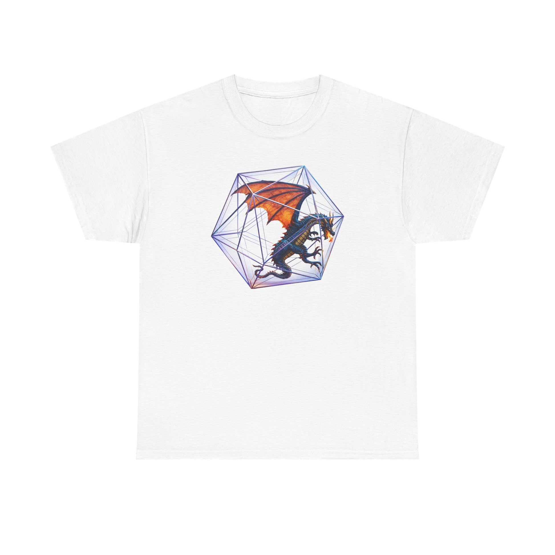 A fantasy tabletop RPG t-shirt featuring a D20 die and hatchling dragon inspired by dice rolling, epic quests, and imagination.