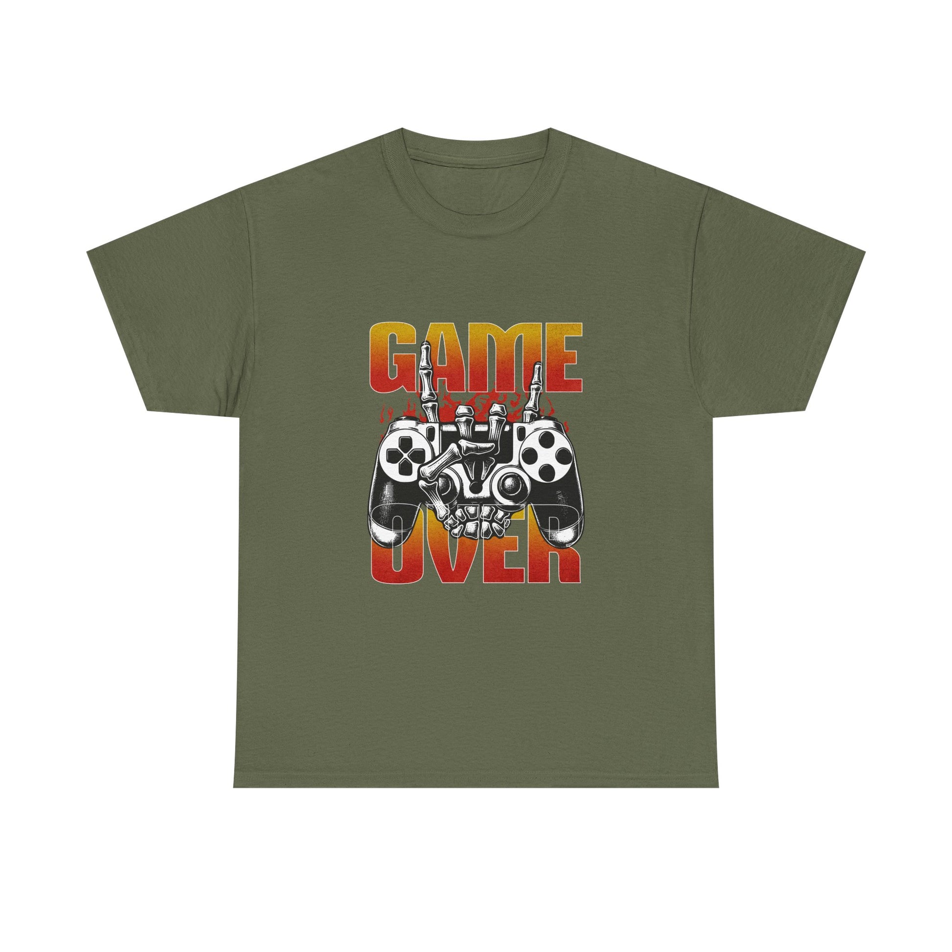 A dark humor arcade gaming t-shirt featuring a skeleton hand and “Game Over” message inspired by classic arcade culture.