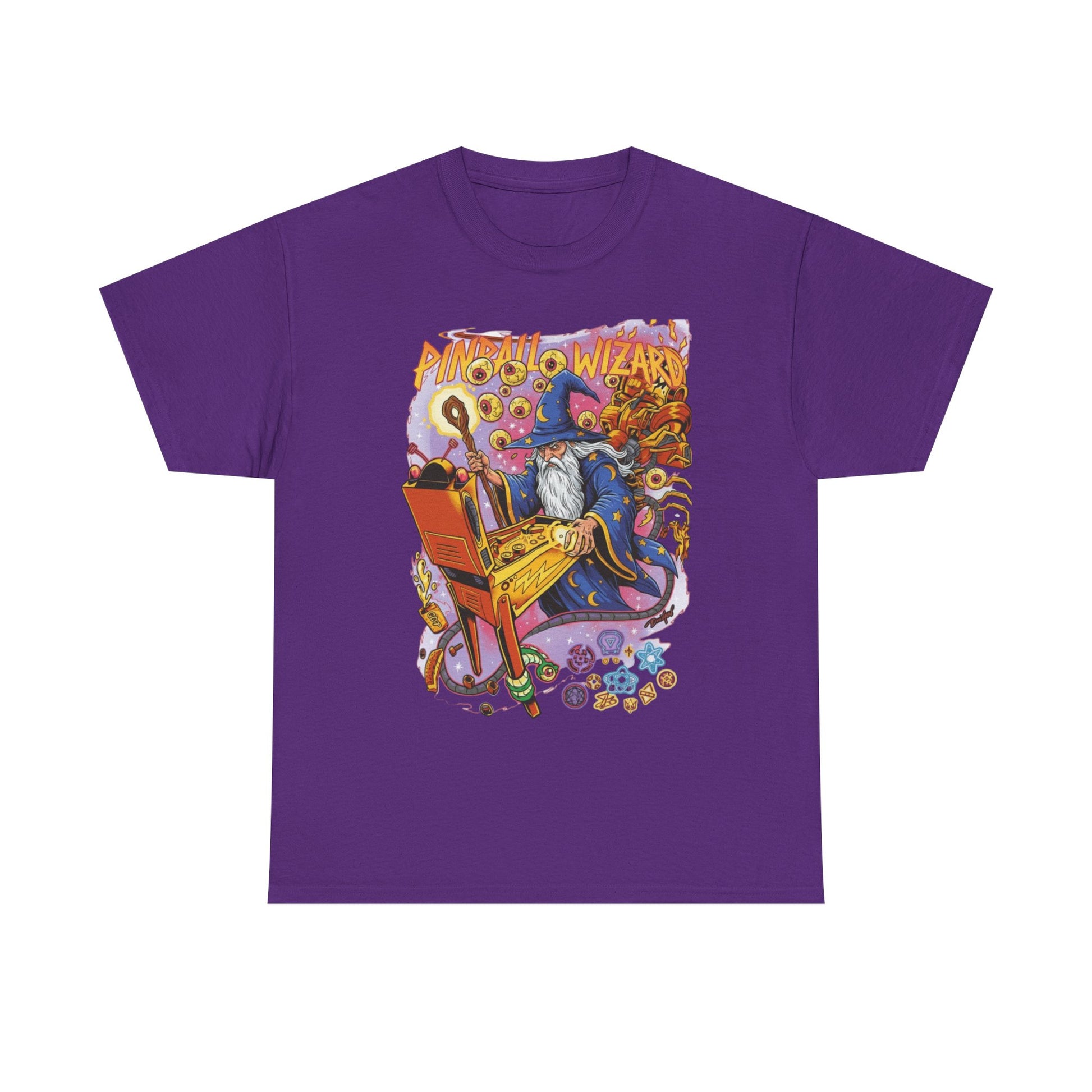 A retro arcade t-shirt featuring a pinball-playing wizard inspired by classic pinball machines and vintage arcade culture.