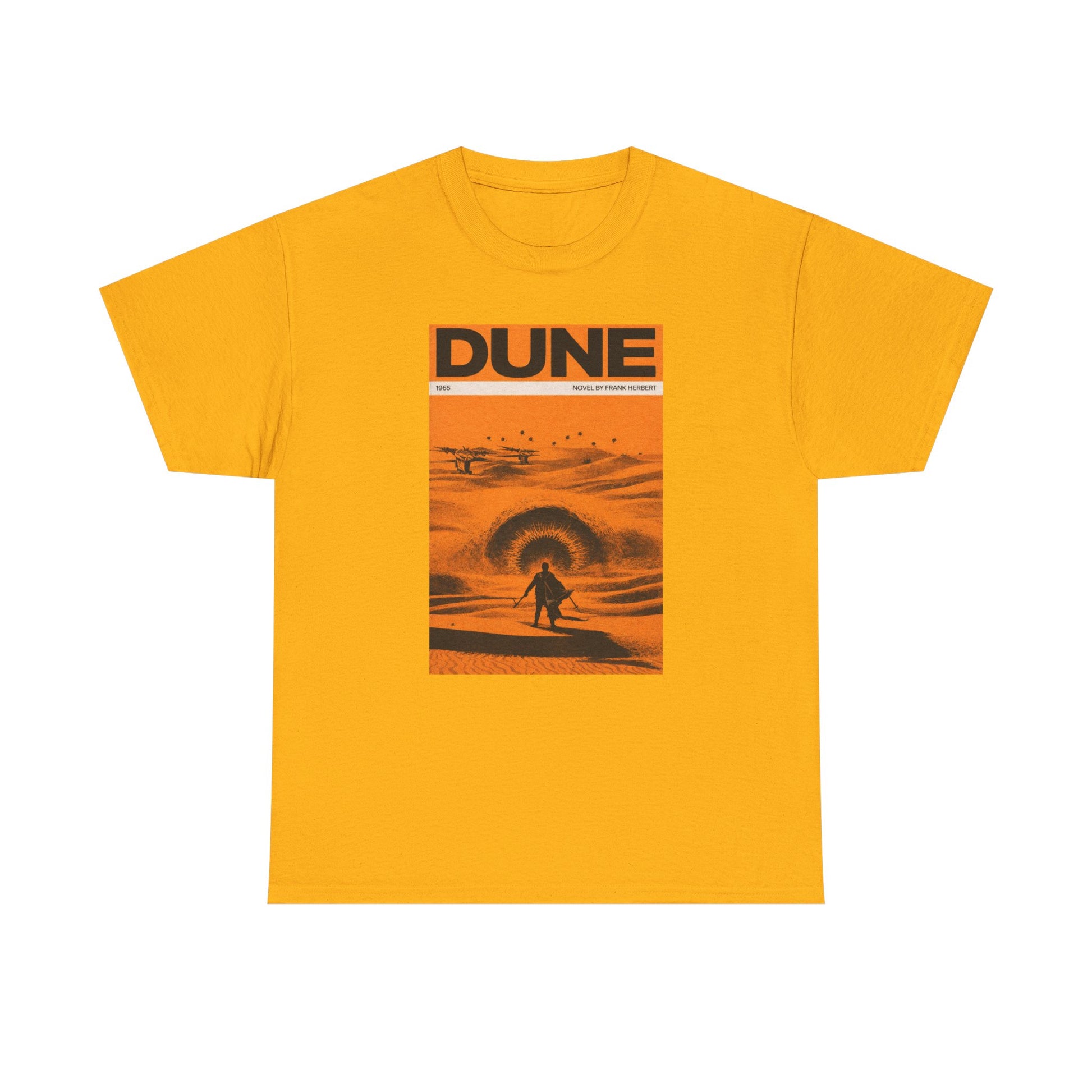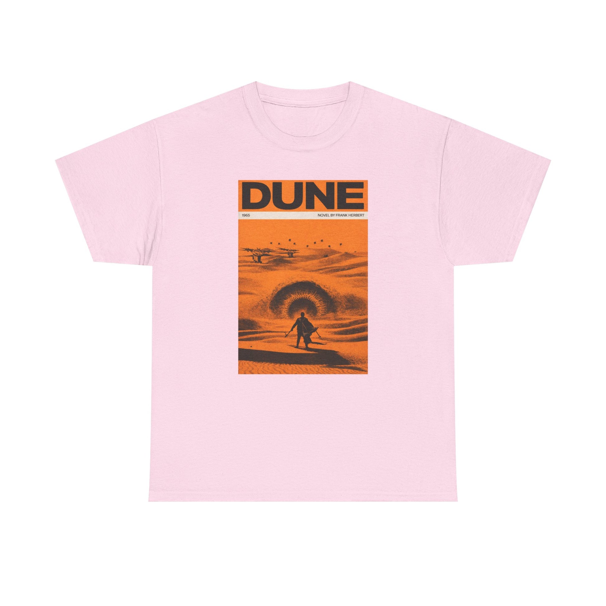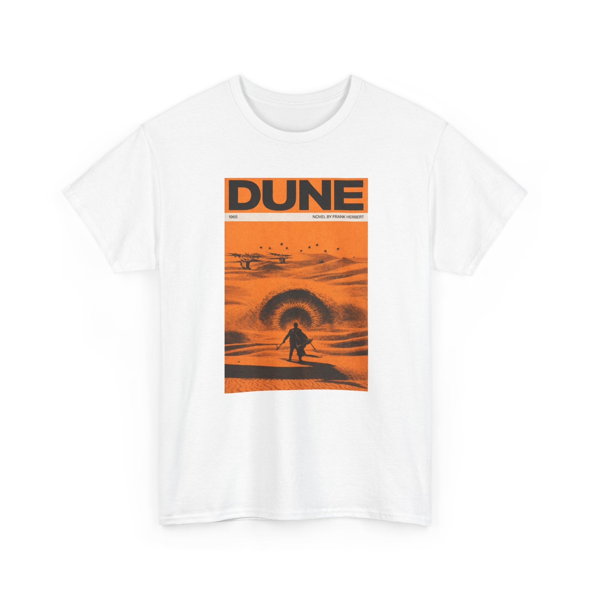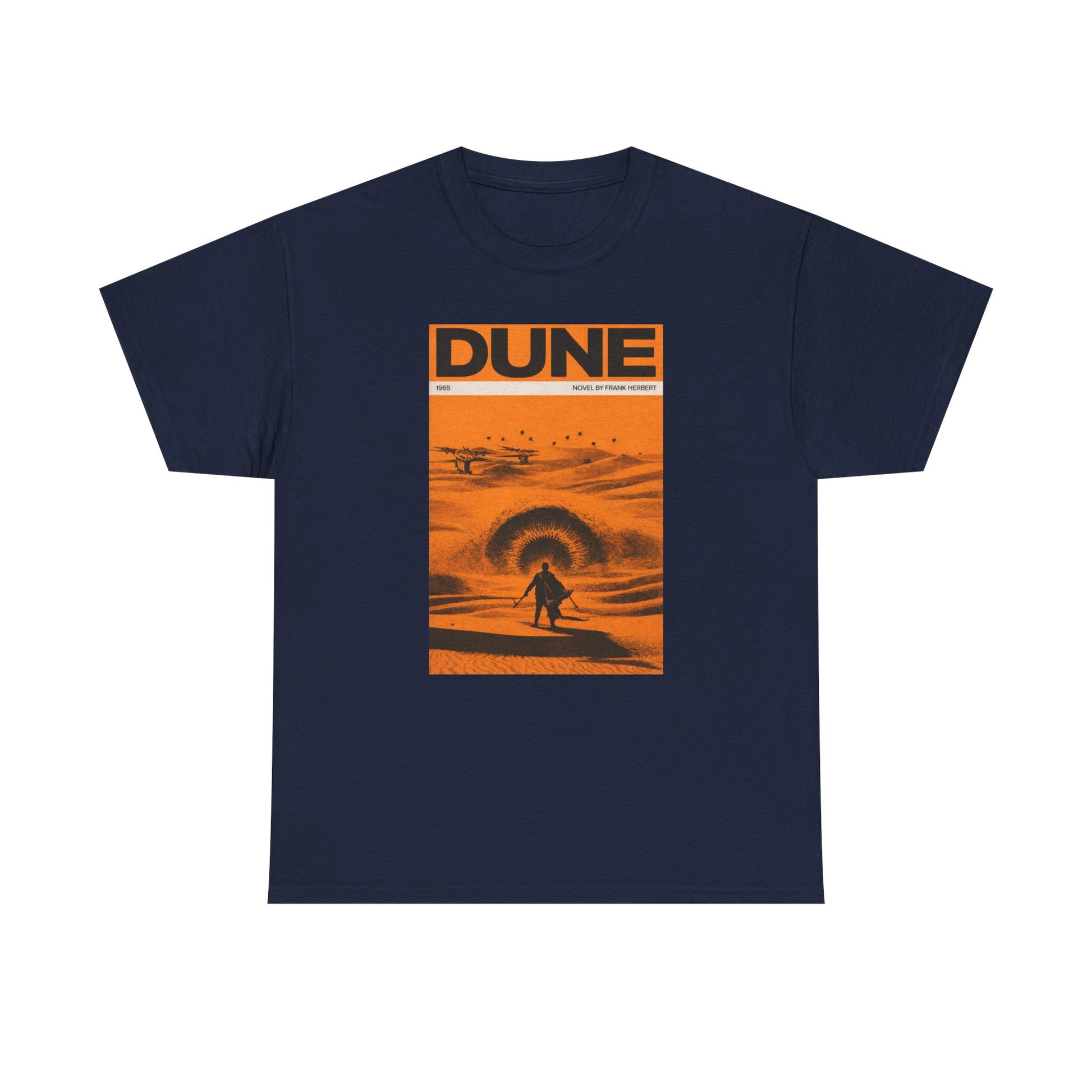 A retro sci-fi t-shirt inspired by classic desert science fiction book cover art and epic space storytelling.