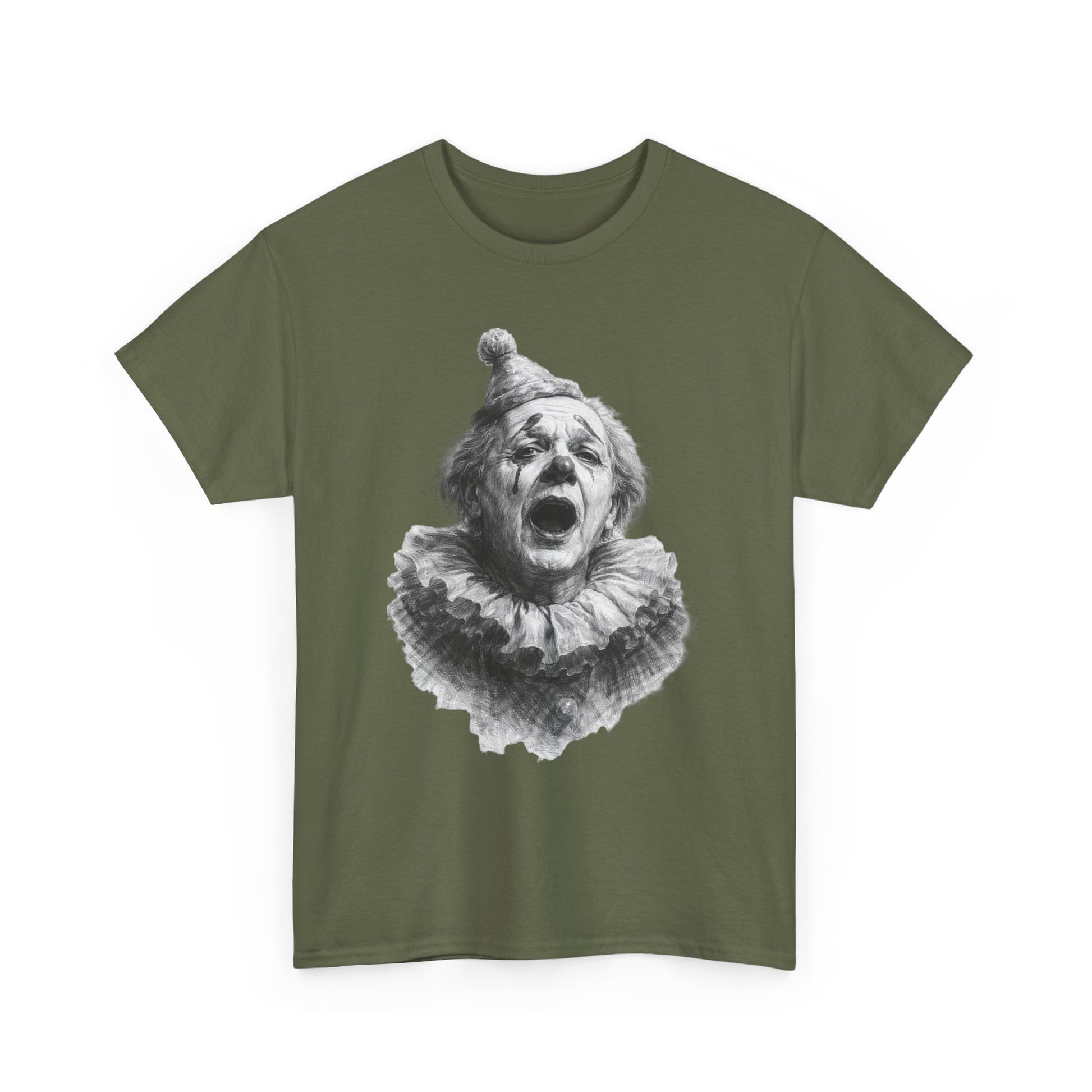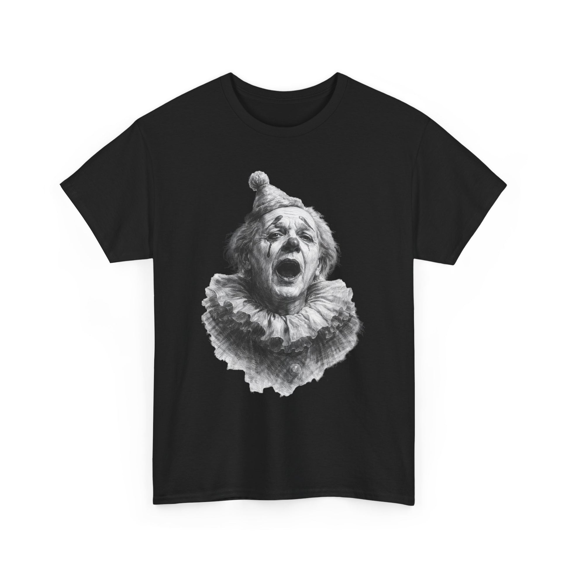 A vintage art t-shirt featuring a sad clown opera singer inspired by classic Italian theater, emotion, and dramatic performance.